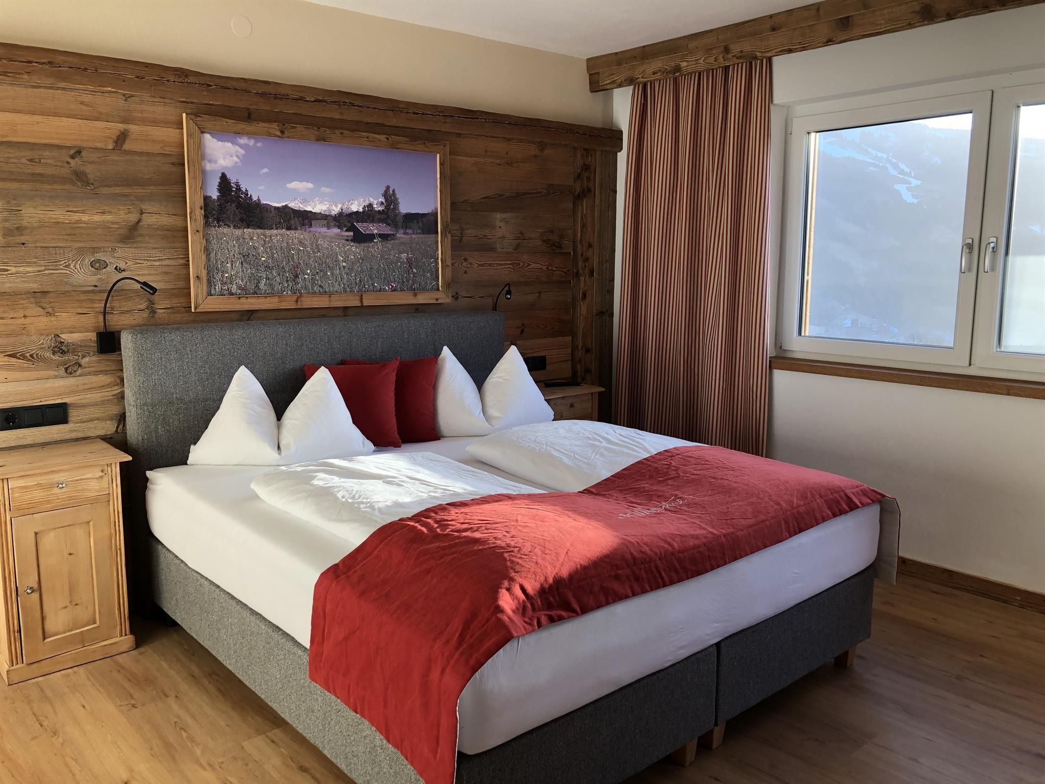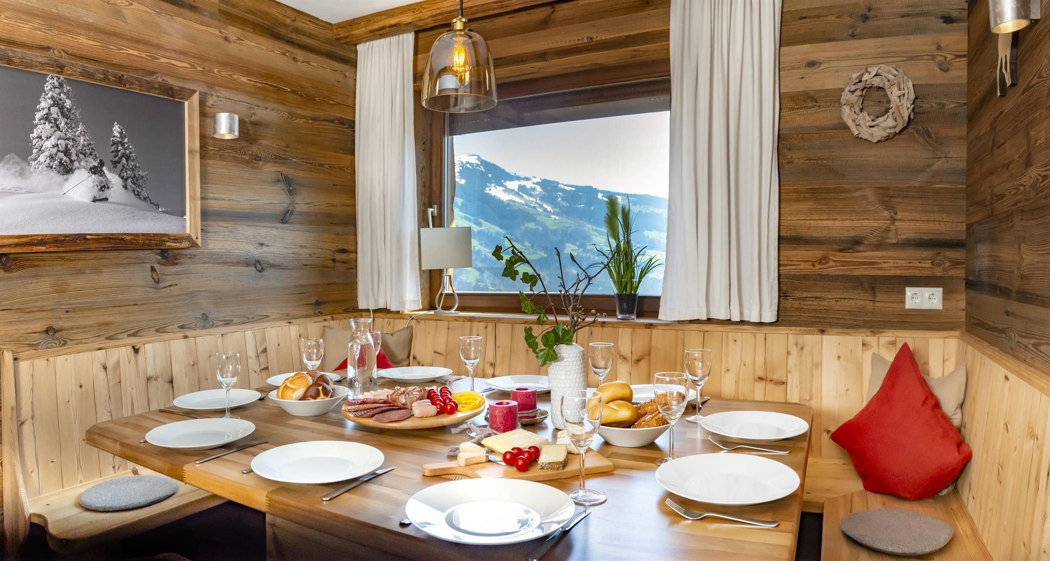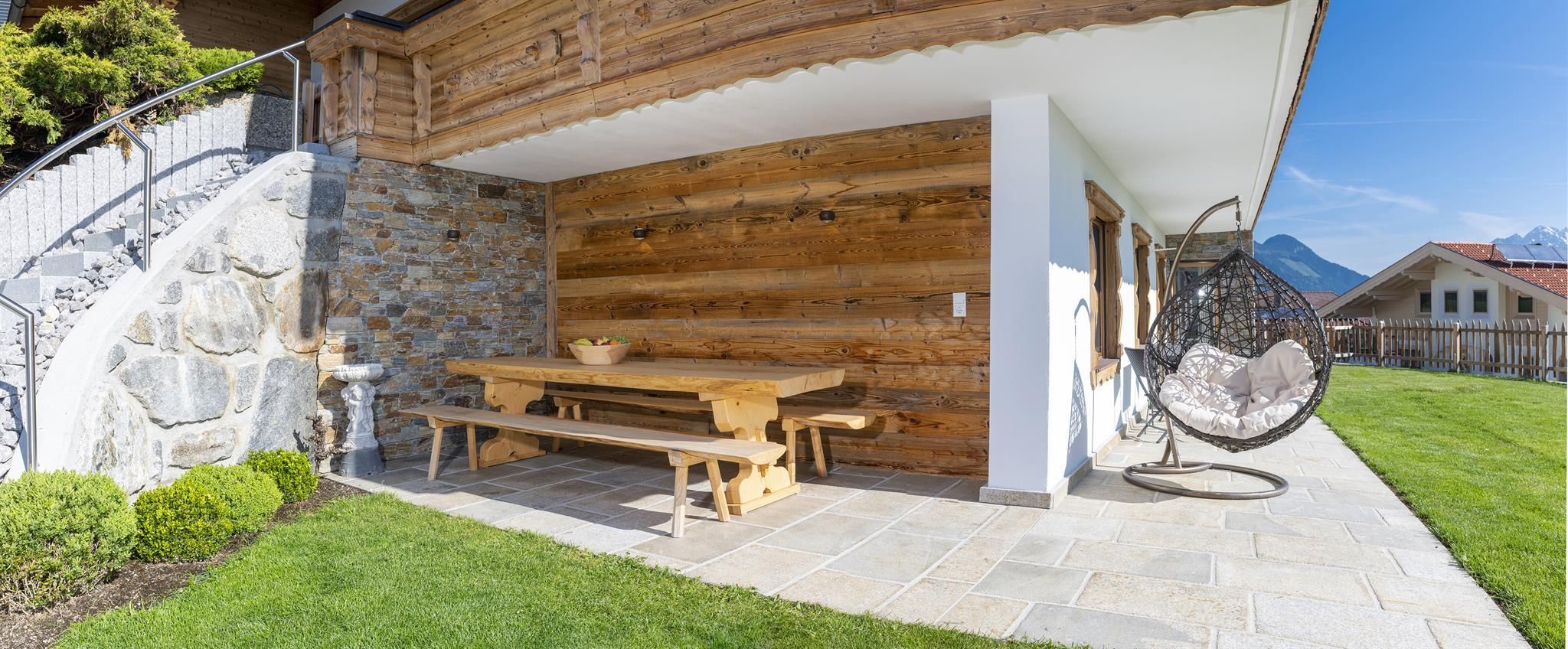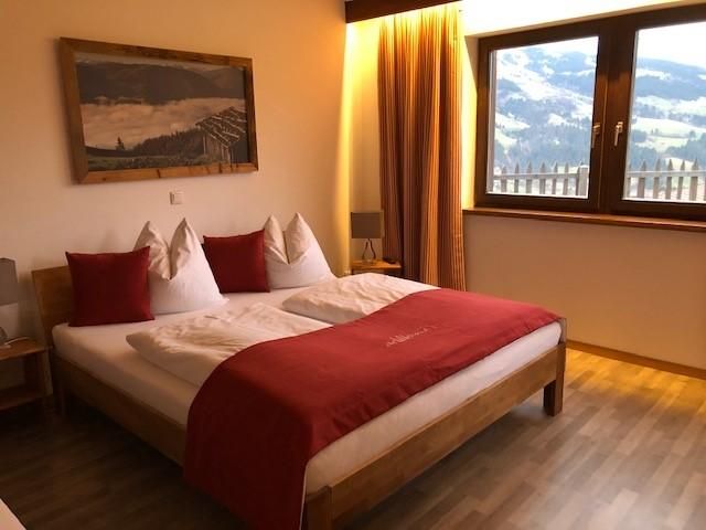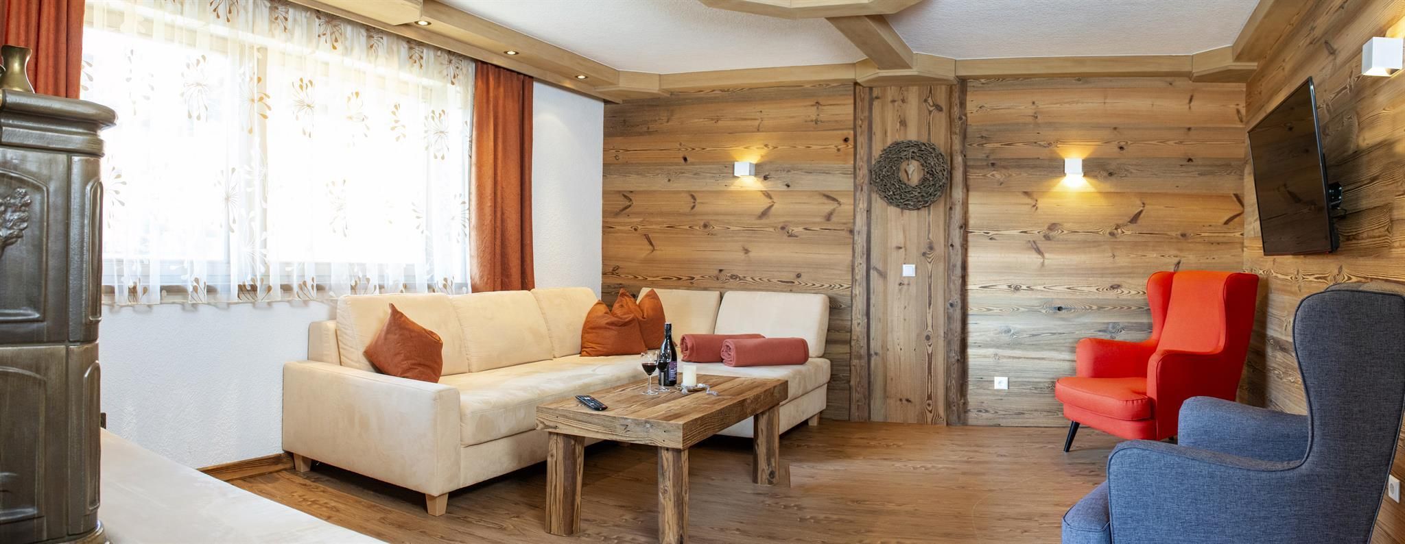 Genießen Sie Ihre Auszeit in unserer Panorama-Zirben Sauna mit Ausblick auf die Kitzbühler Alpen und gemütlichem Ruheraum der keine Wünsche offen lässt.