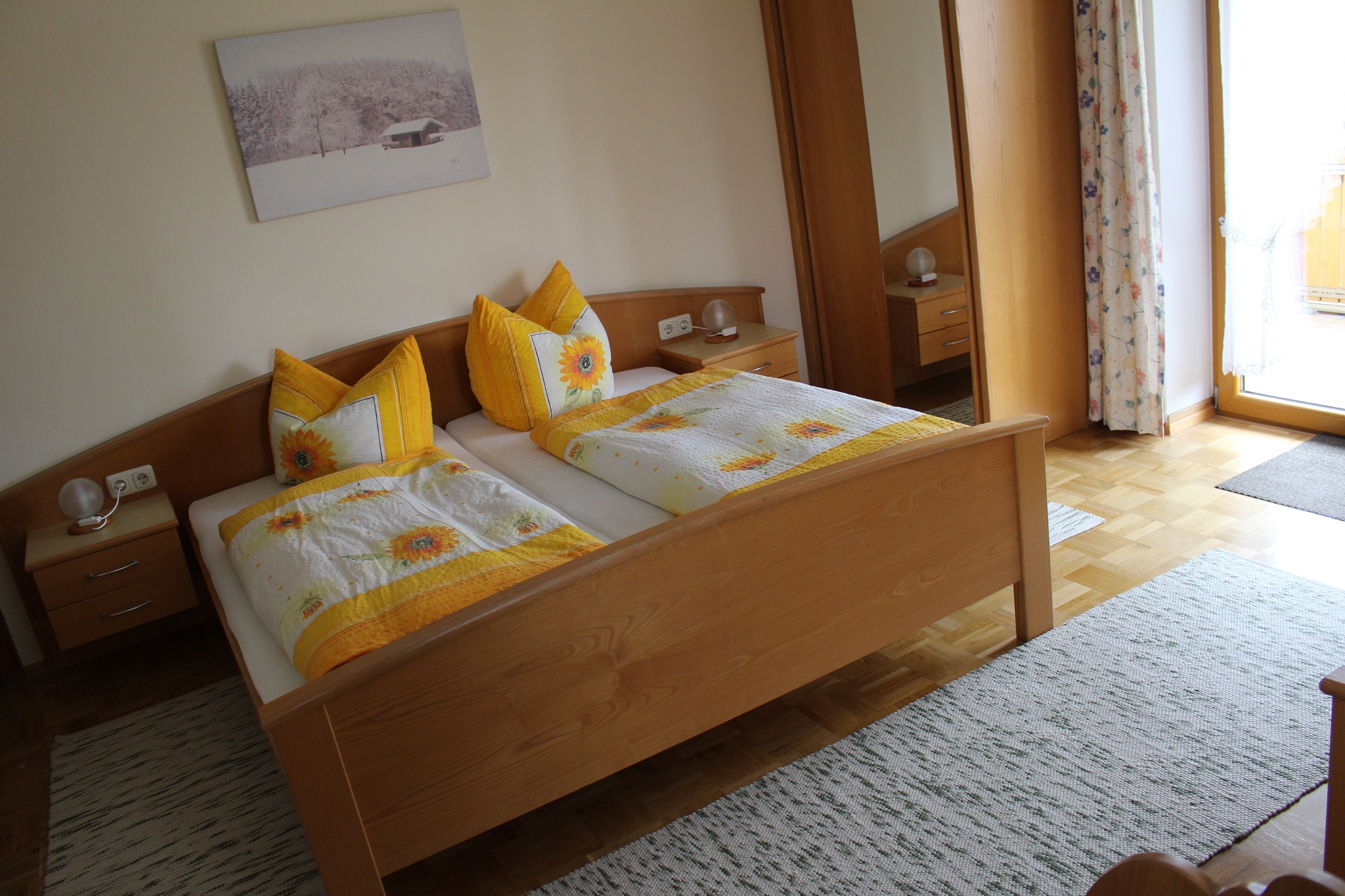 Gemütlich eingerichtetes Dreibettzimmer mit Dusche/WC und Süd/Ost-Balkon. Das Dreibettzimmer verfügt über ein Doppelbett und einem Einzelbett,welches sich . Aufgrund des Eck-Balkons hat man einen freien Ausblick sowohl auf die Berge als auch auf die bayrische Landschaft.