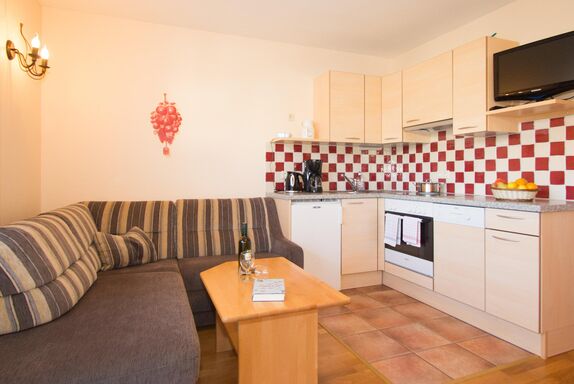 Appartement mit Wohnraum und voll eingerichtete Küche, getrenntem Schlafraum, Dusche, Doppelwaschbecken und WC getrennt, TV, Radio, W-Lan und Telefon.