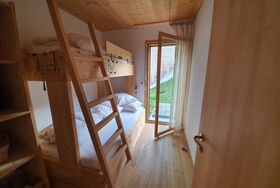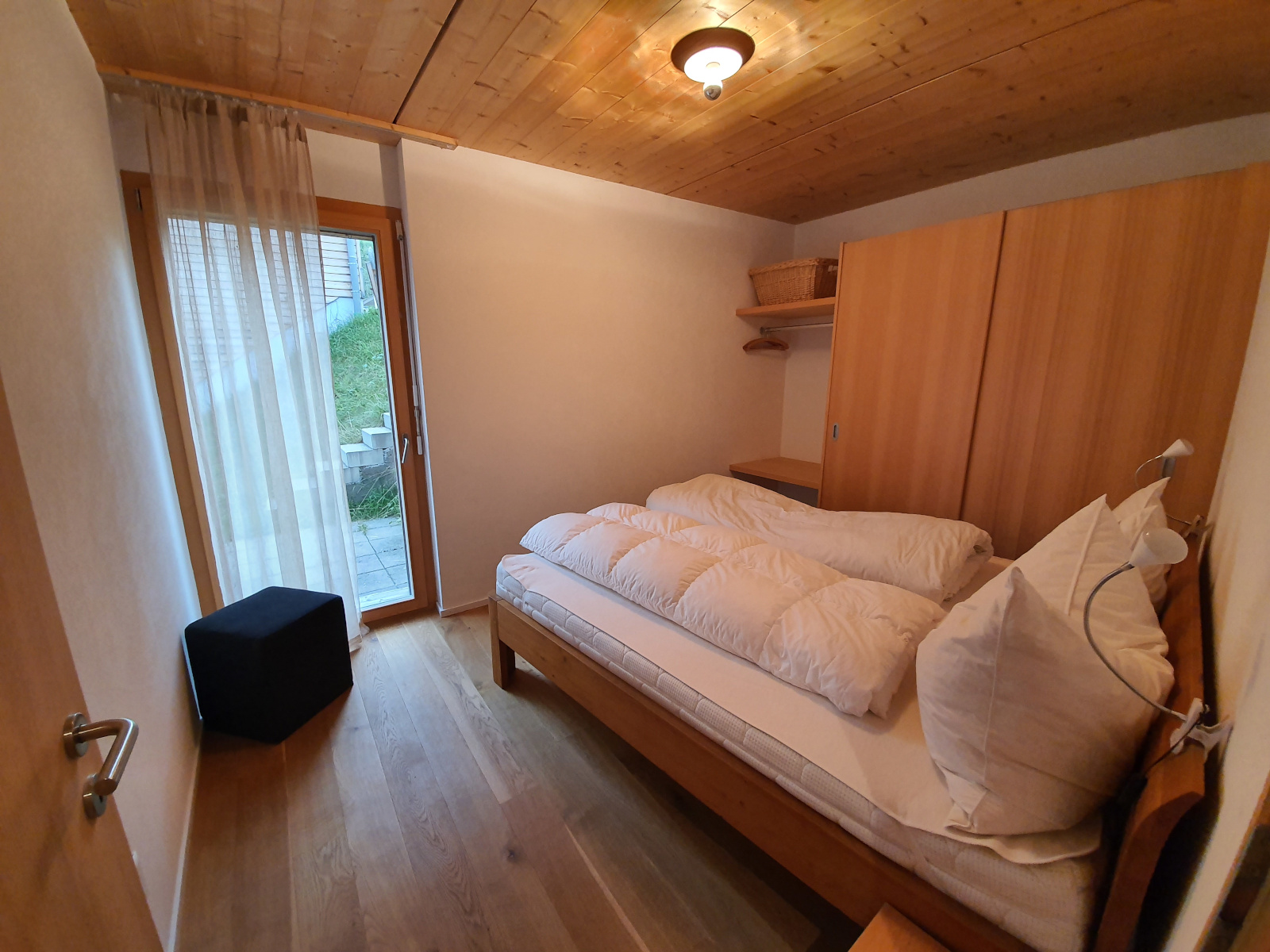 Zwei Schlafzimmer im EG, ein Schlafzimmer mit einem Doppelbett, ein Schlafzimmer mit einem Doppelbett und ein Etagenbett, ein ausziehbares Bettsofa im Wohnzimmer. Bettwäsche vorhanden.