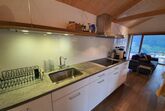 Offene Küche im OG mit angrenzendem Essbereich, ausgestattet mit Backofen mit integrierter Mikrowelle, Geschirrspüler, Kaffeemaschine (Delizio).
