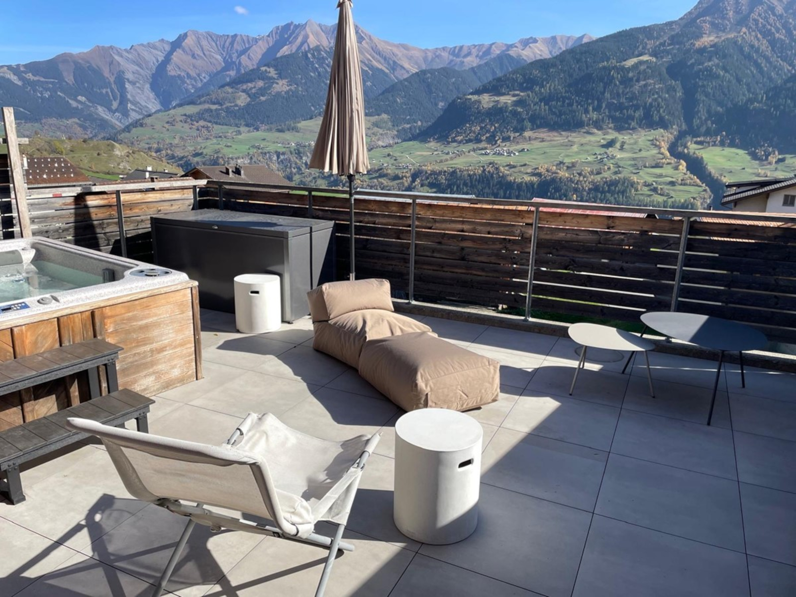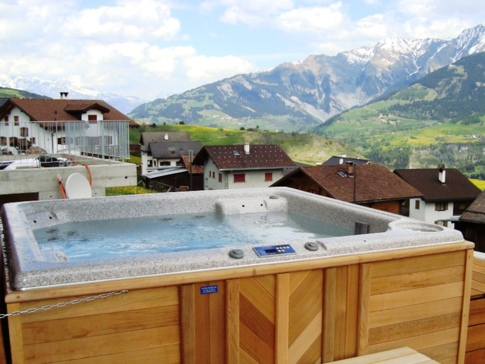 Terrasse mit traumhafter Bergsicht und Whirlpool (50 CHF Unkostenbeitrag), sowie zusätzlichem Balkon und gedecktem Sitzplatz.
