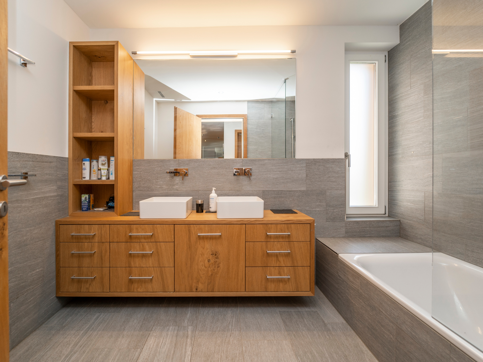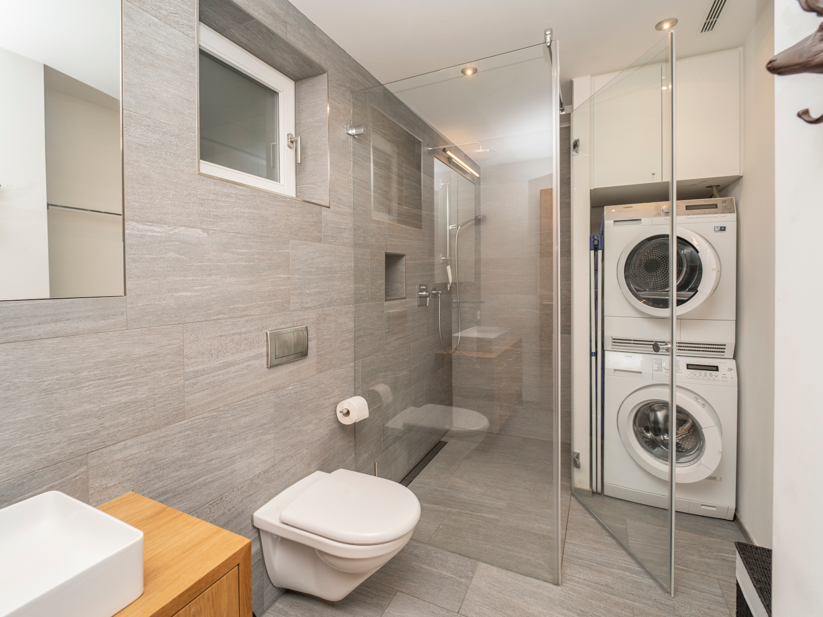 Zwei Badezimmer: eines mit Wanne und WC, eines mit Dusche und WC, Föhn vorhanden.