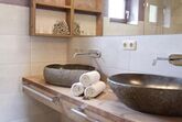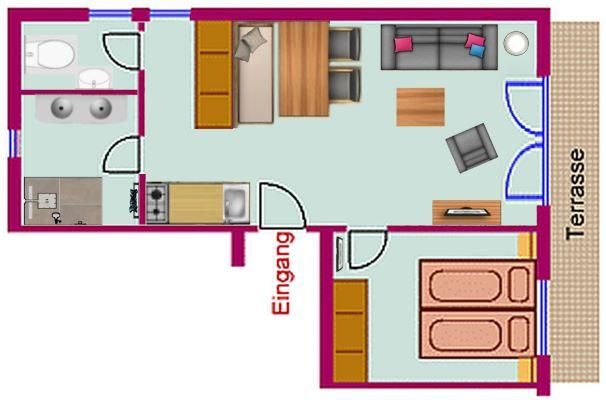 1 Wohnschlafraum mit Doppelschlafcouch, Sat-TV, Küchenzeile mit Spülmaschine, Toaster, Wasserkocher, Kaffeemaschine und Mikrowelle, Dusche/Doppelwaschbecken, separates WC mit Haarföhn, Kosmetikspiegel und Südwest-Terrasse, Safe, Telefon, 1 Parkplatz.