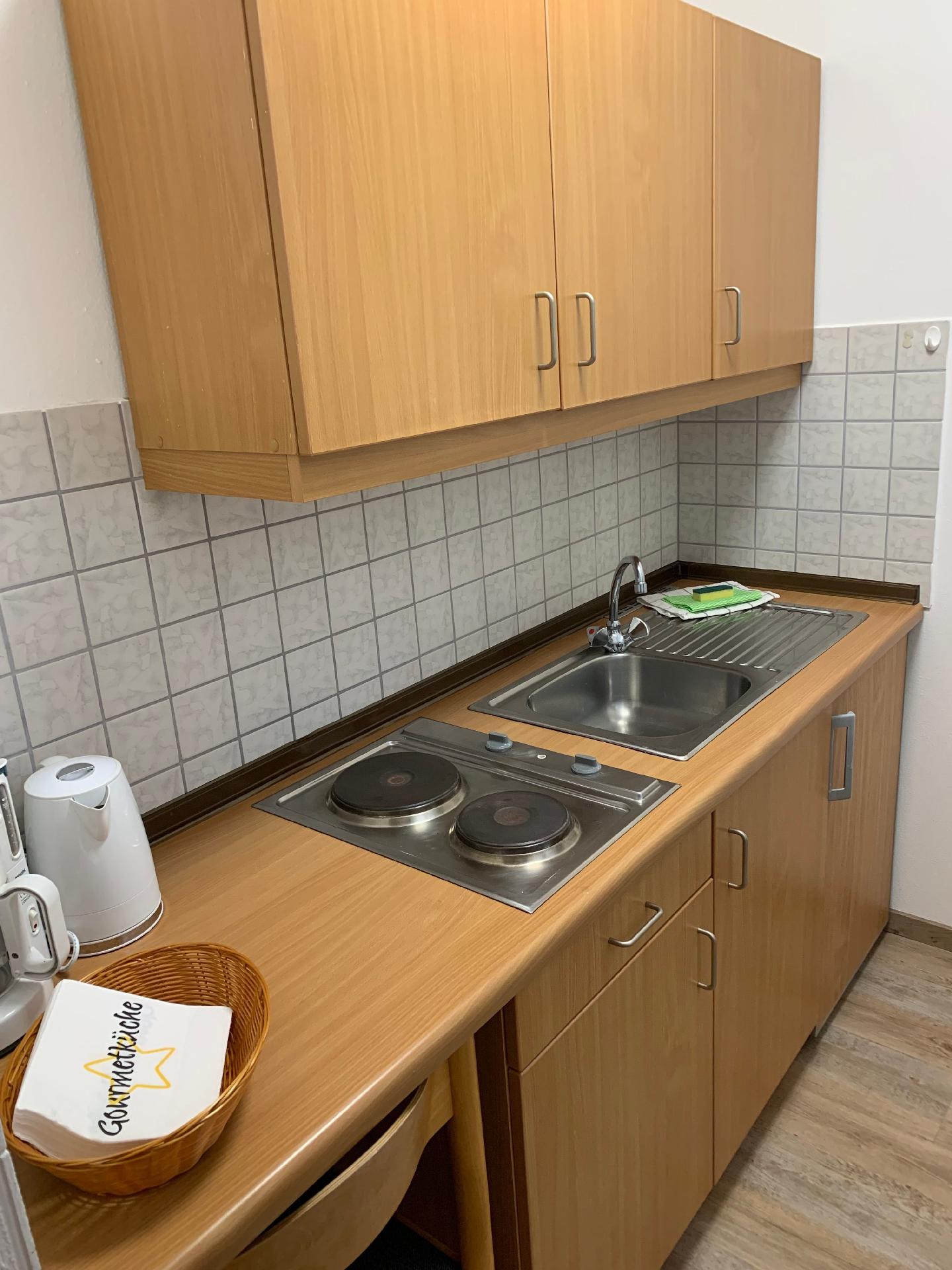 Kochen: 2-Plattenherd; Gefrierfach; Kaffeemaschine; Kühlschrank; Toaster; Wasserkocher
