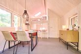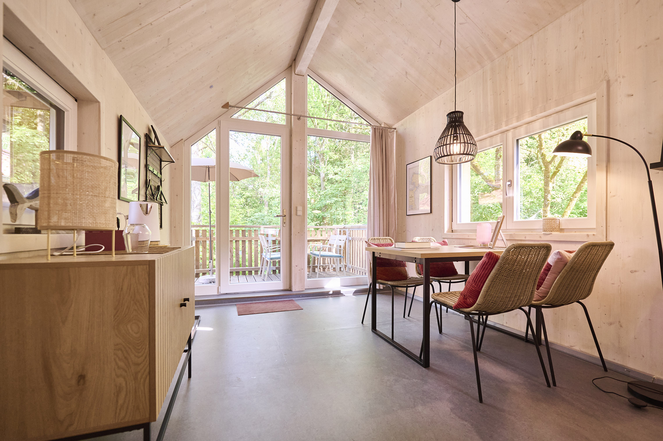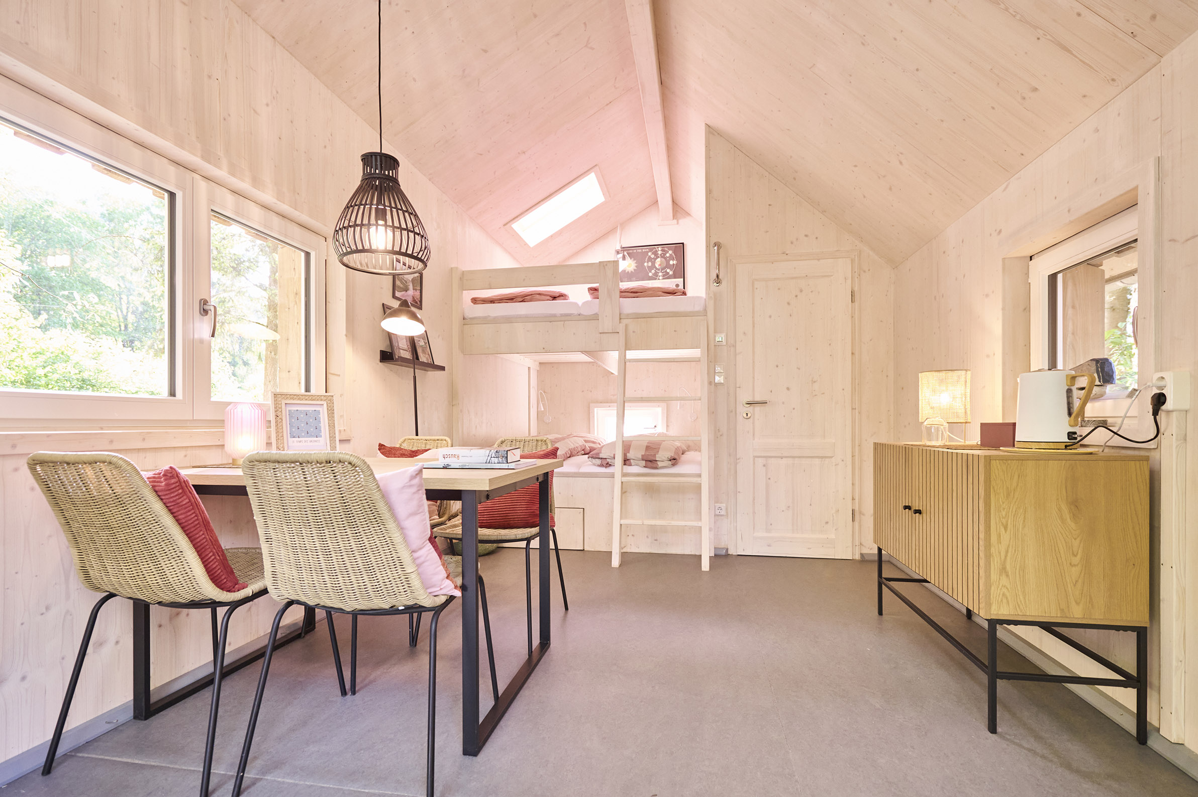 Unser Stelzenhaus Fehmarn ist für vier Personen gedacht, gerne können auch noch Babybett und Hochstuhl auf Anfrage dazu gestellt werden. Die Einrichtung ist naturfarben und schwarz mit schicken, martitimen Details. Der Raum ist ca. 20 qm groß und man kann bei kühlem , nassem Wetter sehr angenehm innen sitzen und den Blick durch das große Panoramafenster genießen. In allen Häusern gibt es Fußbodenheizung, also keine Angst vor der kühleren Jahreszeit. Außerdem gibt es Wasserkocher, Lesestoff, Spiele und Infomaterial.Im Haus gibt es außerdem ein Bad mit Trockentoilette und Waschbecken. Duschen sind im Sanitärblock und im Waldbad (Eintritt inbegriffen). Frühstück kann im Korb angeliefert werden und auf der schönen Terasse genossen werden.