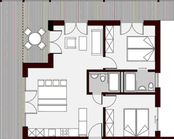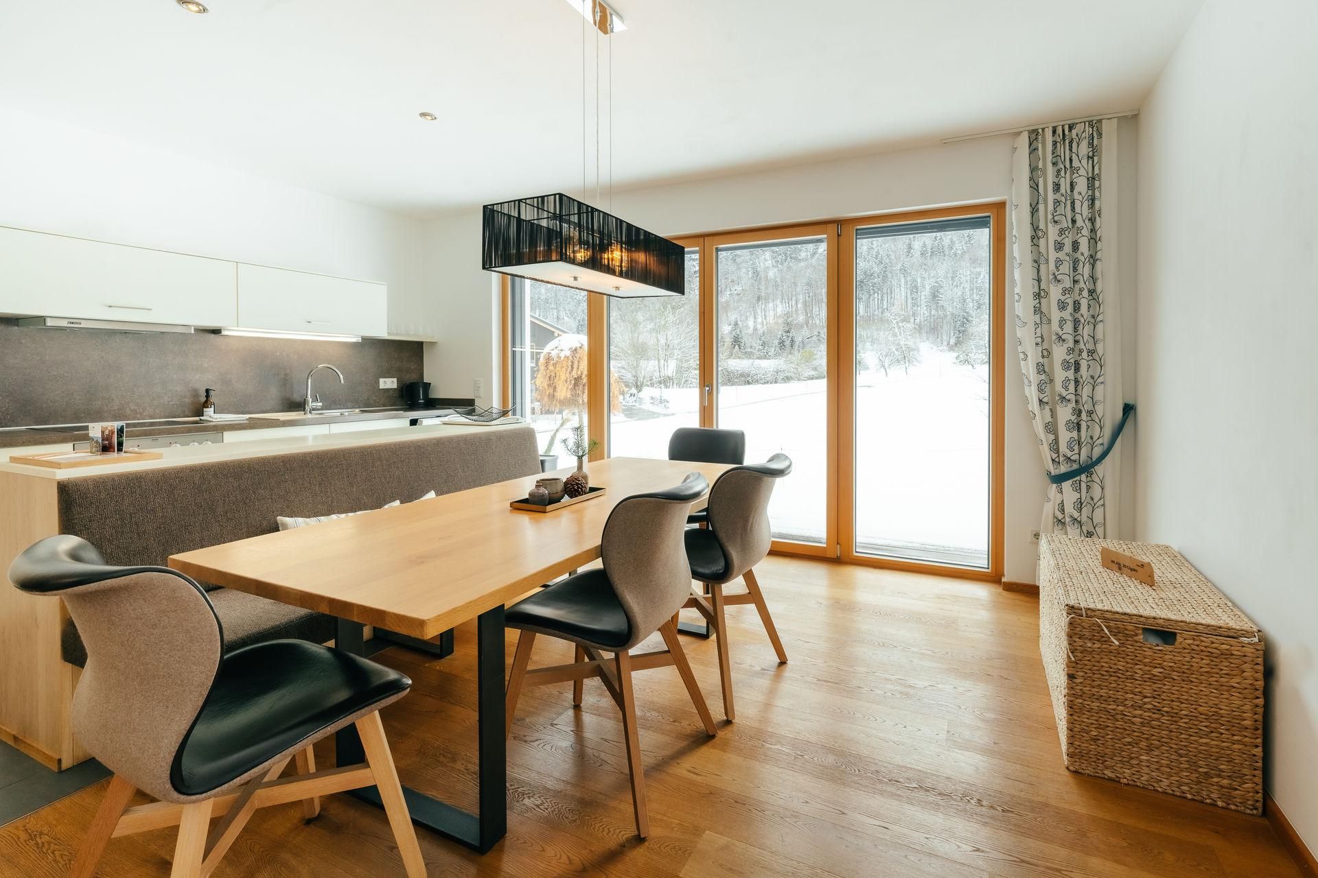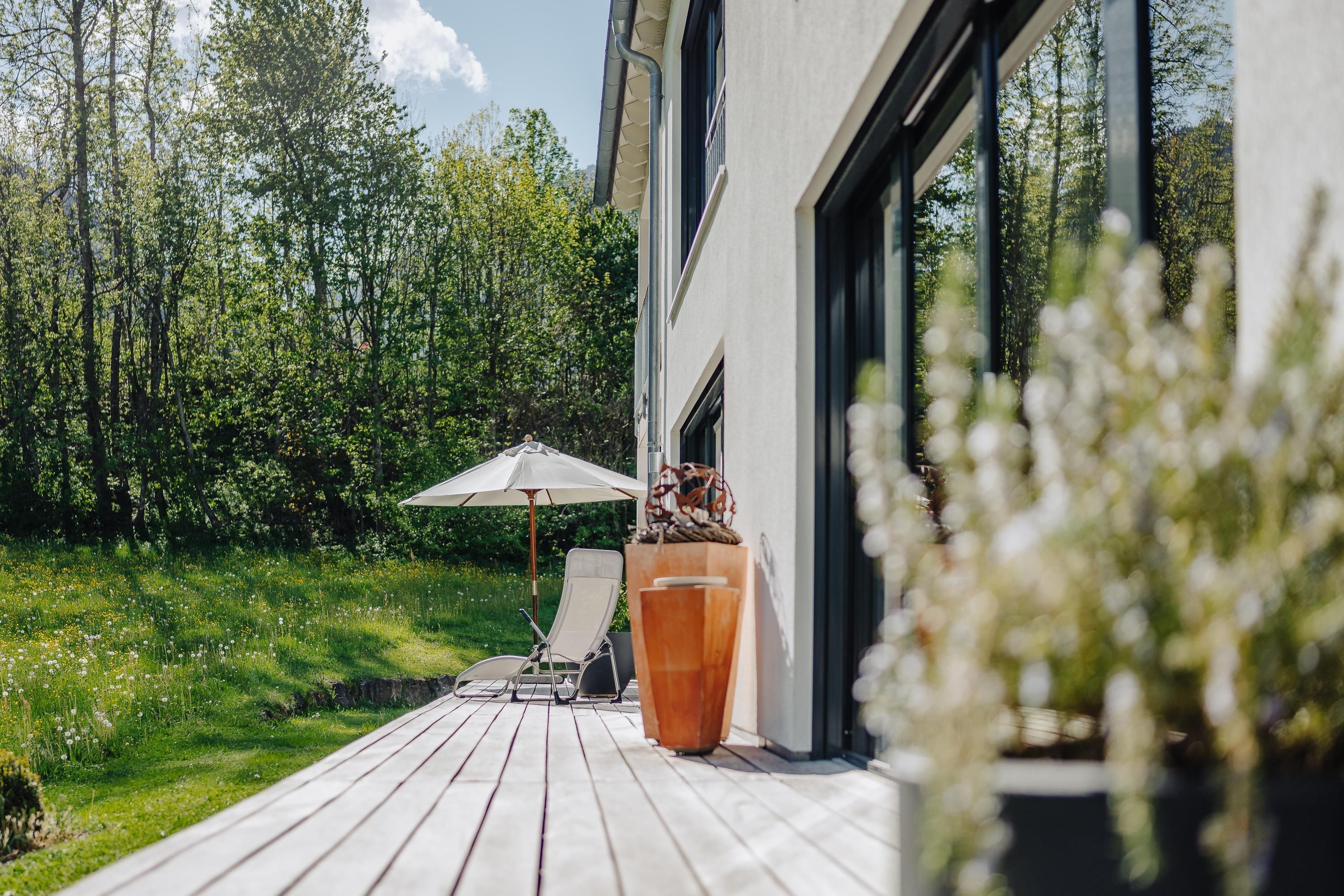 Eine optimale Raumeinteilung mit ineinanderfließenden Räumen und zwei Bädern ermöglichen entspanntes Wohnen für 4-6 Personen. Gegen Westen gelegene Schlafzimmer garantieren Ihnen einen ruhigen, gesunden Schlaf. Genügend Platz zum Entspannen und Verweilen bietet auch die Gartenterrasse mit 41 m². Hier sitzen Sie in erster Reihe zur Bergkulisse.