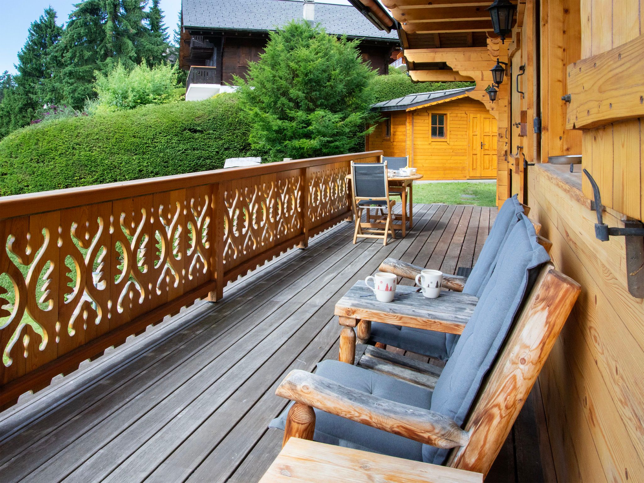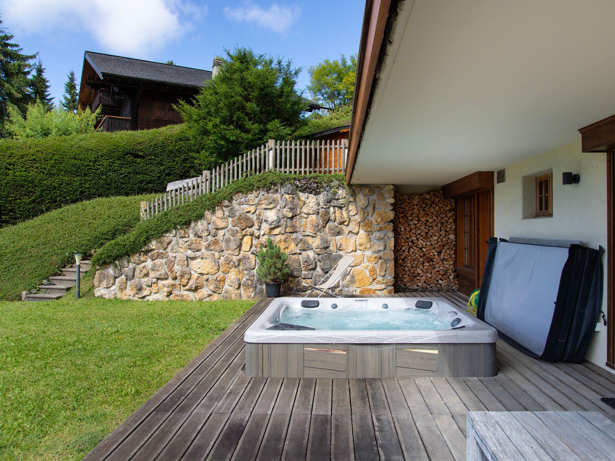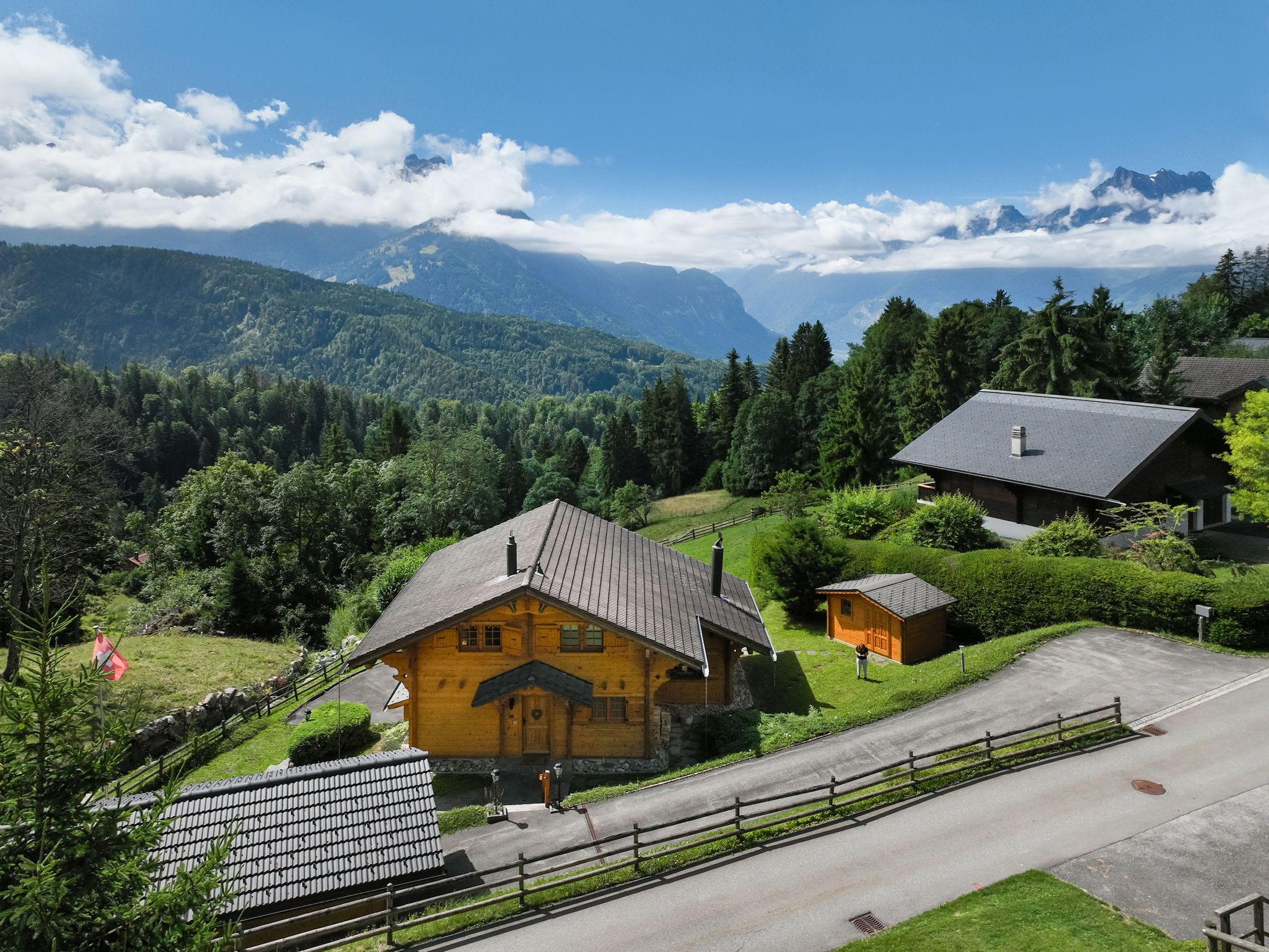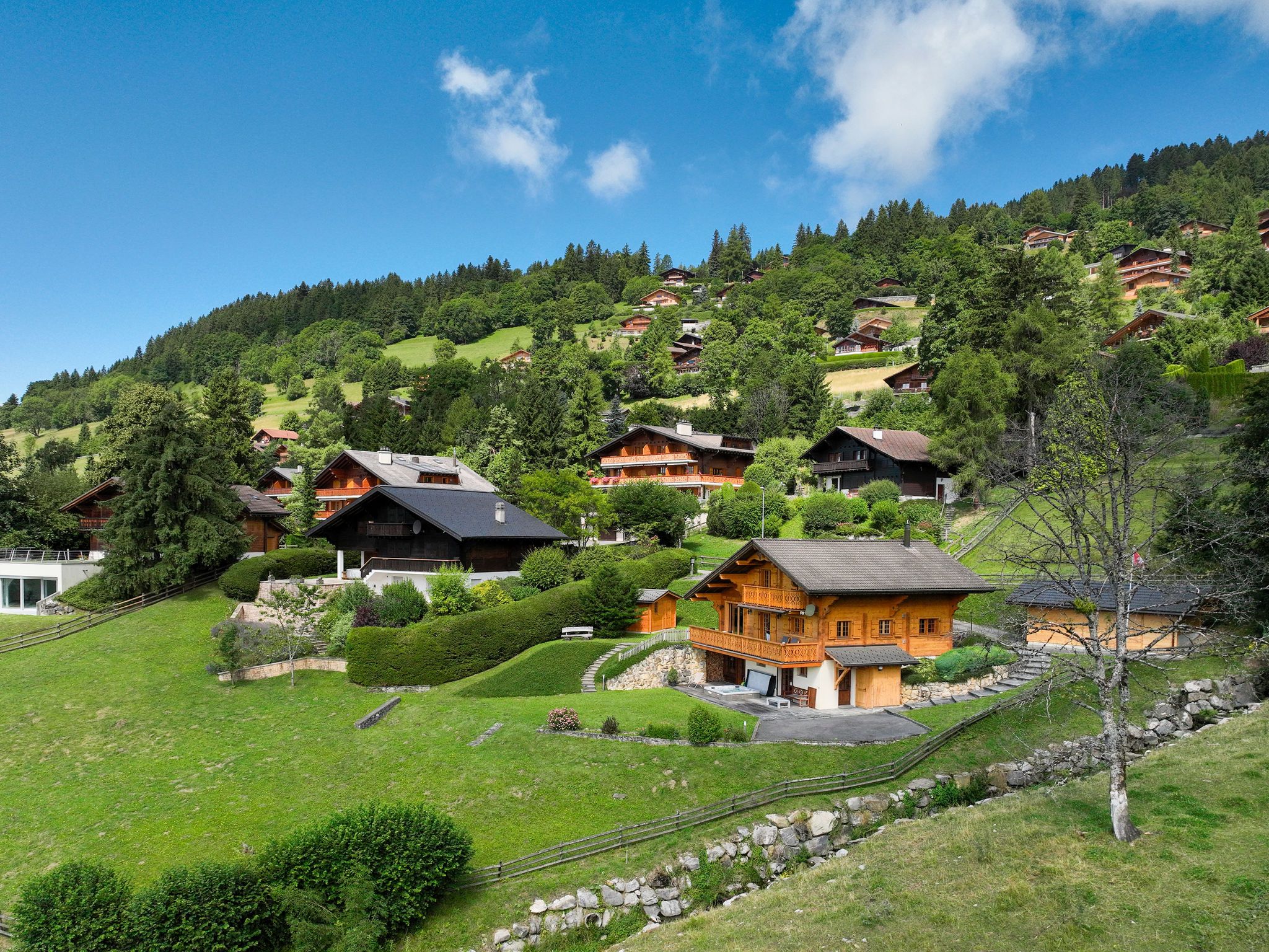 Chalet Nirvana, 7-Zimmer-Chalet 200 m2 auf 3 Stockwerken, Südlage. Objekt geeignet für 6 Erwachsene + 2 Kinder. Sehr komfortabel und geschmackvoll eingerichtet: Wohn-/Esszimmer mit offenem Kamin, Esstisch und TV (Flachbildschirm). Ausgang zum Balkon. Salon. Offene Küche (Backofen, Geschirrspüler, 6 Induktionskochplatten, Toaster, Wasserkocher, Tiefkühler, elektrische Kaffeemaschine, Kapseln für die Kaffeemaschine (Nespresso) extra, Dampfgarer, Racletteofen). Dusche/WC. Unteres Geschoss: Salon mit TV (Flachbildschirm). Ausgang zum Garten, Richtung Süden. 1 Zimmer, ohne Schrank mit 1 Doppelbett (1 x 160 cm). Ausgang zum Garten, Richtung Süden. Dusche/WC. Obergeschoss: 1 Zimmer mit 1 Doppelbett (1 x 180 cm). Ausgang zum Balkon, Richtung Süden. 1 Kinderzimmer mit 2 Betten (90 cm, Länge 190 cm). 1 Zimmer mit 1 franz. Bett (1 x 160 cm). Ausgang zum Balkon, Richtung Süden. Bad/WC. Grosser Balkon, Südlage, kleiner Balkon, Südlage, grosser, Garten, Südlage. Balkonmöbel, Gartengrill, Liegestühle. Sehr schöne Sicht auf die Berge. Zur Verfügung: Waschmaschine, Wäschetrockner, Haartrockner. Internet (WLAN, gratis). Parkplatz, Garage (1 Auto). E-Ladestation. Bitte beachten: Nichtraucher-Haus.