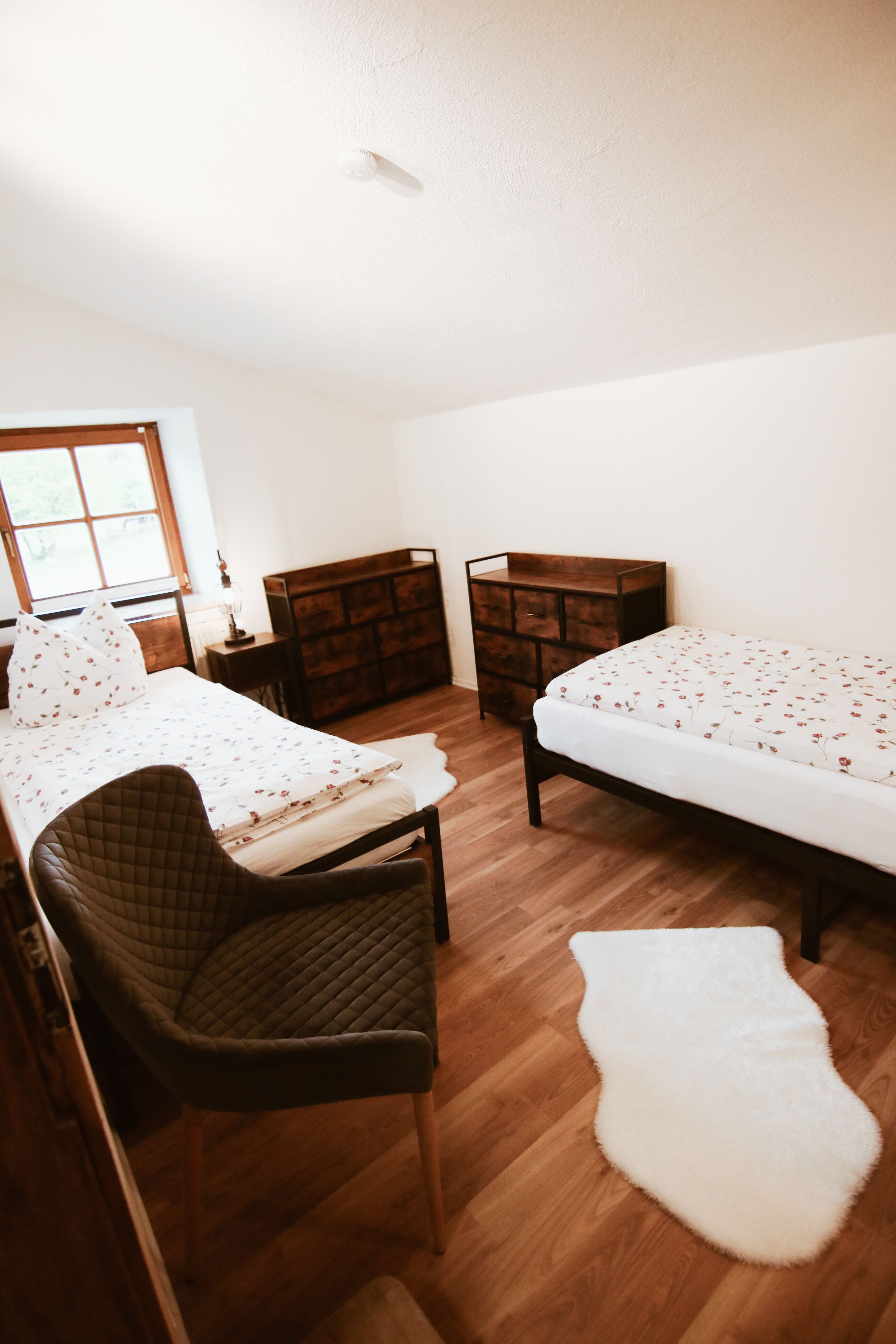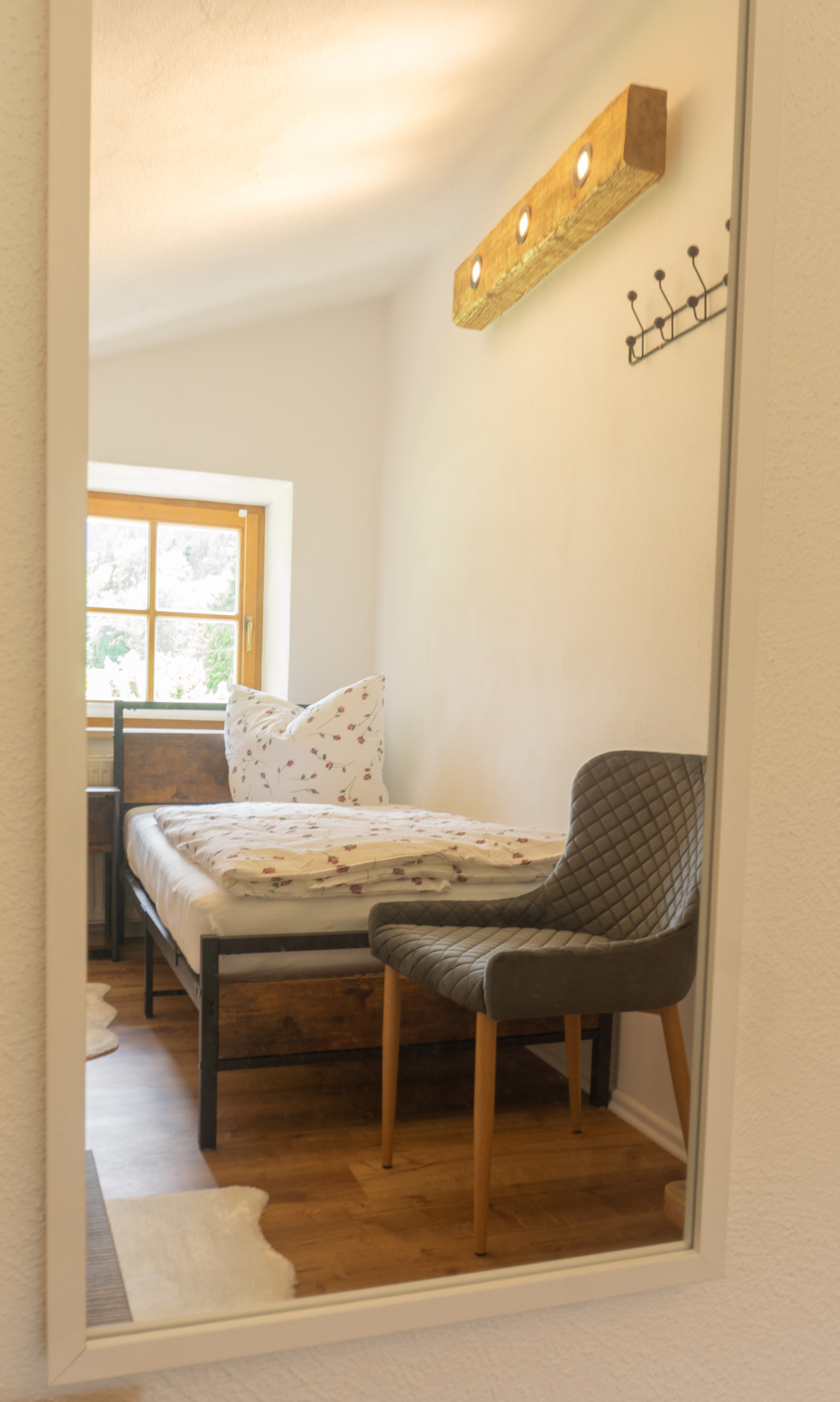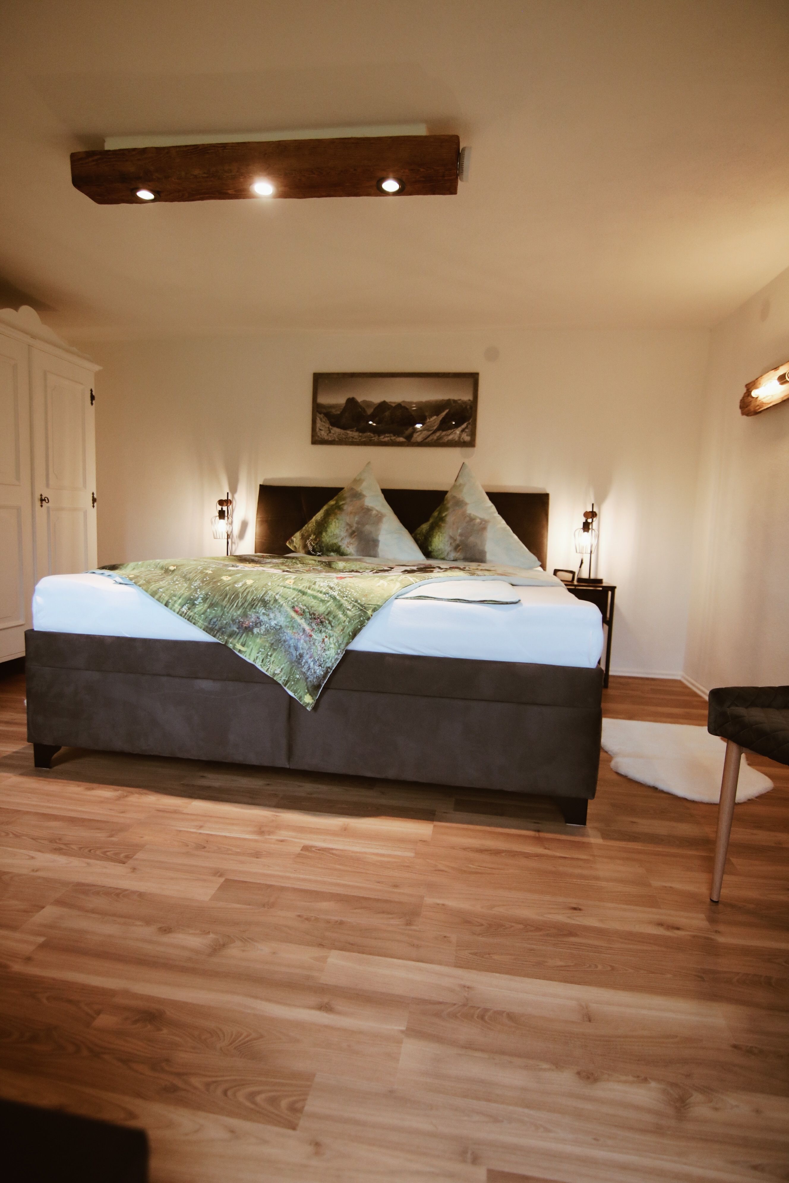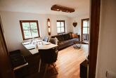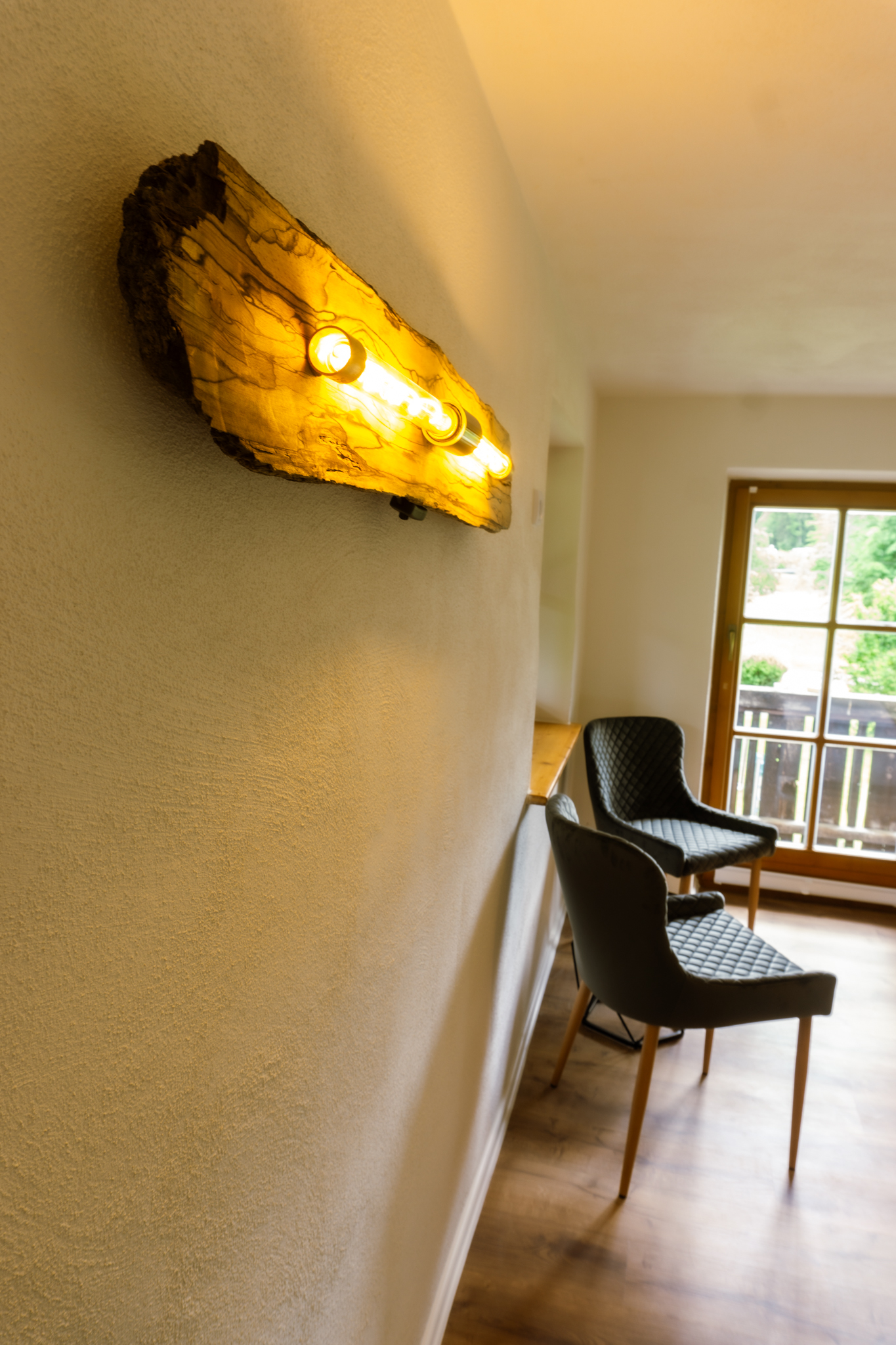 Die neu renovierte, modern ausgestattete Ferienwohnung verfügt über ein Wohn-Esszimmer mit Sat-TV, Radio, 2 Schlafzimmer mit je 1 Doppelbett 1,80m x 2,00m und einem großen Kleiderschrank, 1 Kinderzimmer mit 2 Einzelbetten je 0,90m x 2,00m und 2 Kommoden. Die vollausgestattete Küche bietet einen Elektroherd (4 Kochplatten und Backrohr), Kühl-und Gefrierschrank, Kaffeemaschine, Wasserkocher, Toaster und separater Sitzmöglichkeit. Ein Badezimmer mit Dusche und WC. Im Eingangsbereich befindet sich ein Kamin mit gemütlicher Sitzmöglichkeit. Der Nord-Ost-Südbalkon bietet einen traumhaften Alpenpanoramablick. Im Garten befindet sich eine eigene Terrasse mit großem Tisch, 6 Sitzplätzen und großem Sonnenschirm.