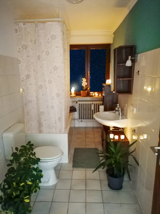 Bad: Badewanne mit Dusche, WC, Hand- Badetücher, Fön