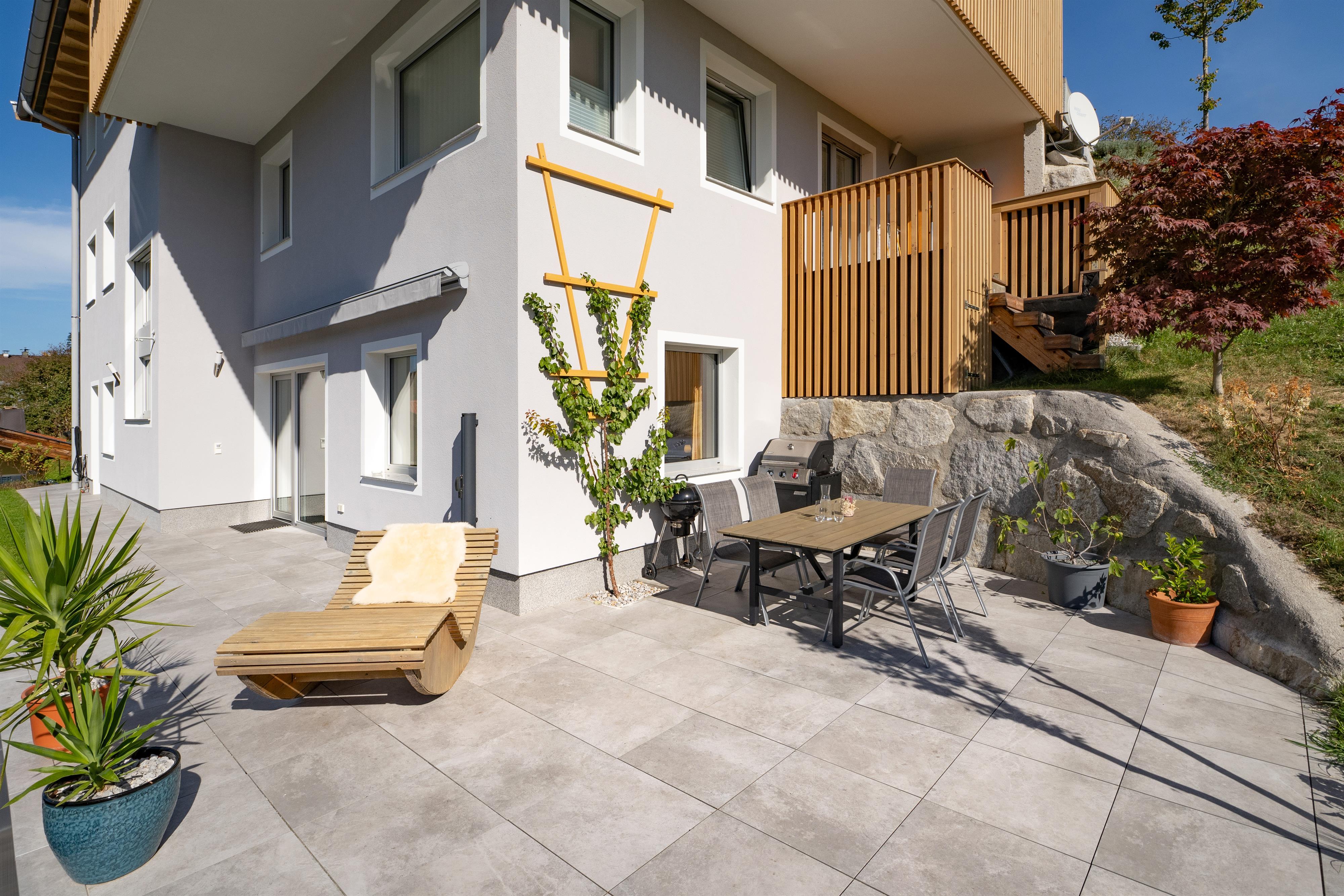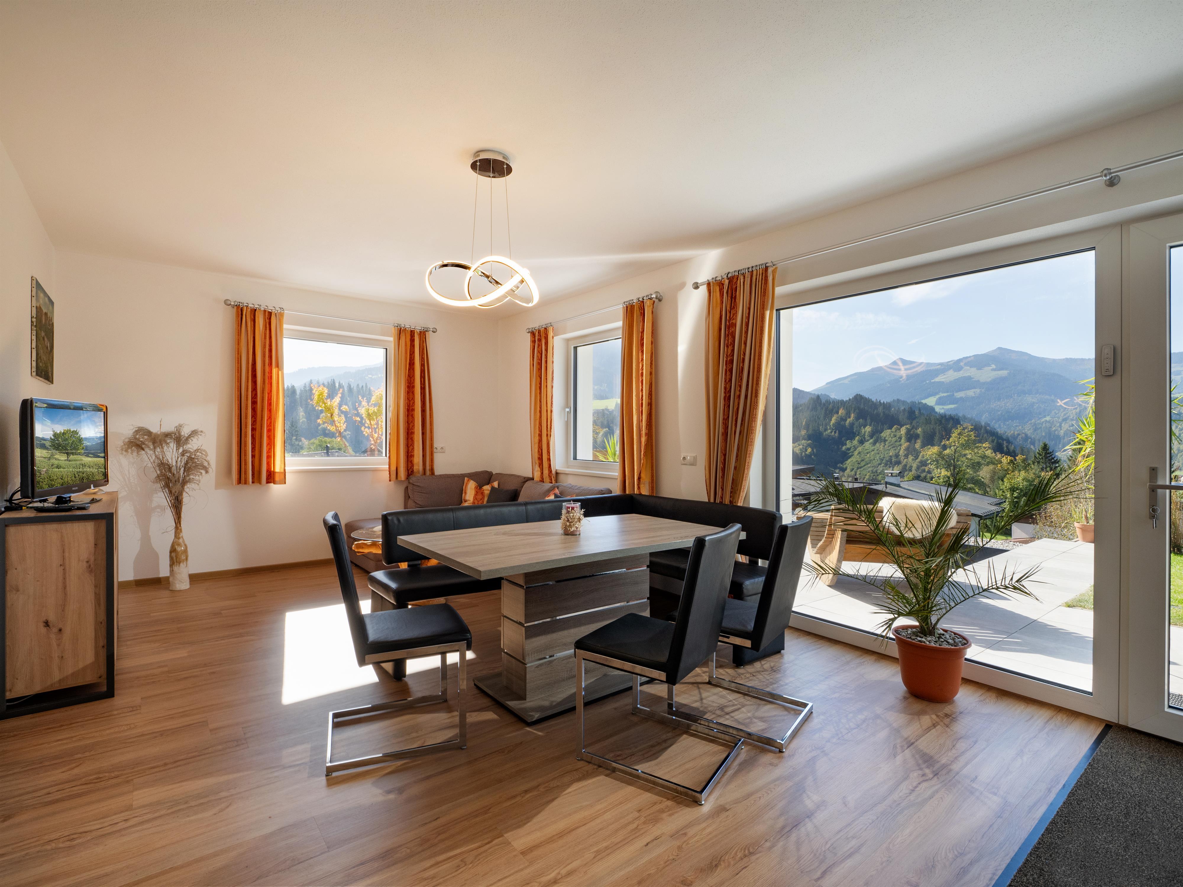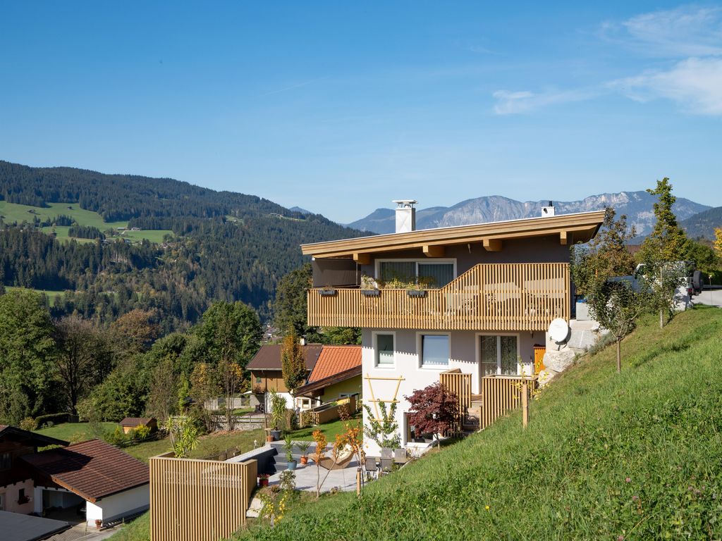 Das neu gebaute 65 m² große Appartement befindet sich am Fuße der Hohe Salve in sonnenverwöhnter Hanglage, die 4 Elemente finden sich wieder in der luftigen Aussicht vom Wohnzimmer über die Bergwelt der Kitzbüheler Alpen. Das Haus wurde mit der Rückseite in den Hang gebaut und wird mit einer Erdwärmepumpe (Strom aus 100% erneuerbarer Energiequelle) betrieben.