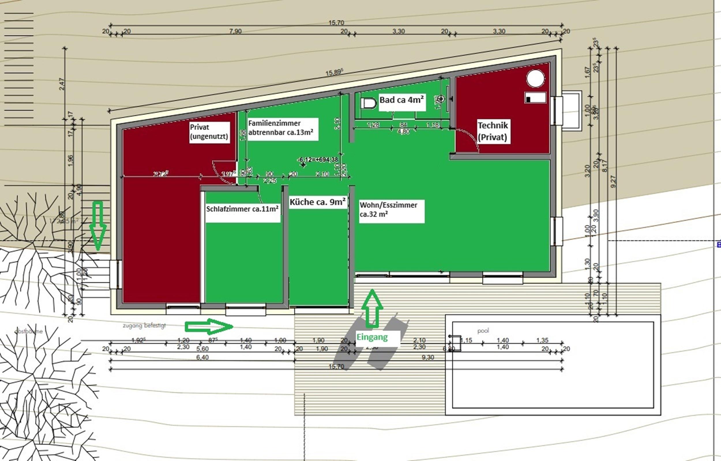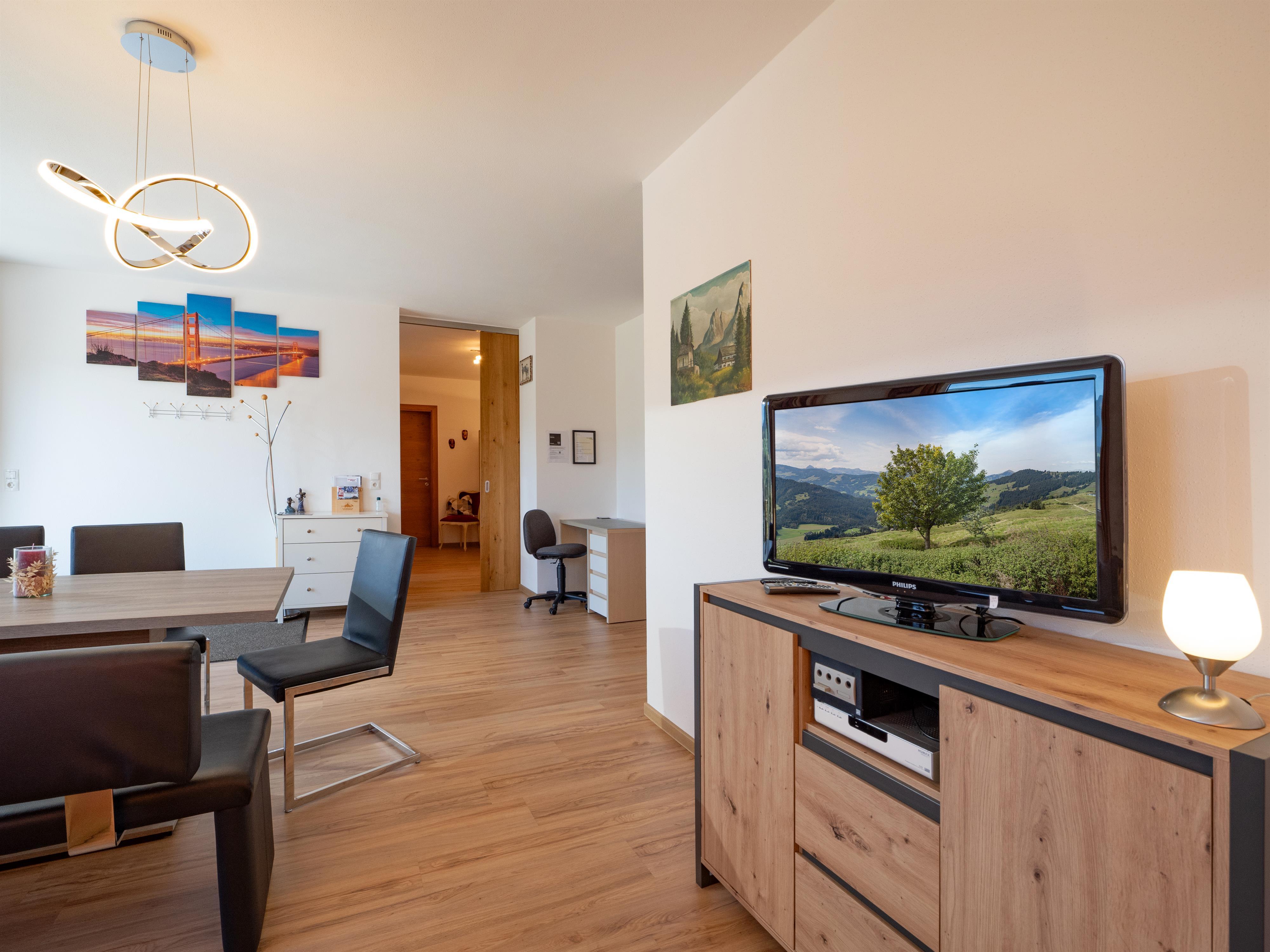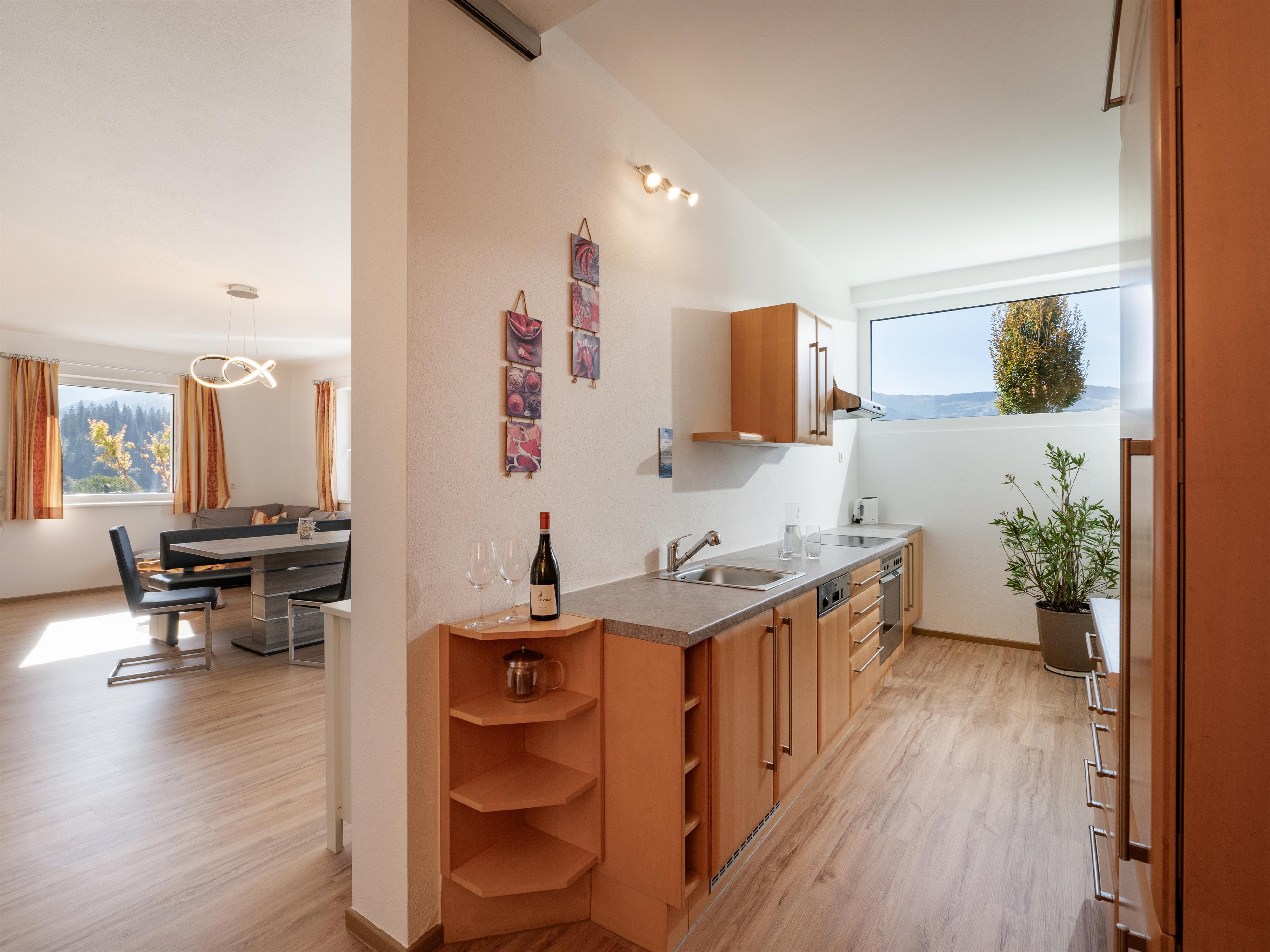 Das neu gebaute 65 m² große Appartement befindet sich am Fuße der Hohe Salve in sonnenverwöhnter Hanglage, die 4 Elemente finden sich wieder in der luftigen Aussicht vom Wohnzimmer über die Bergwelt der Kitzbüheler Alpen. Das Haus wurde mit der Rückseite in den Hang gebaut und wird mit einer Erdwärmepumpe (Strom aus 100% erneuerbarer Energiequelle) betrieben.