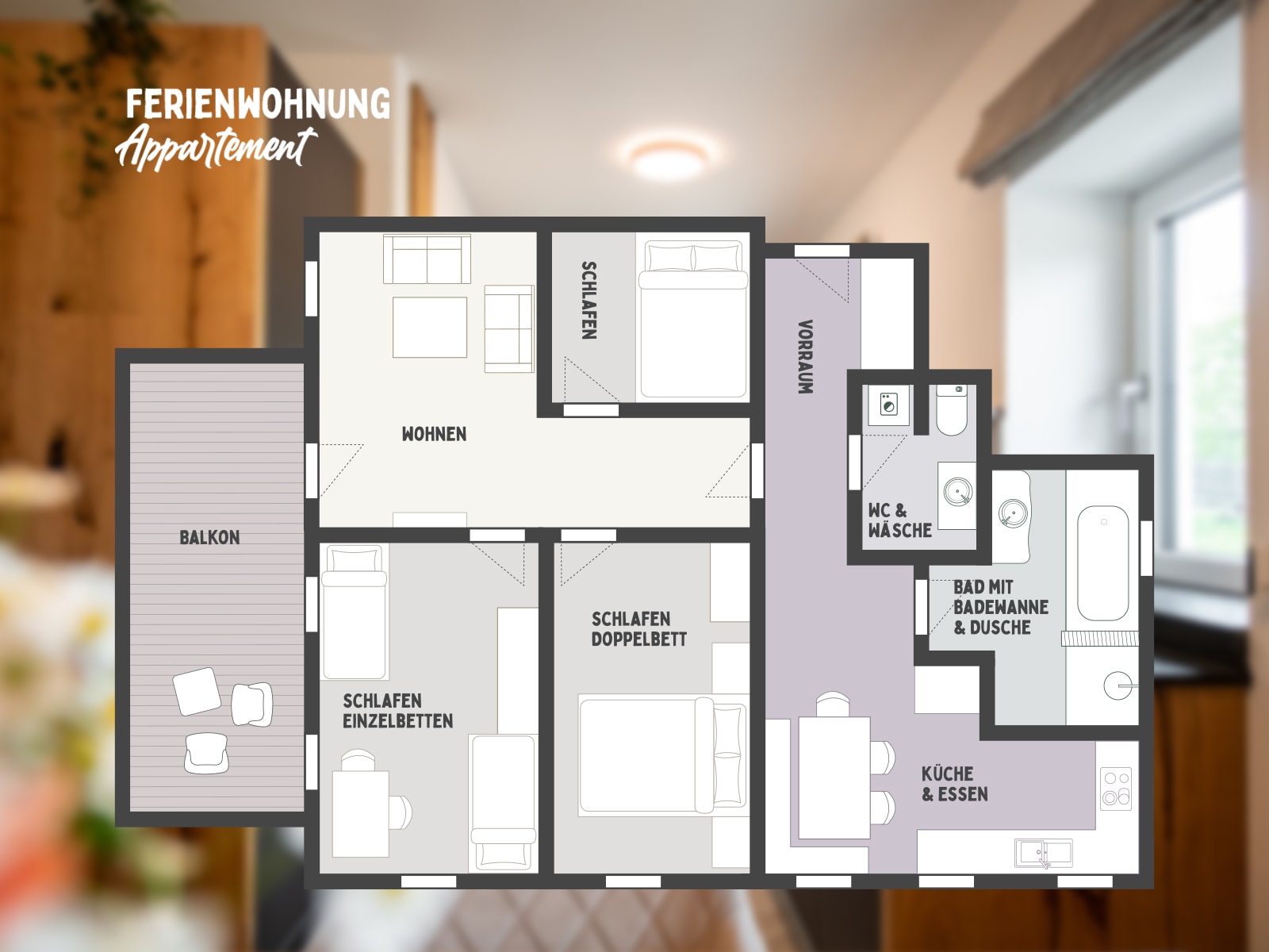Gemütlich und geräumig - mit drei separaten Schlafzimmern ist diese Unterkunft genau das Richtige für Familien oder Gruppen bis zu 5 Personen. Im Badezimmer befinden sich sowohl eine große Badewanne als auch eine geräumige Dusche sowie ein Föhn. Im separaten WC gibt es die Möglichkeit, Wäsche zu waschen und zu trocknen. Die Küche ist mit einem Backofen, Ceranfeld, Kühlschrank + Gefrierfach und einer Kaffeemaschine perfekt ausgestattet, um die Urlaubsversorgung sicherzustellen. Ein besonderes Highlight ist der überdachte Balkon mit 24 m², auf dem man herrlich frühstücken oder einfach nur ruhen kann.