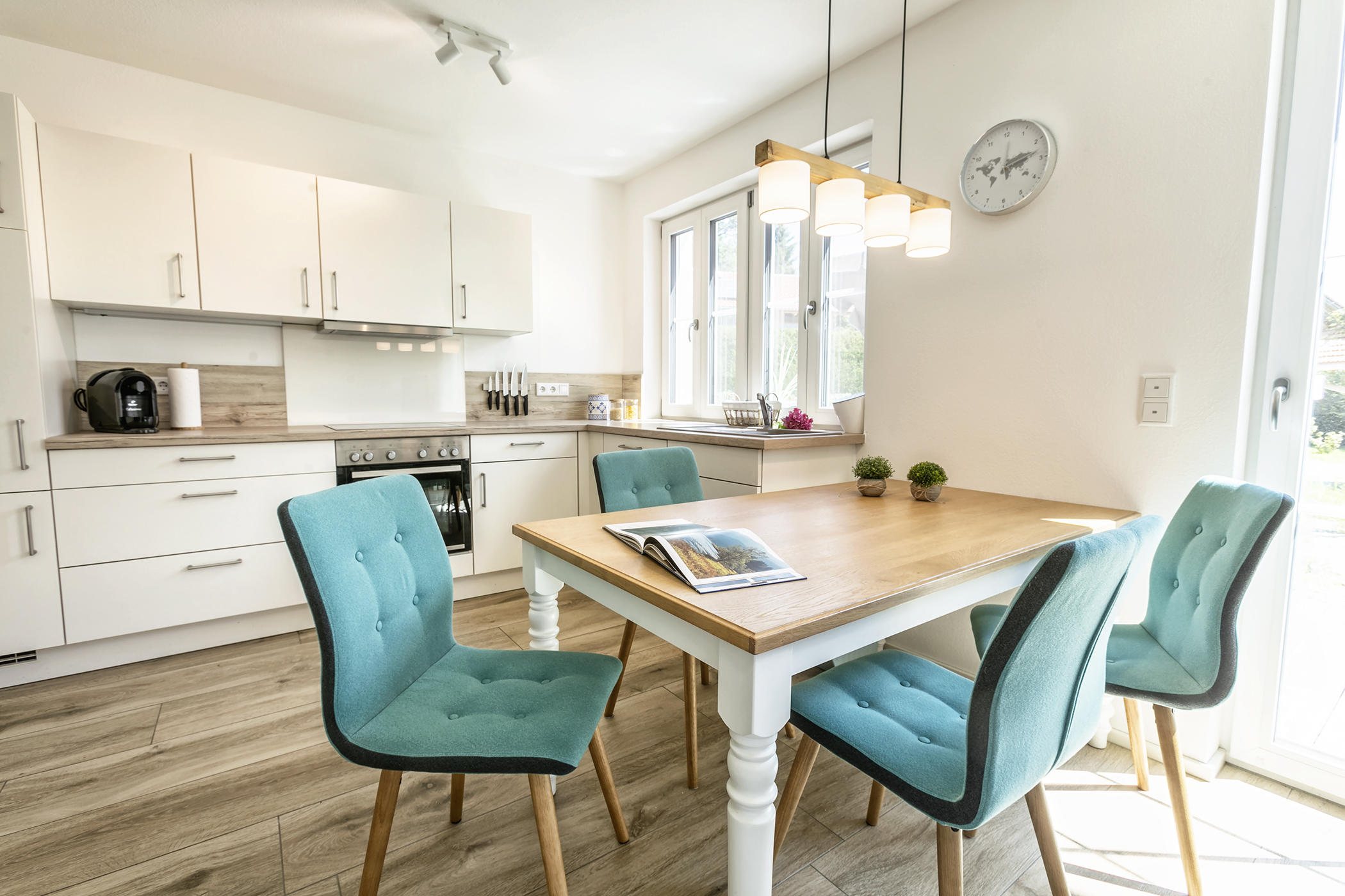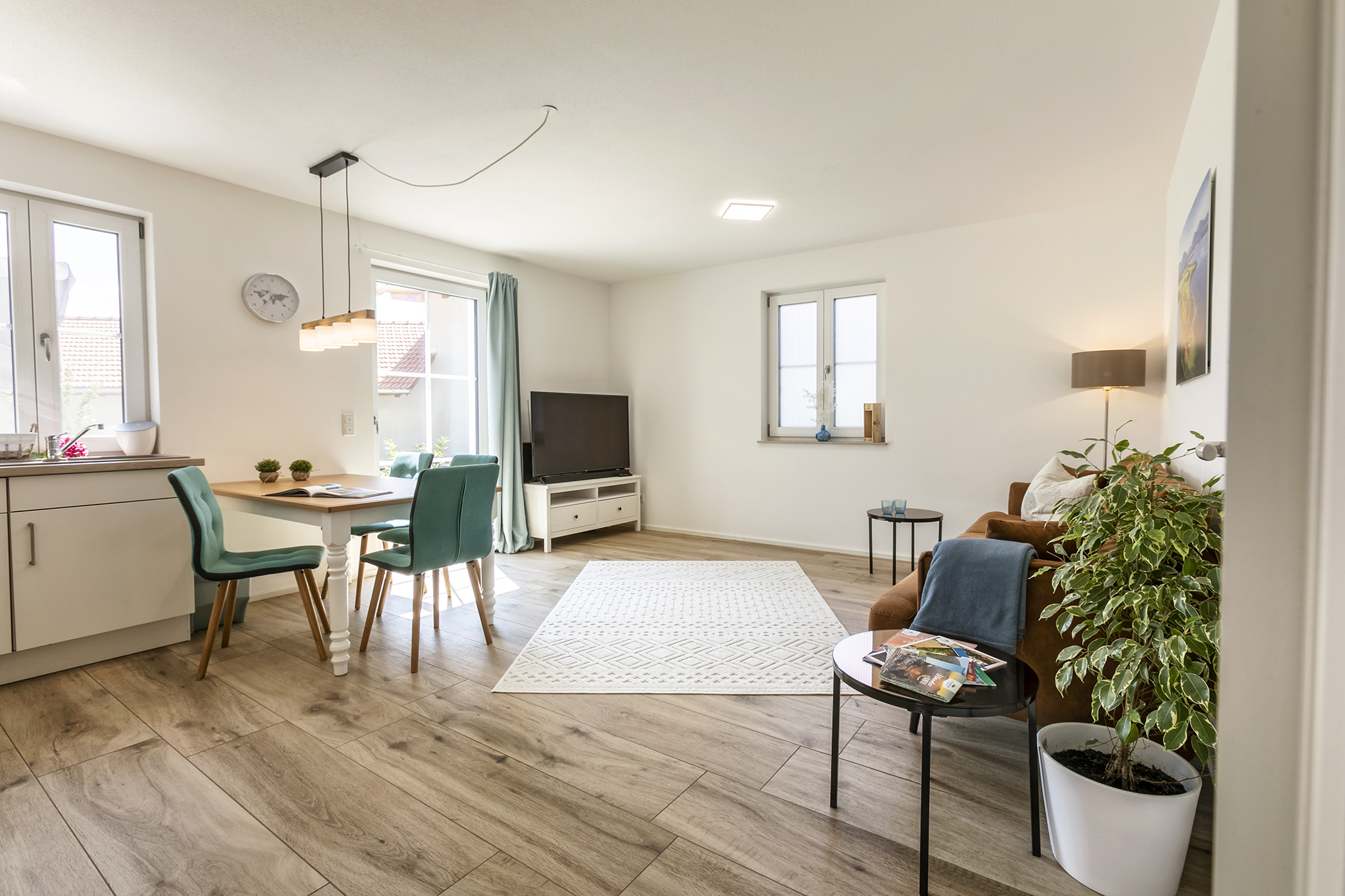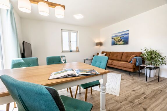 Der schöne Wohn-/Essbereich mit moderner Küche, einem schönen Esstisch und einer gemütlichen Kuschelecke bietet Ihnen alles was Sie für einen schönen Aufenthalt brauchen. Auch vom Wohn-/Essbereich gelangen Sie auf die große Terrasse mit Blick auf den Innenhof und Garten.