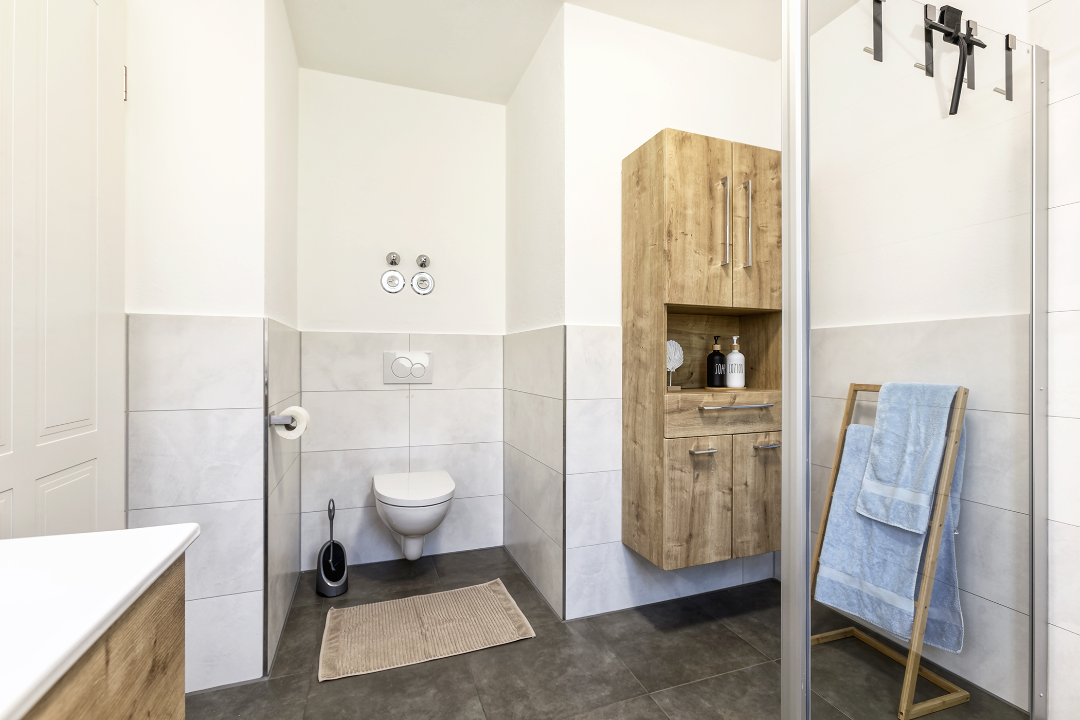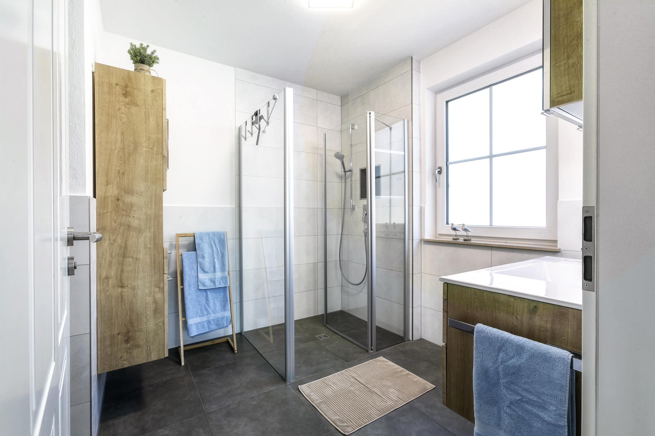 Die Wohnung bietet Ihnen auf knapp 115 m² eine Menge zu entdecken. Im Flur können Sie erst einmal ankommen, von dort aus gelangen Sie in das moderne Bad mit bodentiefer Dusche.
