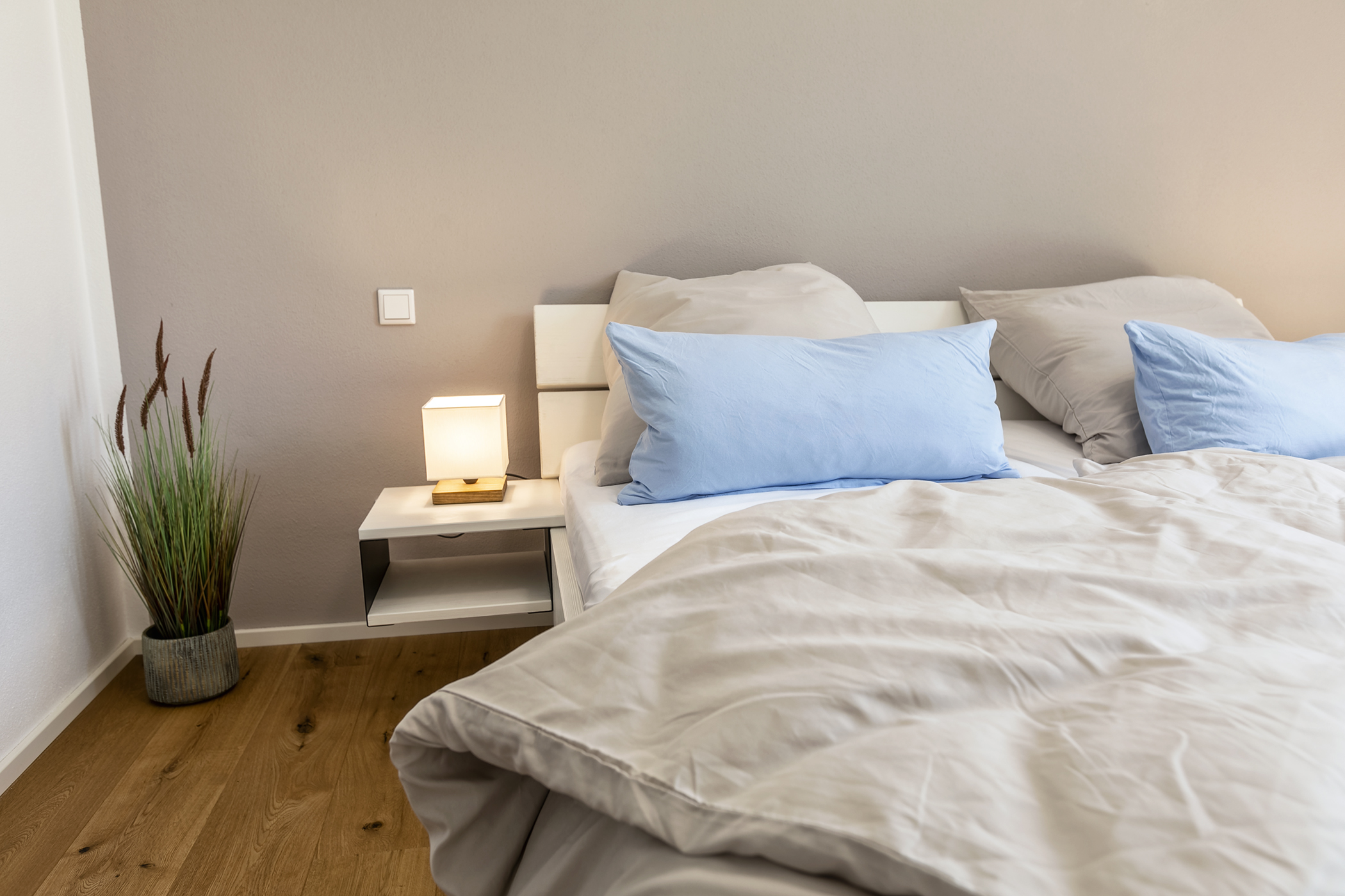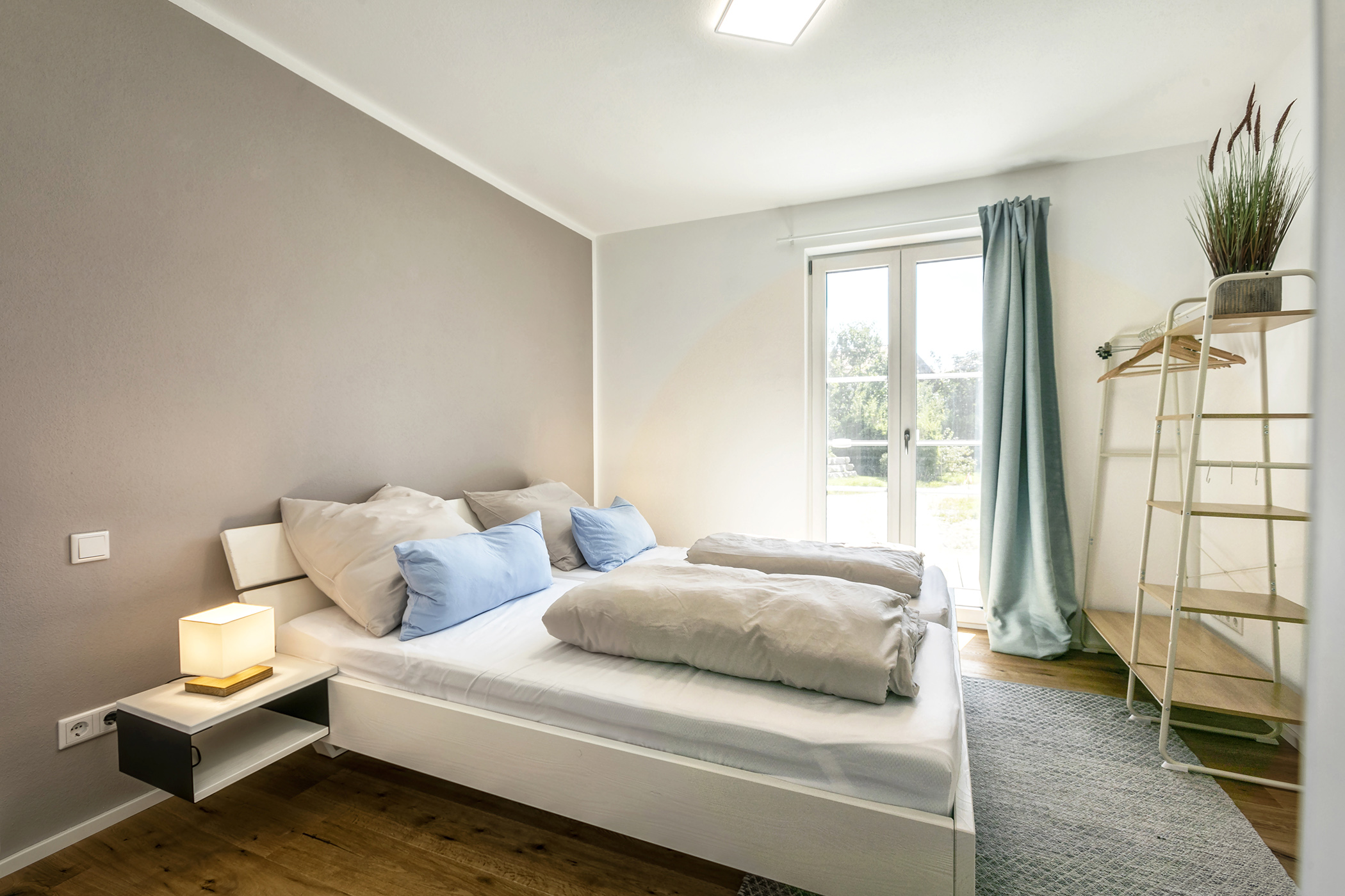 Wir haben ein gemütliches Schlafzimmer mit einem Doppelbett mit Zugang zur Terrasse. Gerne können wir Ihnen ein Beistellbett für ein Baby dazu stellen.