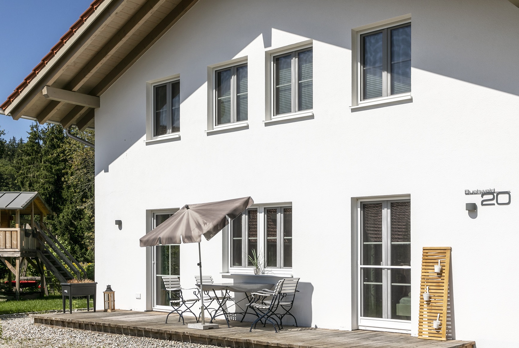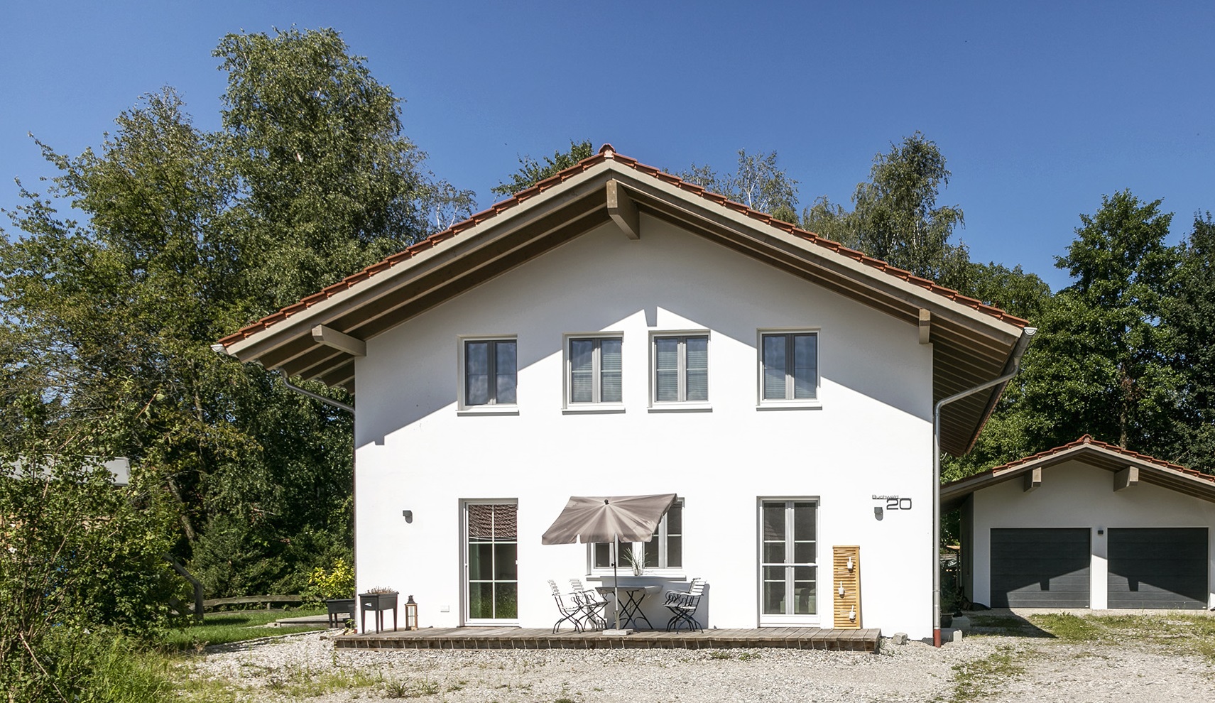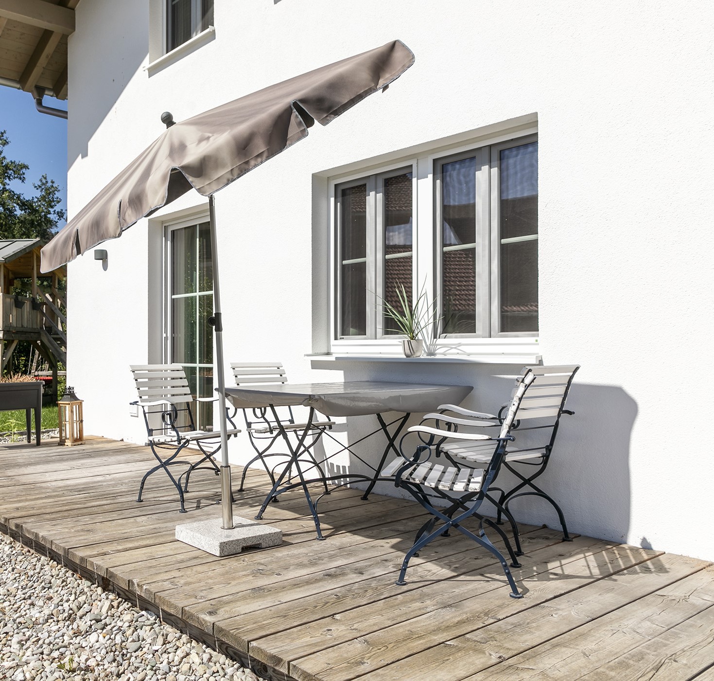 Unser Haus liegt ruhig gelegen am Ende einer Sackgasse und bietet Ihnen eine Erdgeschosswohnung mit schöner Sonnenterrasse für Ihr Frühstück.