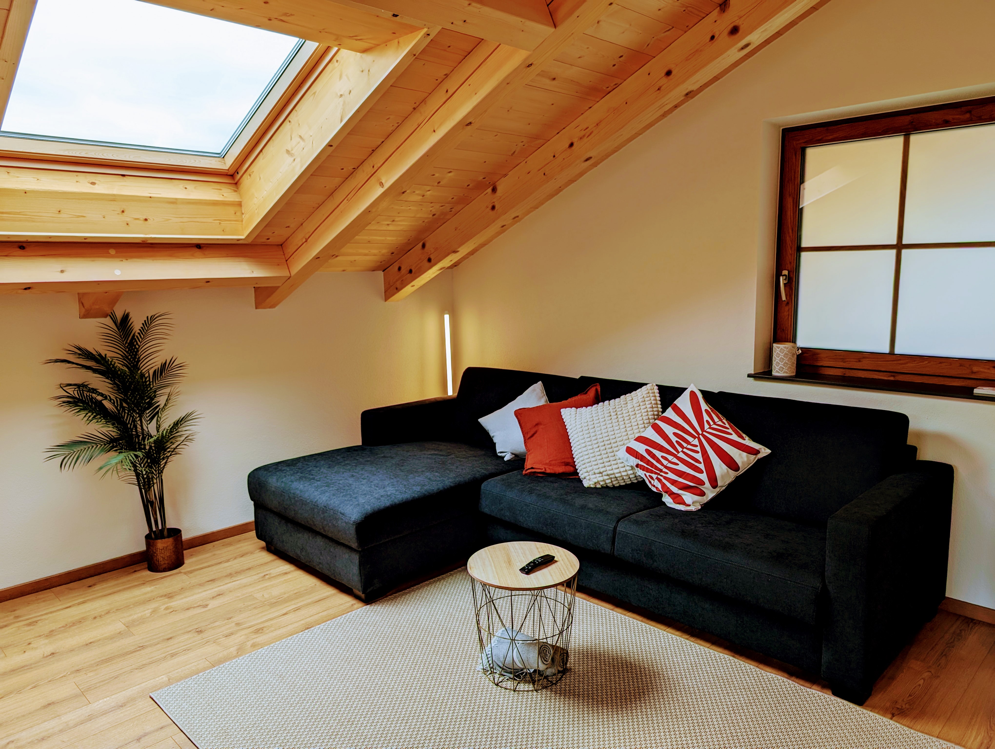 Eine geräumige 4-Sitzer-Schlafcouch, mit einer integrierten 1,50 m breiten Matratze, bietet Platz für weitere 2 Personen. Ein großer Flatscreen (Smart-TV) sorgt für Unterhaltung.