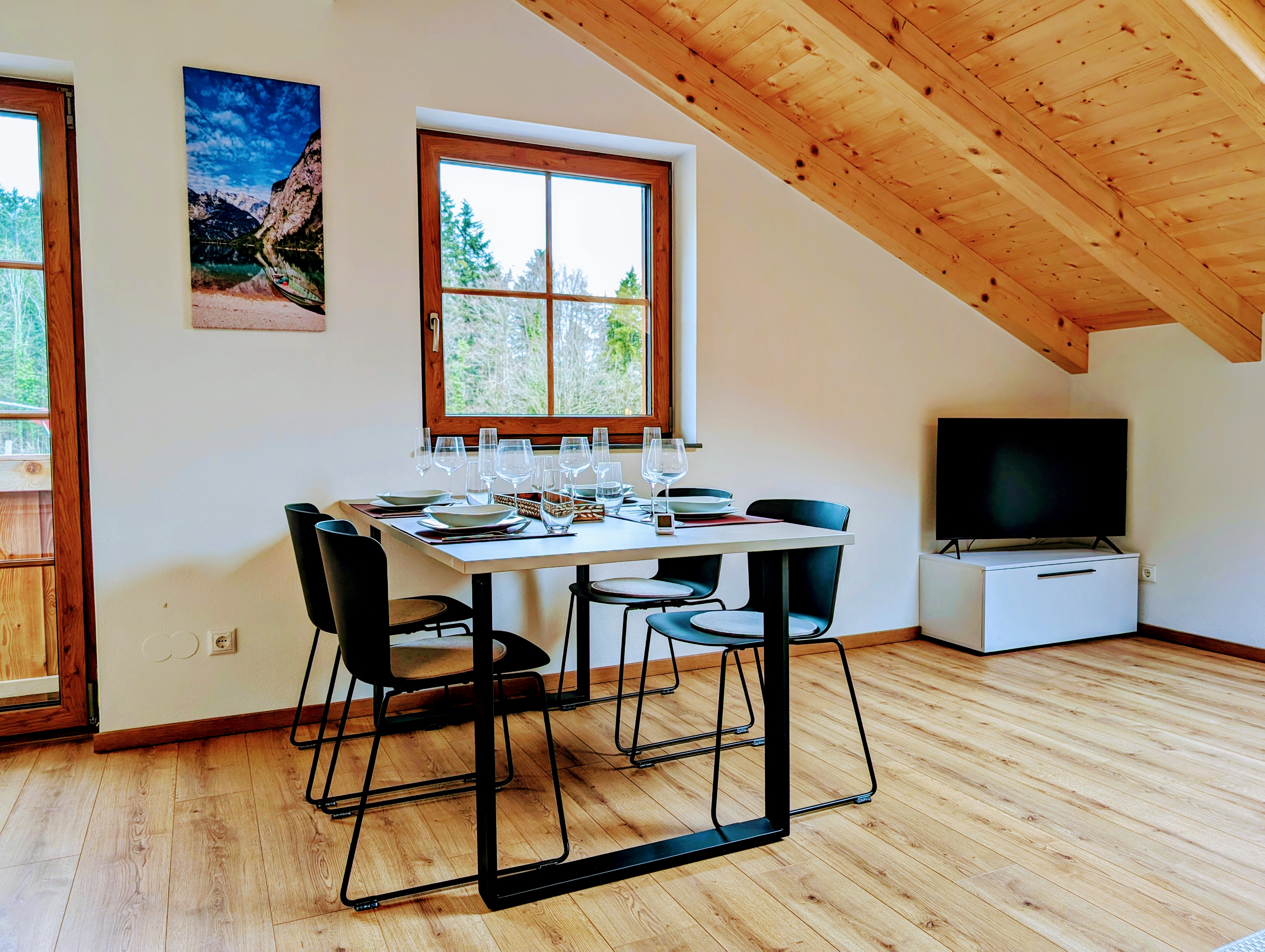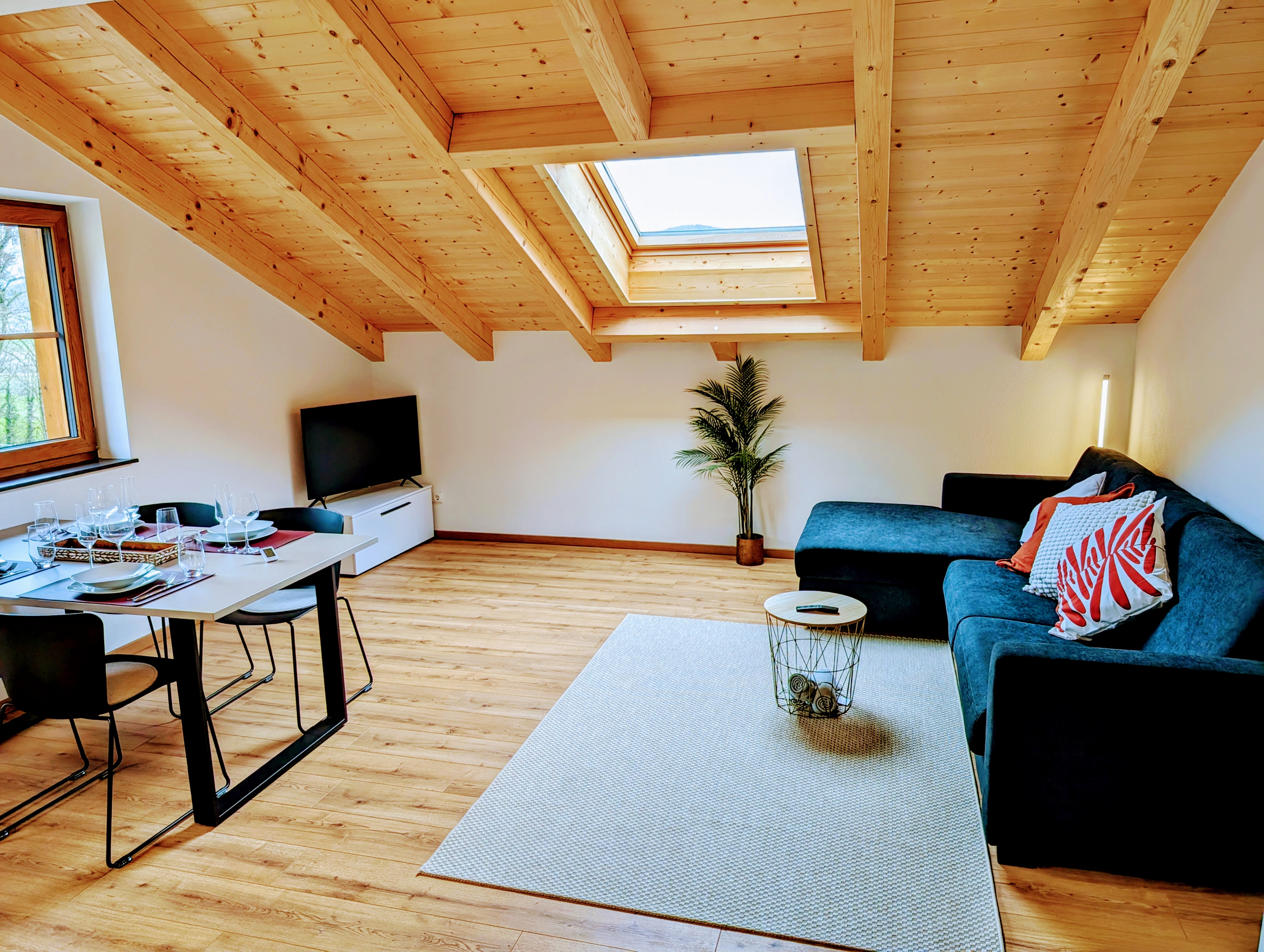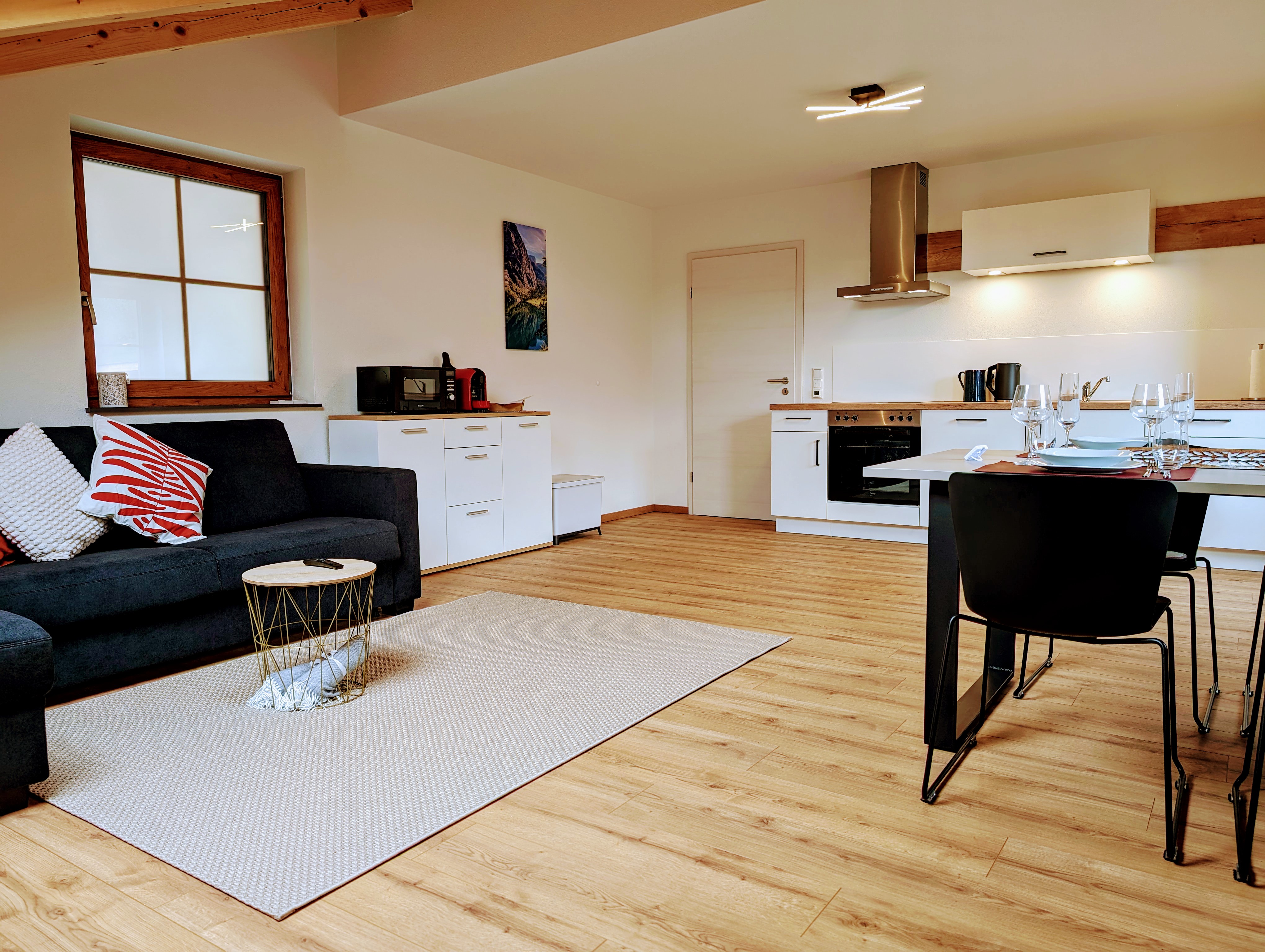 Die moderne Wohnküche lädt zum gemeinsamen Kochen und Essen ein. Eine voll ausgestattete Küchenzeile steht zur Verfügung, ebenso wie ein großer Esstisch für bis zu 5 Personen.