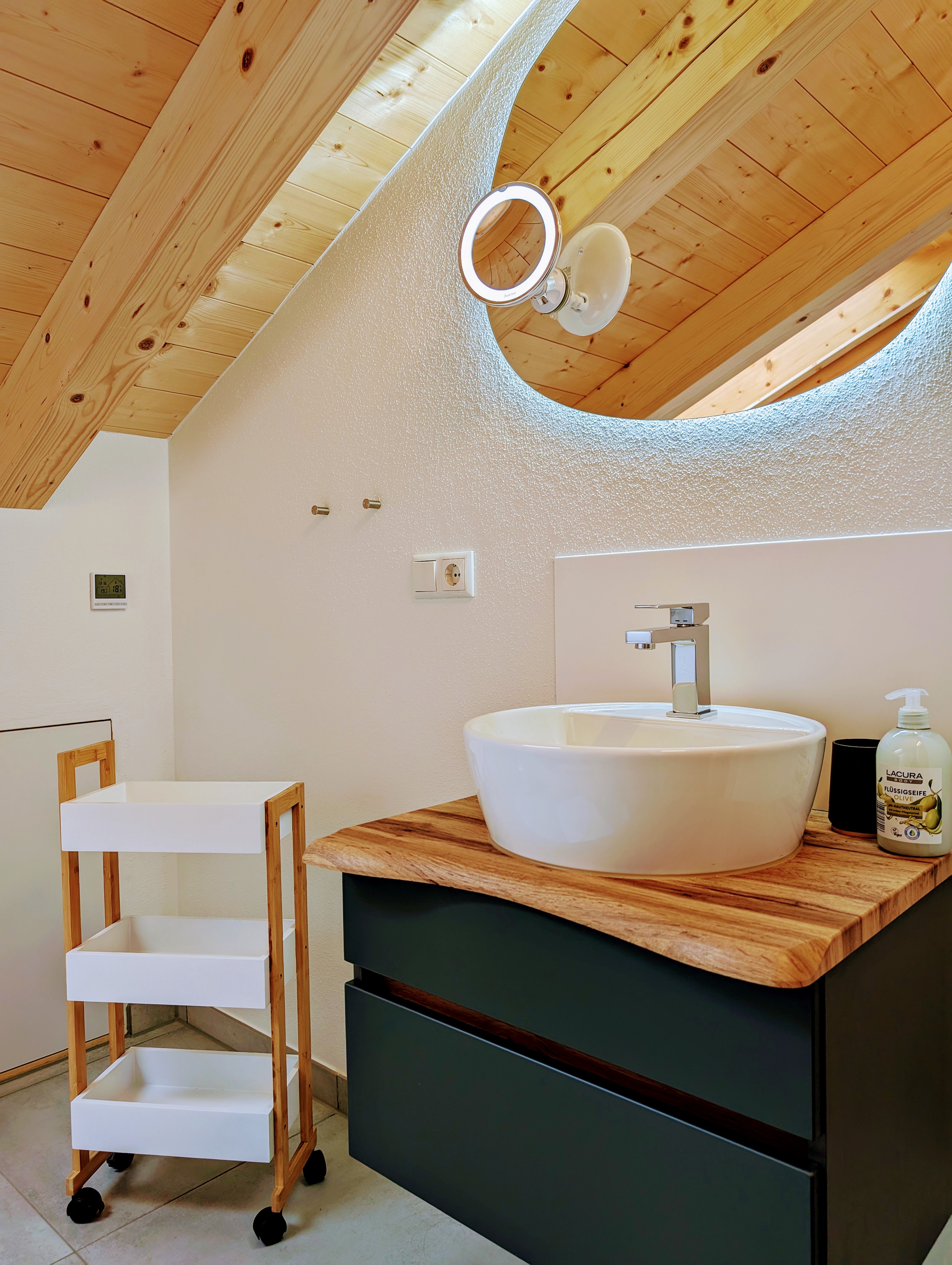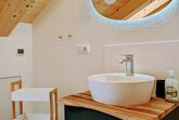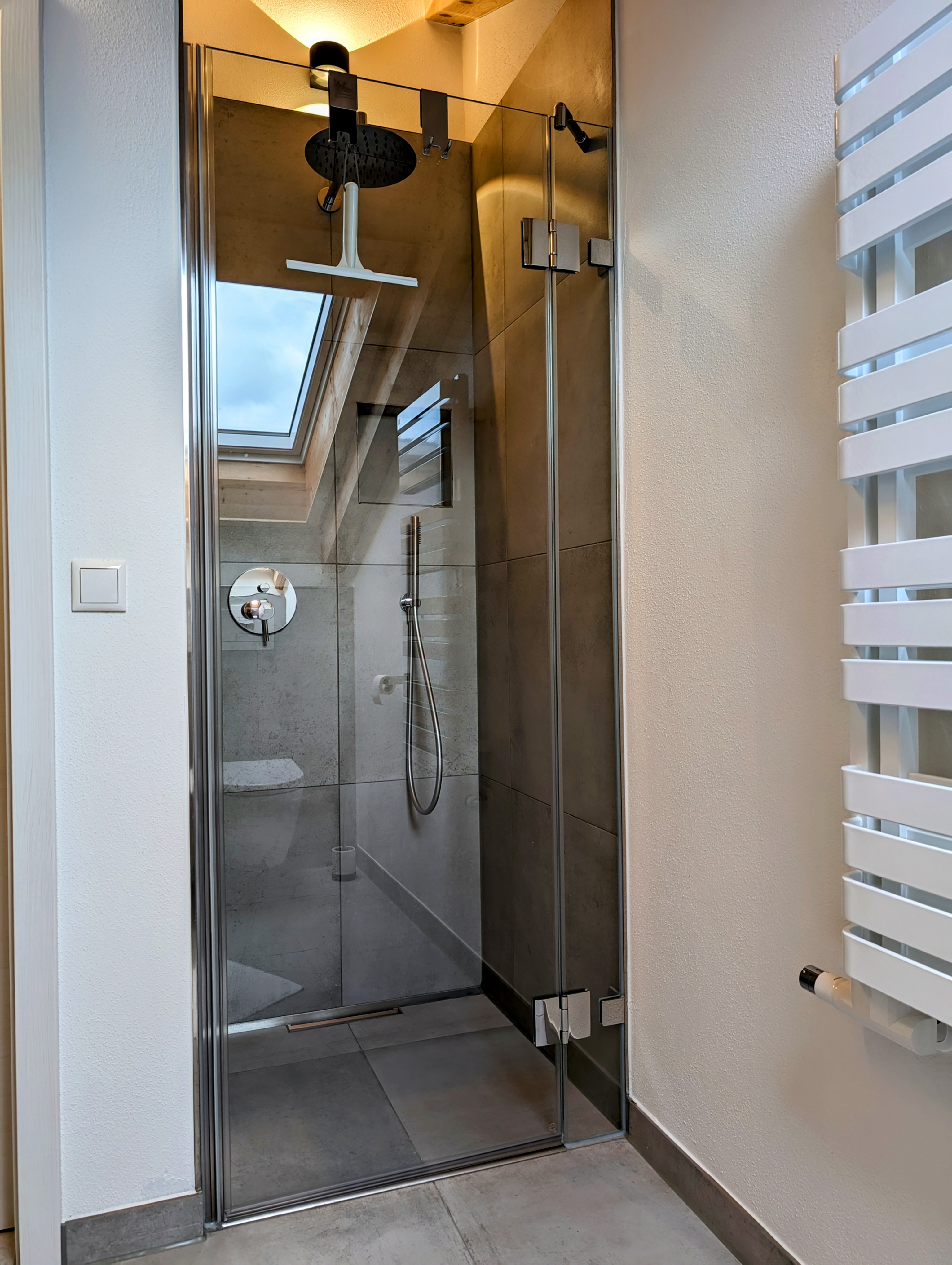 Das Badezimmer besitzt eine ebenerdig begehbare Regendusche, einen Waschtisch und ein WC.