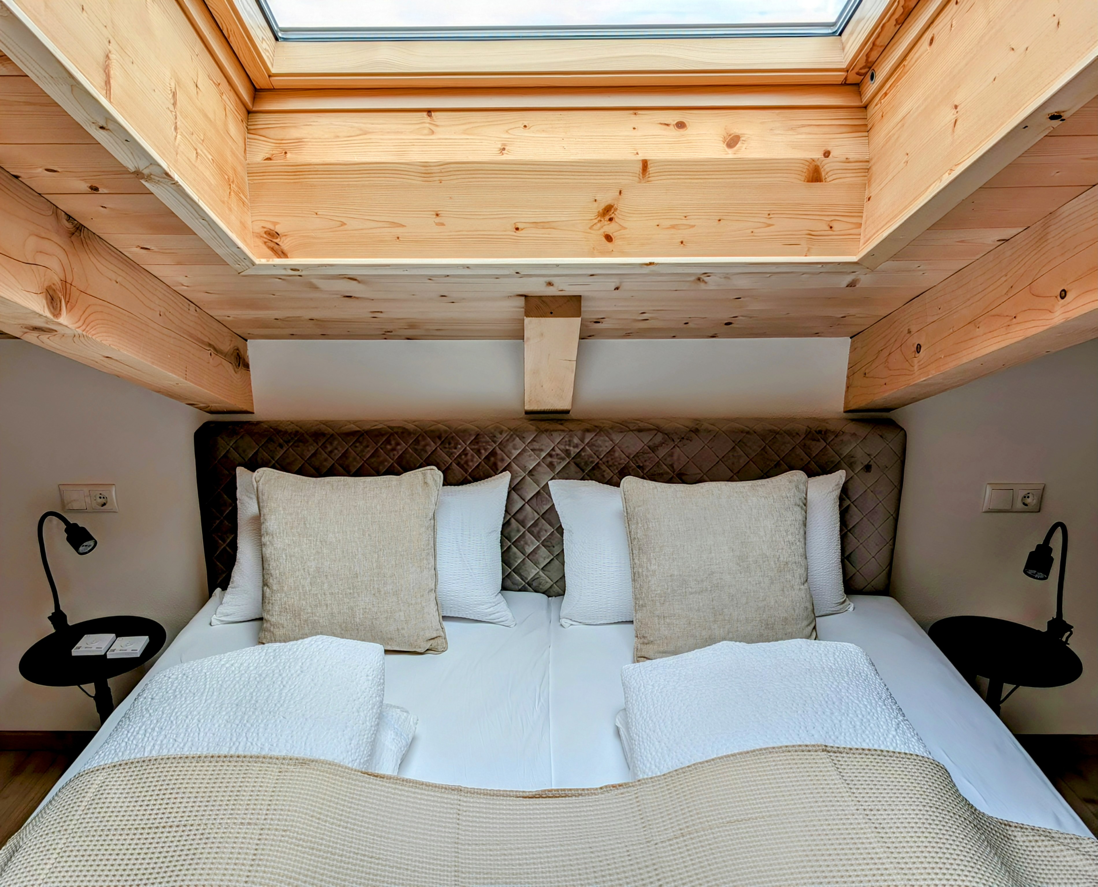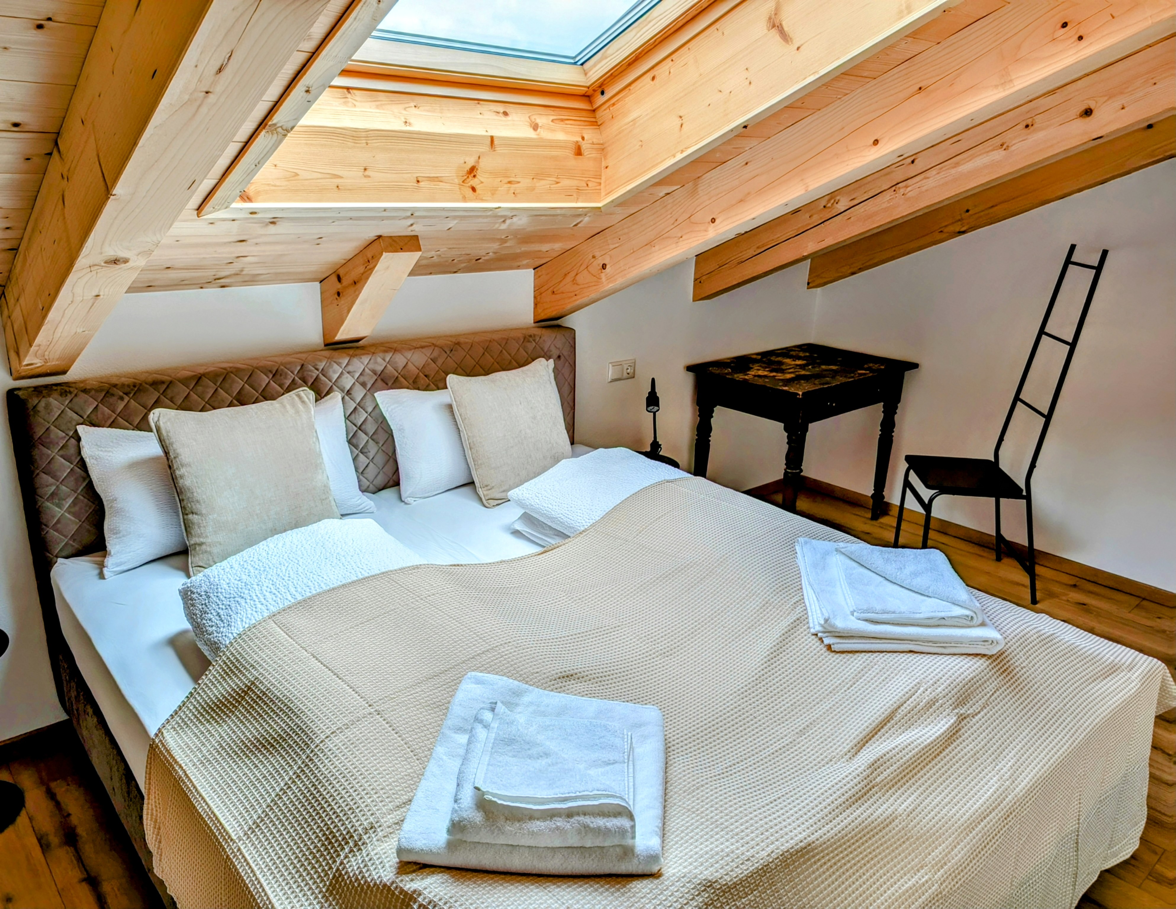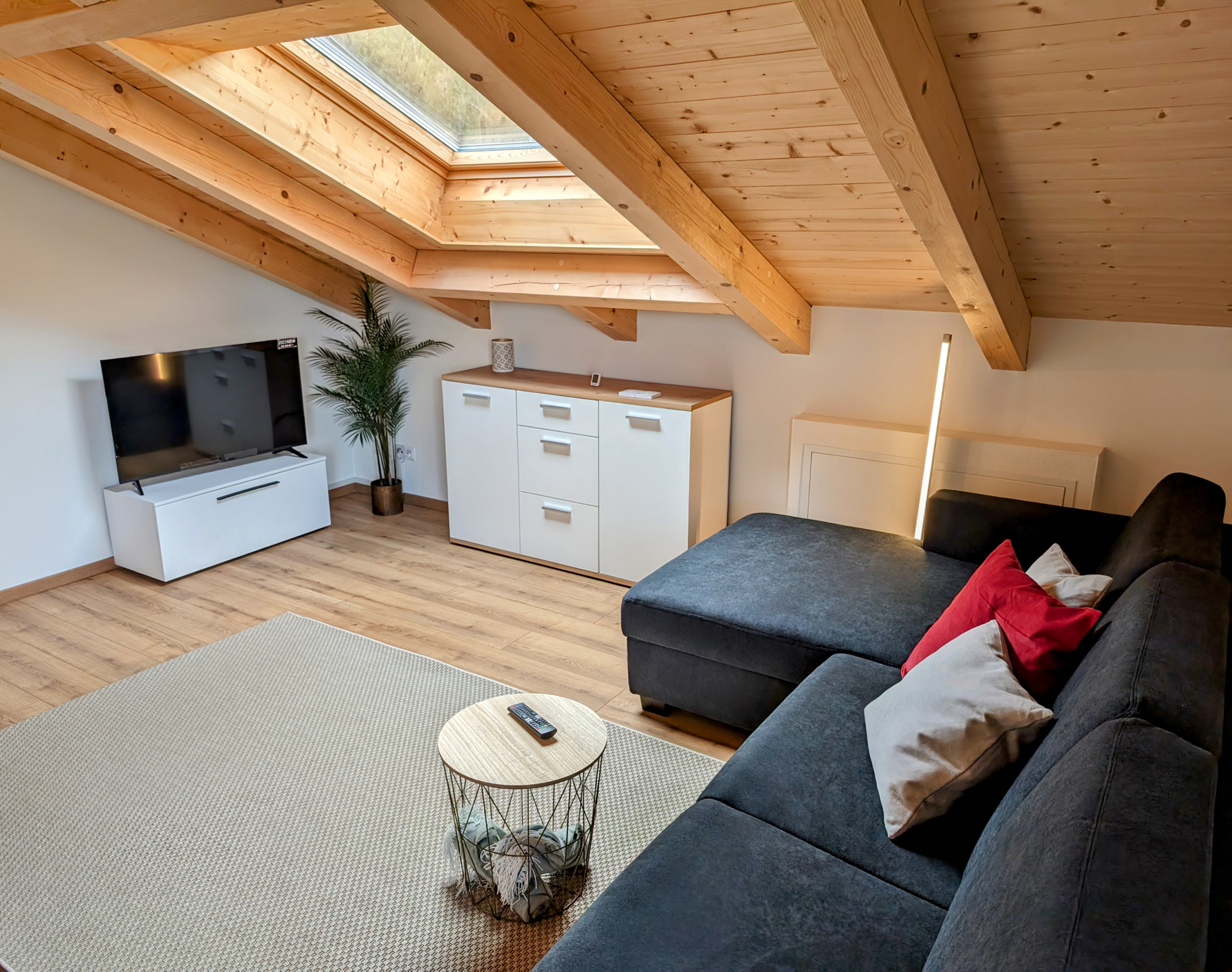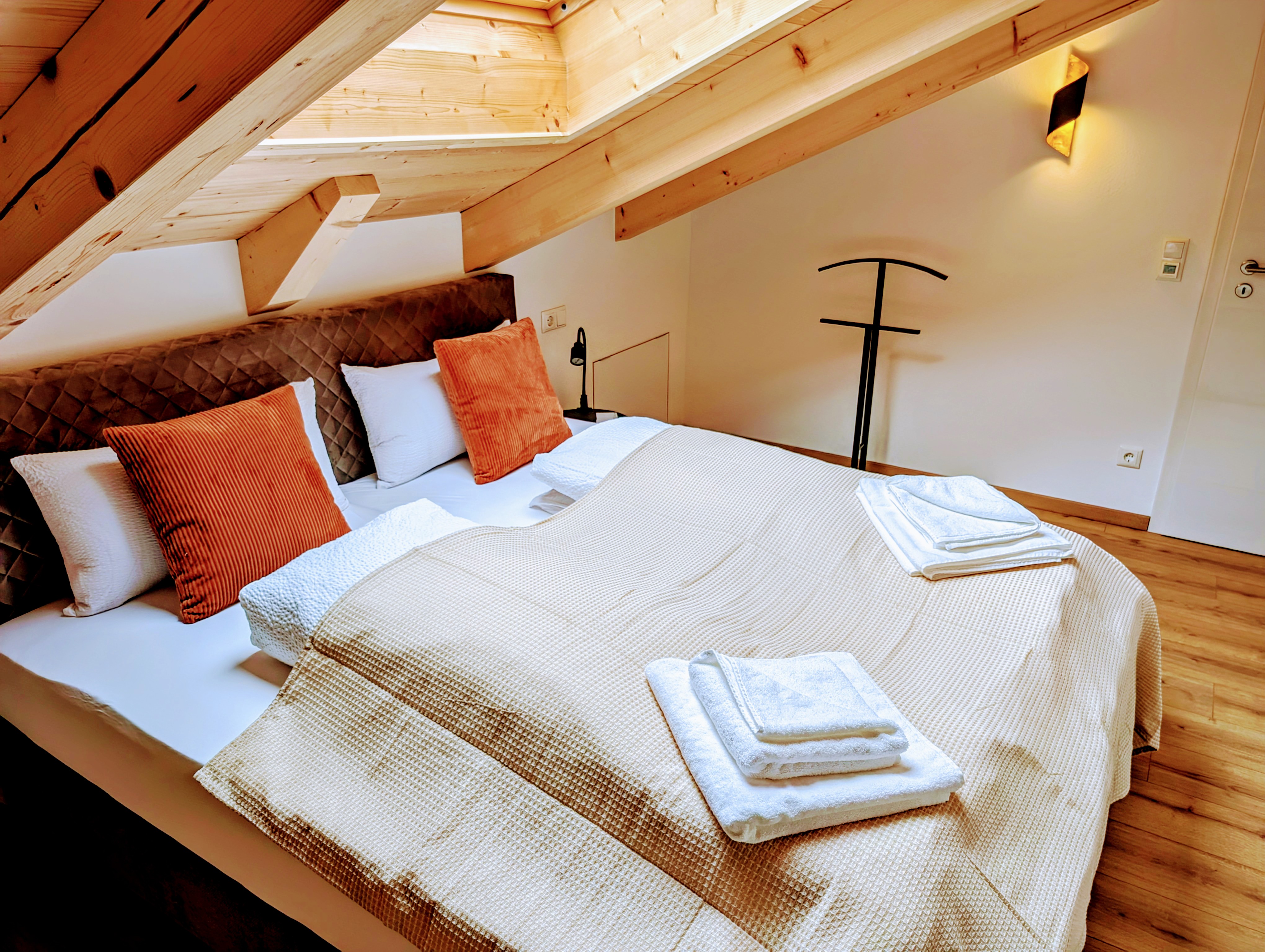 Willkommen in unserer gemütlichen Dachgeschoss-Suite Himmelszelt (65 qm) , die Platz für bis zu 6 Personen bietet.