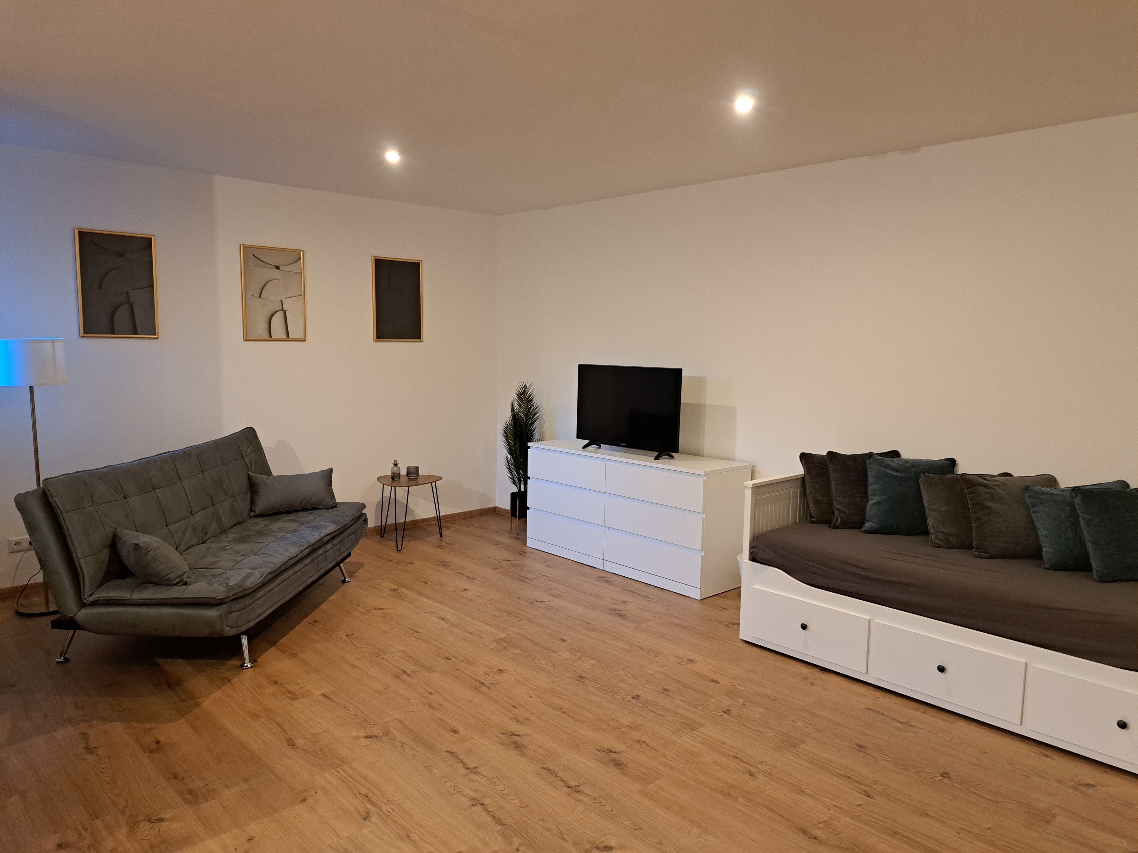 Die helle 64qm große Ferienunterkunft befindet sich im Souterrain eines Einfamilienhauses. Mit eigenem Eingang und zwei Parkplätzen. Die Wohnung ist modern ausgestattet und verfügt über eine offene Küche, ein Badezimmer mit begehbarer Dusche, ein separates Schlafzimmer mit Doppelbett, sowie einem Wohn-Essbereich. Das ausziehbare Tagesbett von 1,60 Breite, sowie eine Schlafcouch lassen 3 weitere Personen gemütlich schlafen. Am großen Esstisch haben natürlich alle Platz. Die Wohnung verfügt über Internet und einen Smart TV.