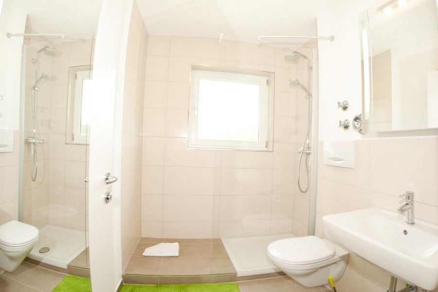 Tageslichtbad mit Fenster, barrierefreier Dusche und Handtuchheizkörper.
