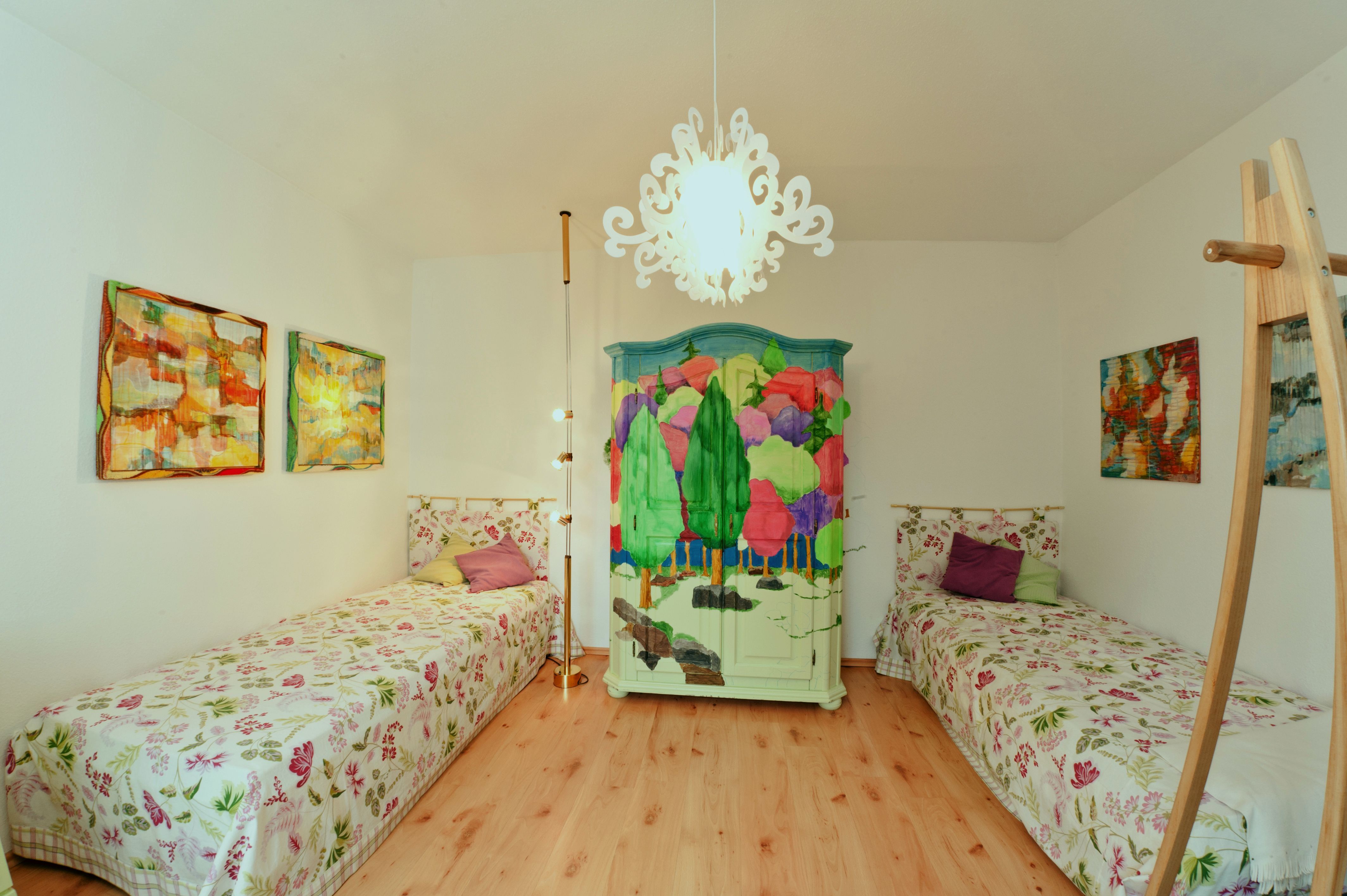 • zweites Schlafzimmer mit 2 Betten (0,90 x 1,00 m) und Waldlandschaft auf dem Kleiderschrank