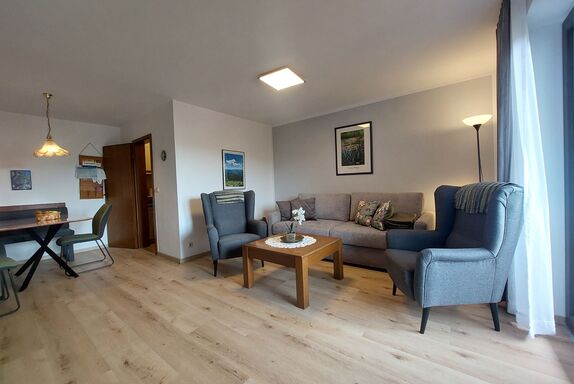 • Wohn- und Esszimmer mit hochwertigem Sofa (mit Schlaffunktion für die 3 + 4 Person), Essecke mit Tisch, Smart TV-Fernseher, Radio;