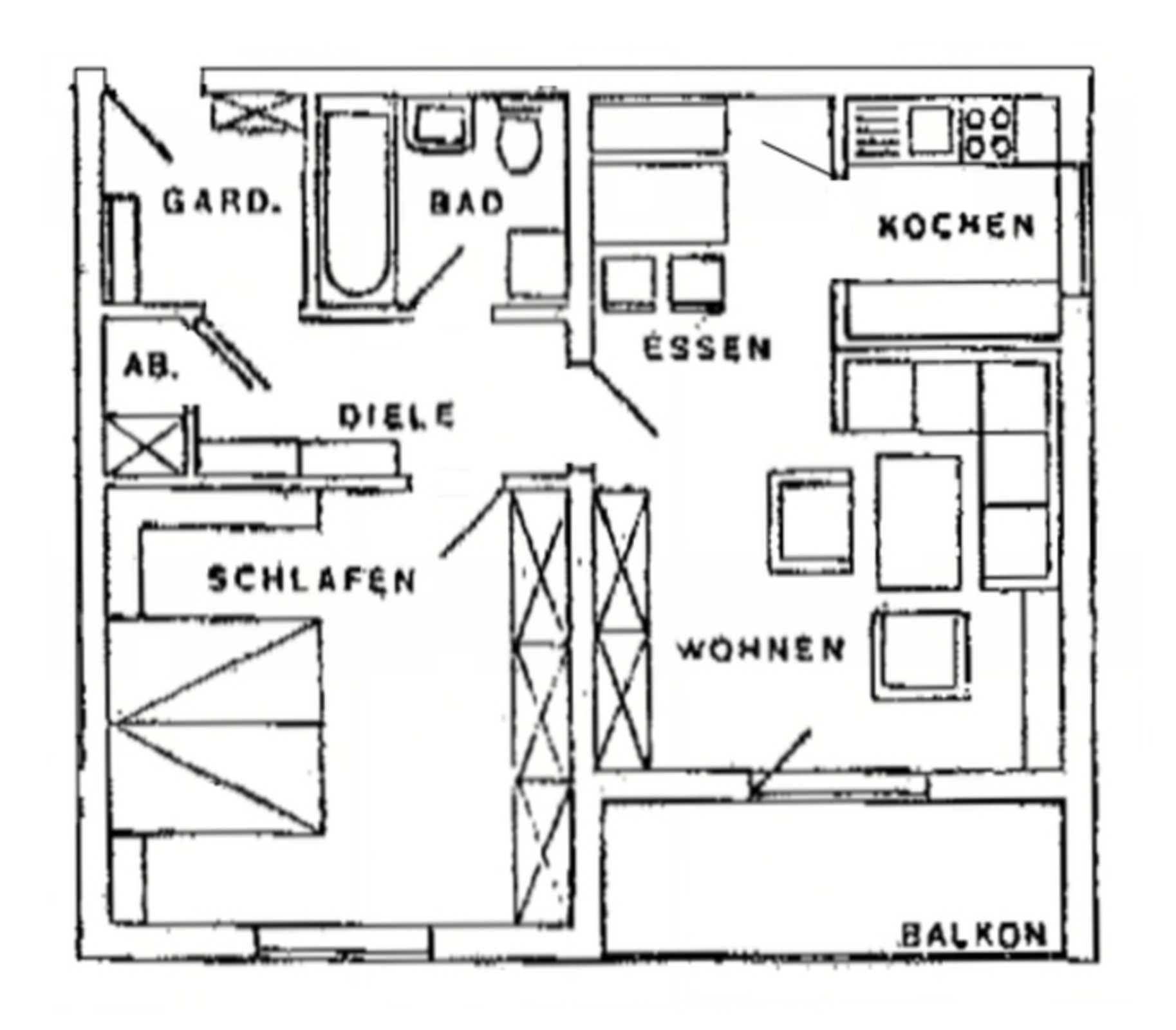 Die Wohnung wurde im Jahr 2024 frisch renoviert und teilweise neu ausgestattet. Die Wohnung Nr. 24 im 2 Obergeschoss verfügt über 1 Schlafzimmer mit Doppelbett (180 x 200), 1 Flur, 1 Küche, 1 Badezimmer mit Badewanne Waschmaschine, 1 Wohnzimmer mit Essplatz und Zugang zum Balkon.