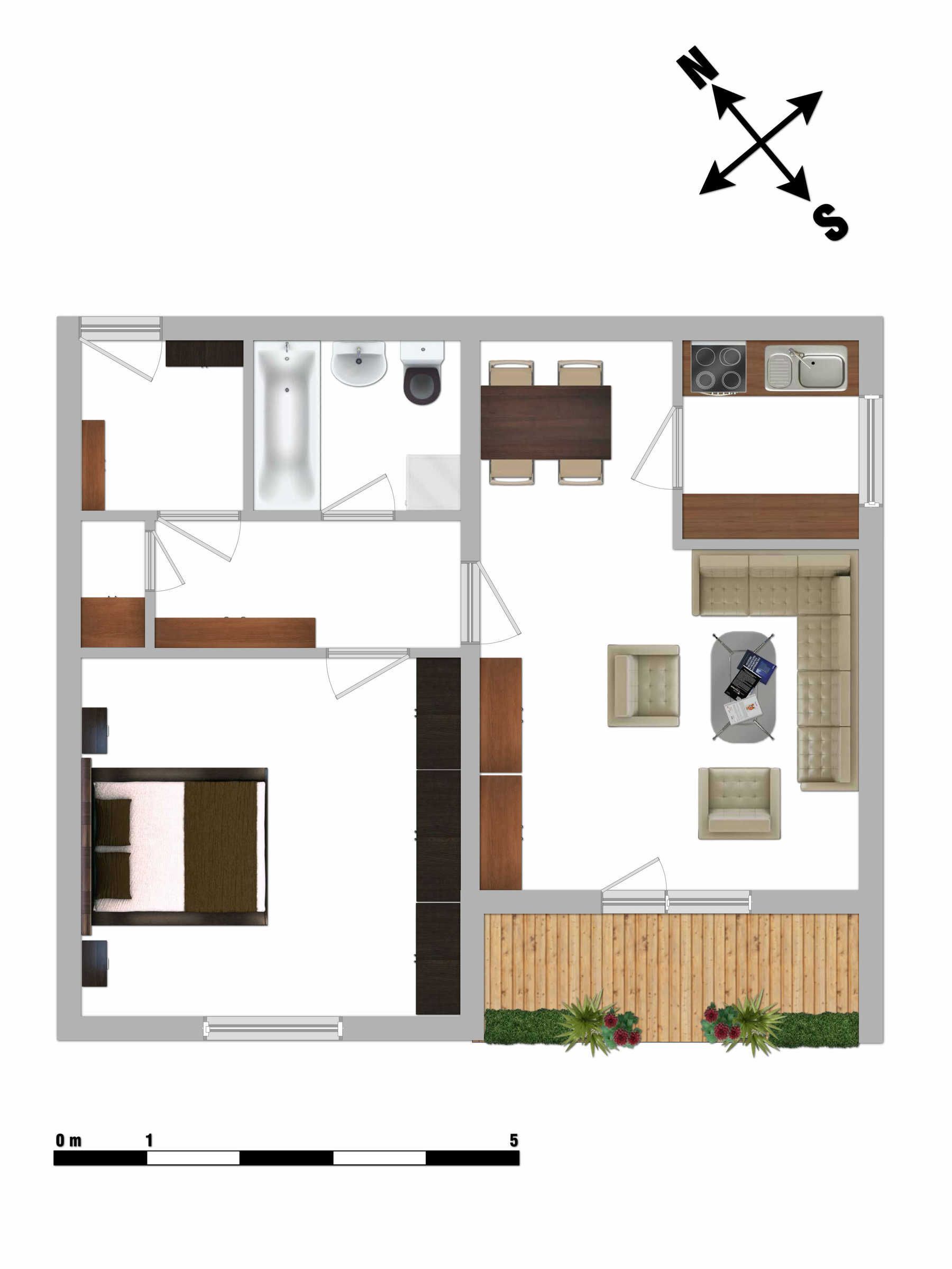 • Wohn- und Schlafzimmer haben einen Designplankenbelag, die anderen Räume haben einen Fliesenbelag,