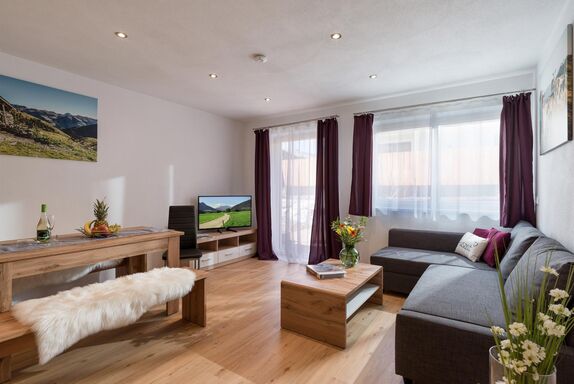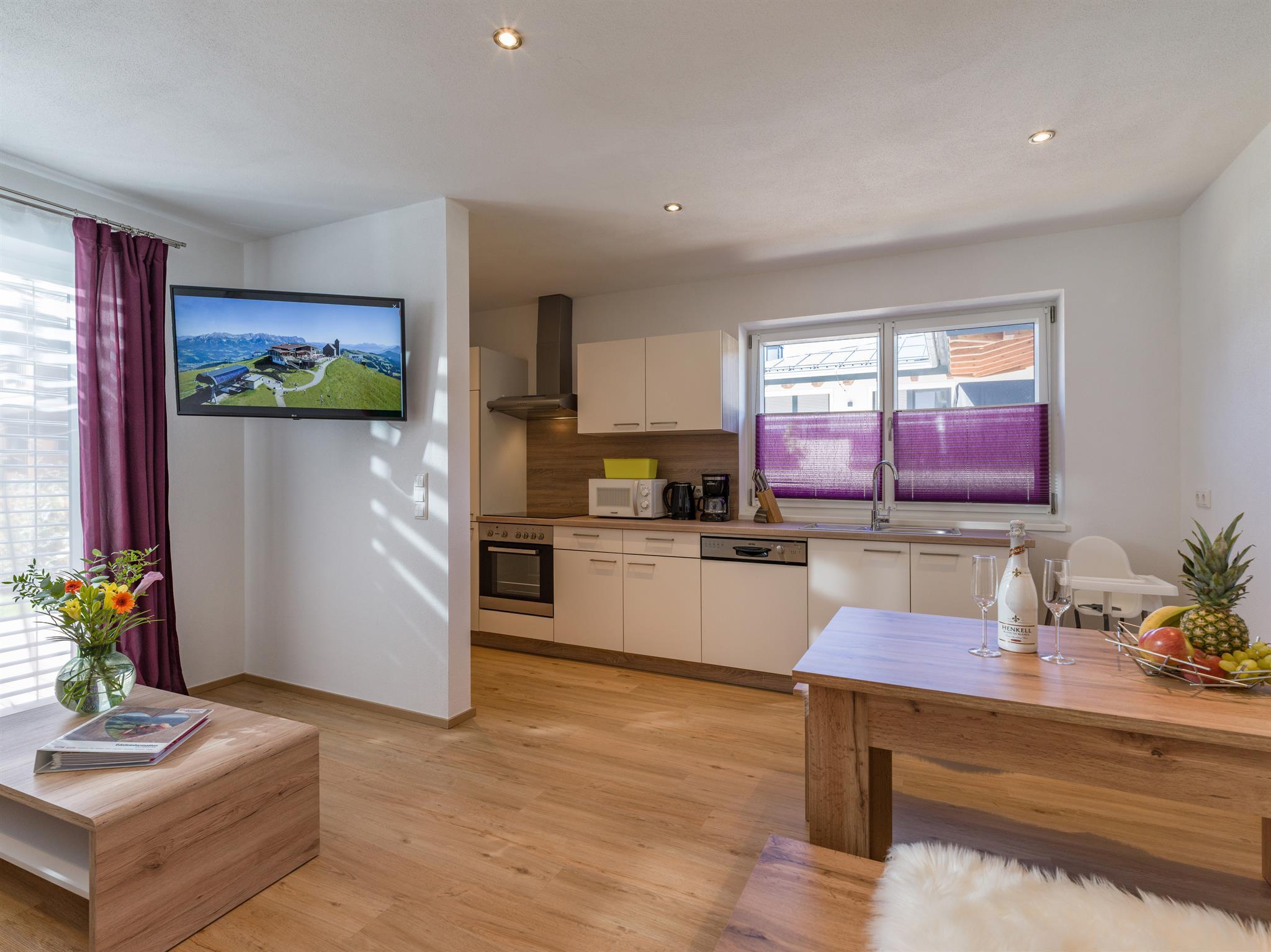 Unsere großzügige Ferienwohnung „Wilde Kaiserin“ besteht aus einer großzügigen Wohnküche mit Essecke und TV und ist komplett ausgestattet (Geschirrspüler, Kaffeemaschine, Wasserkocher, Herd, Backofen etc.). In unseren 2 Schlafzimmern mit Doppelbett und unserer bequemen Schlafcouch können bis zu 6 Personen komfortabel träumen. Ein Badezimmer mit Dusche und Handtuchtrockner sowie ein separates WC stehen Ihnen zur Verfügung. Der absperrbare Skiraum befindet sich auf der selben Etage. Im abgetrennten Gartenbereich können Sie den Tag entspannt ausklingen lassen.