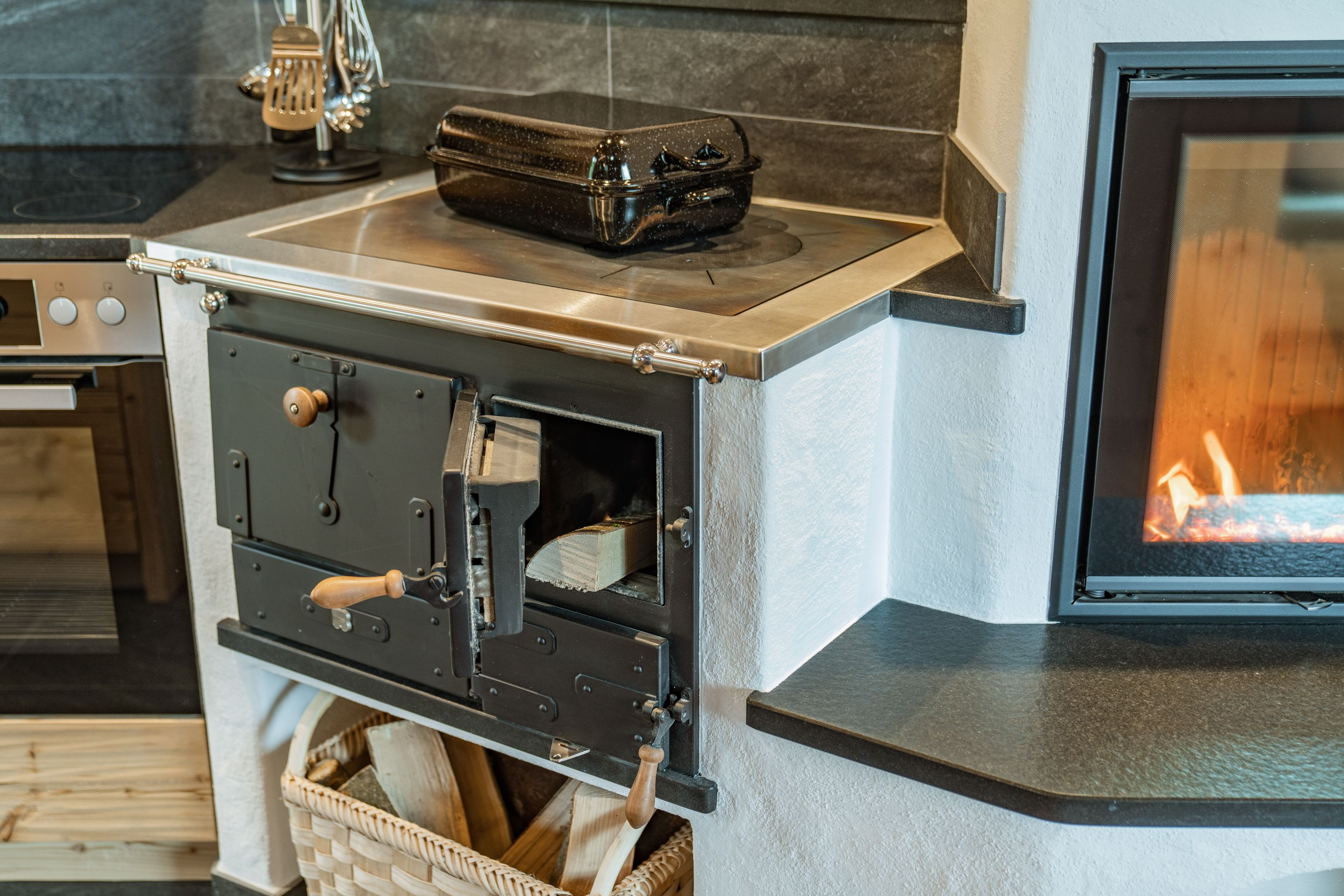 Küche: E-Herd mit Backofen, Holzofenherd, Mikrowelle, Kühlschrank mit Gefrierfach, Geschirrspüler, Wasserkocher und Nespresso-Kaffeemaschine