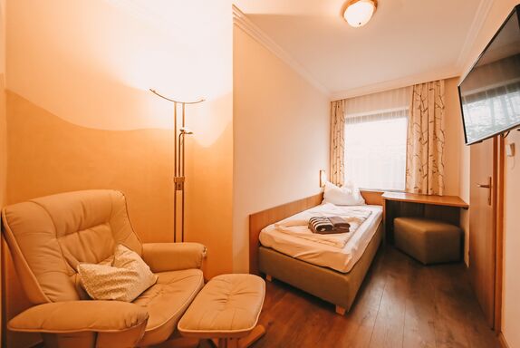 kleines Einzelzimmer im Stammhaus ohne Balkon, mit Dusche und WC. Ideal als Ergänzung zu unseren Appartements aber auch für Einzelreisende.