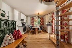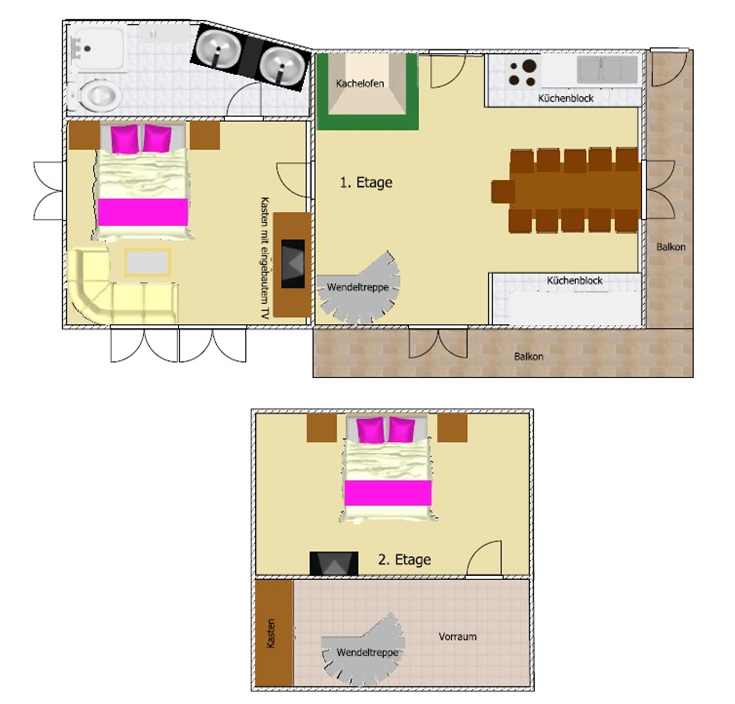 ca. 50 m², 1 - 2 Schlafräume, Wohnküche mit Kamin, voll ausgestatteter Küchenblock, Geschirrspüler, Backofen und Mikrowelle, abtrennbares Wohnzimmer, Bad mit Dusche/WC, Balkon, Garten