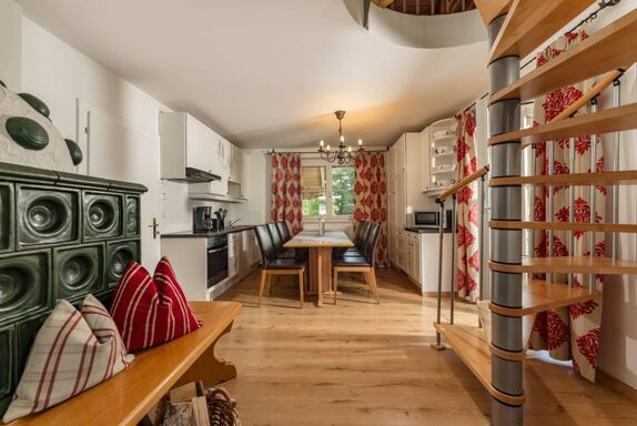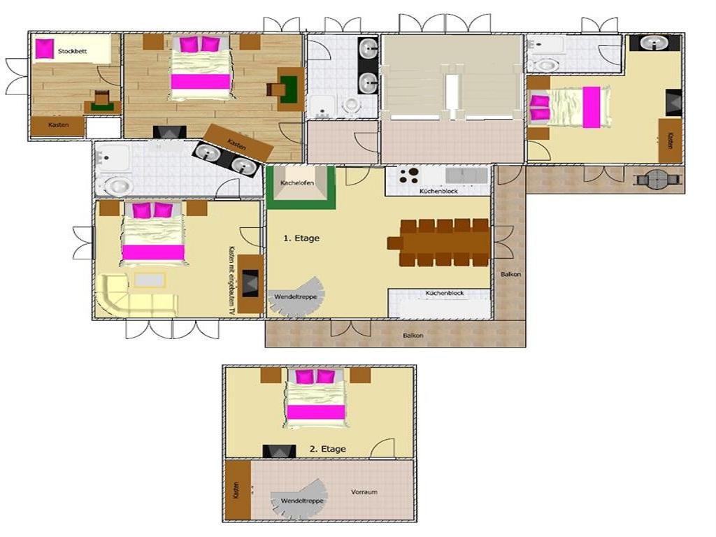 ca. 100 - 120 m², max. 10 Personen, Wohnküche mit voll ausgestattem Küchenblock, Geschirrspüler, Backofen, Mikrowelle, Kamin, 5 getrennte Schlafräume, teilweise mit Stockbetten, 3 Bäder mit Dusche/WC