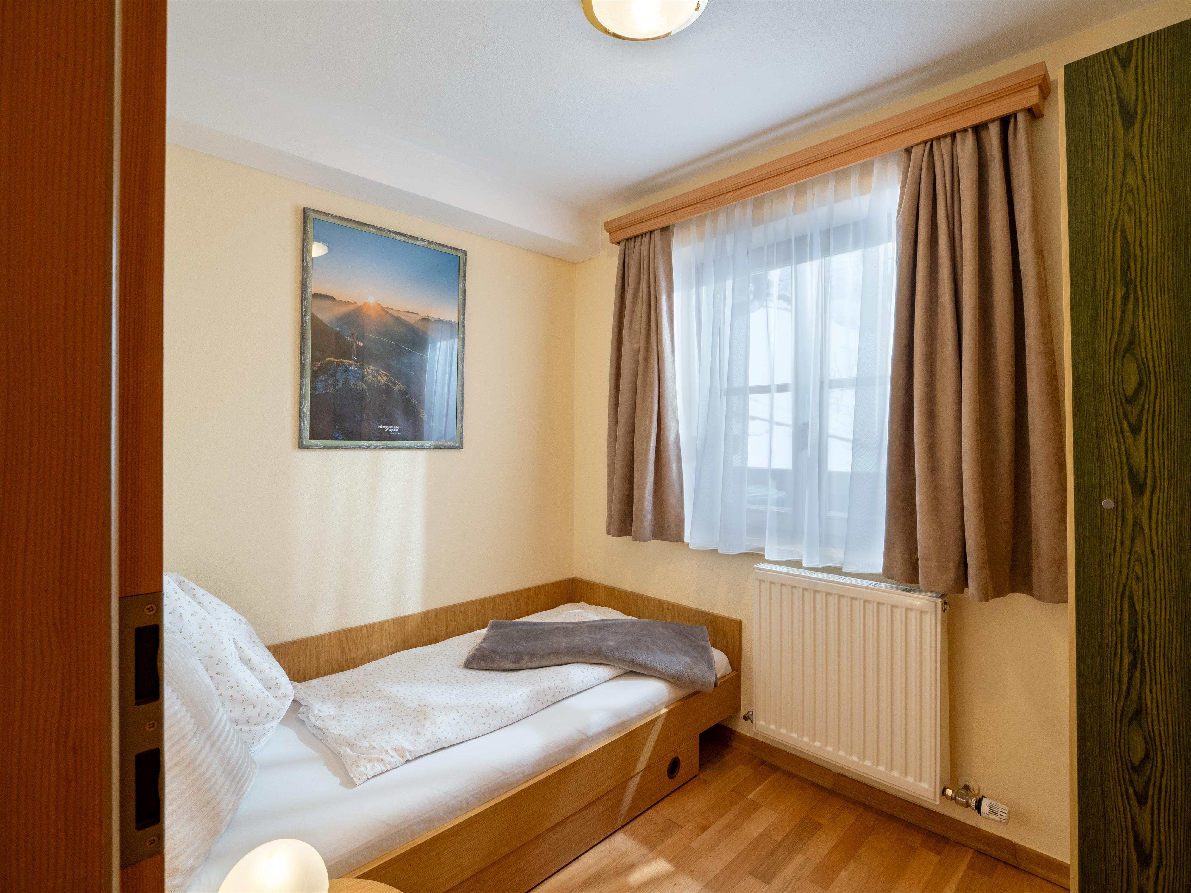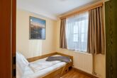 Raumaufteilung: vollausgestattete Wohnküche (Schlafcouch bei einer Belegung von 5 Personen), Badezimmer mit WC, großes Schlafzimmer für 3 Personen, Einzelzimmer, Eingangsbereich mit Garderobe, sonniger Balkon mit Balkonmöbel