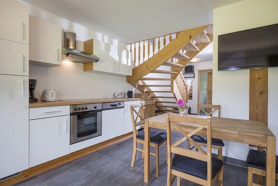 Die 65 m² große Wohnung ist über den seitlichen Aufgang des Bauernhauses erreichbar.