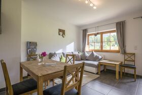 Im Wohnraum steht eine Couch zum Chillen und ein Essbereich mit genügend Platz zum gemütlichen zusammensitzen.