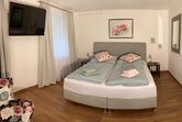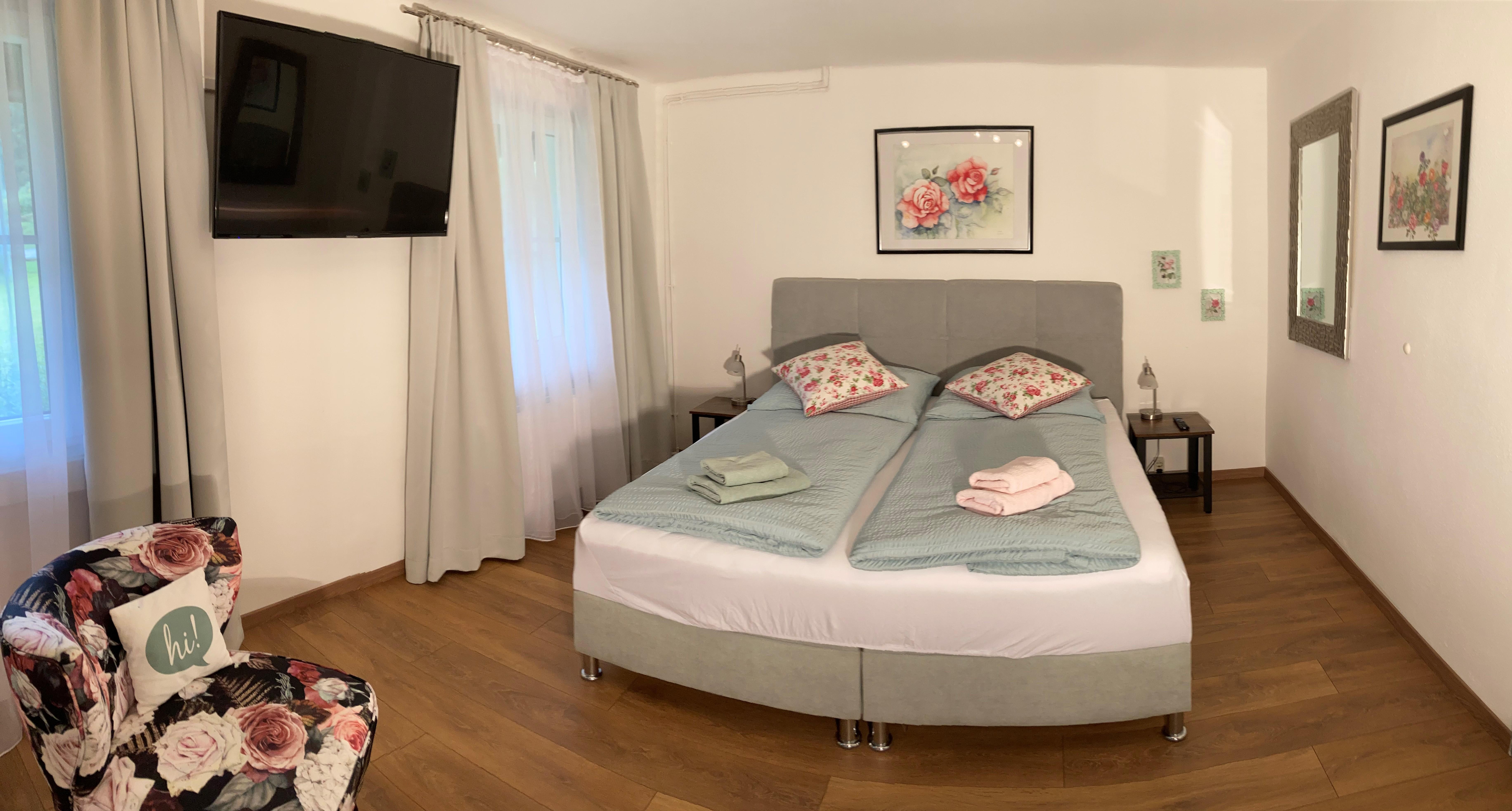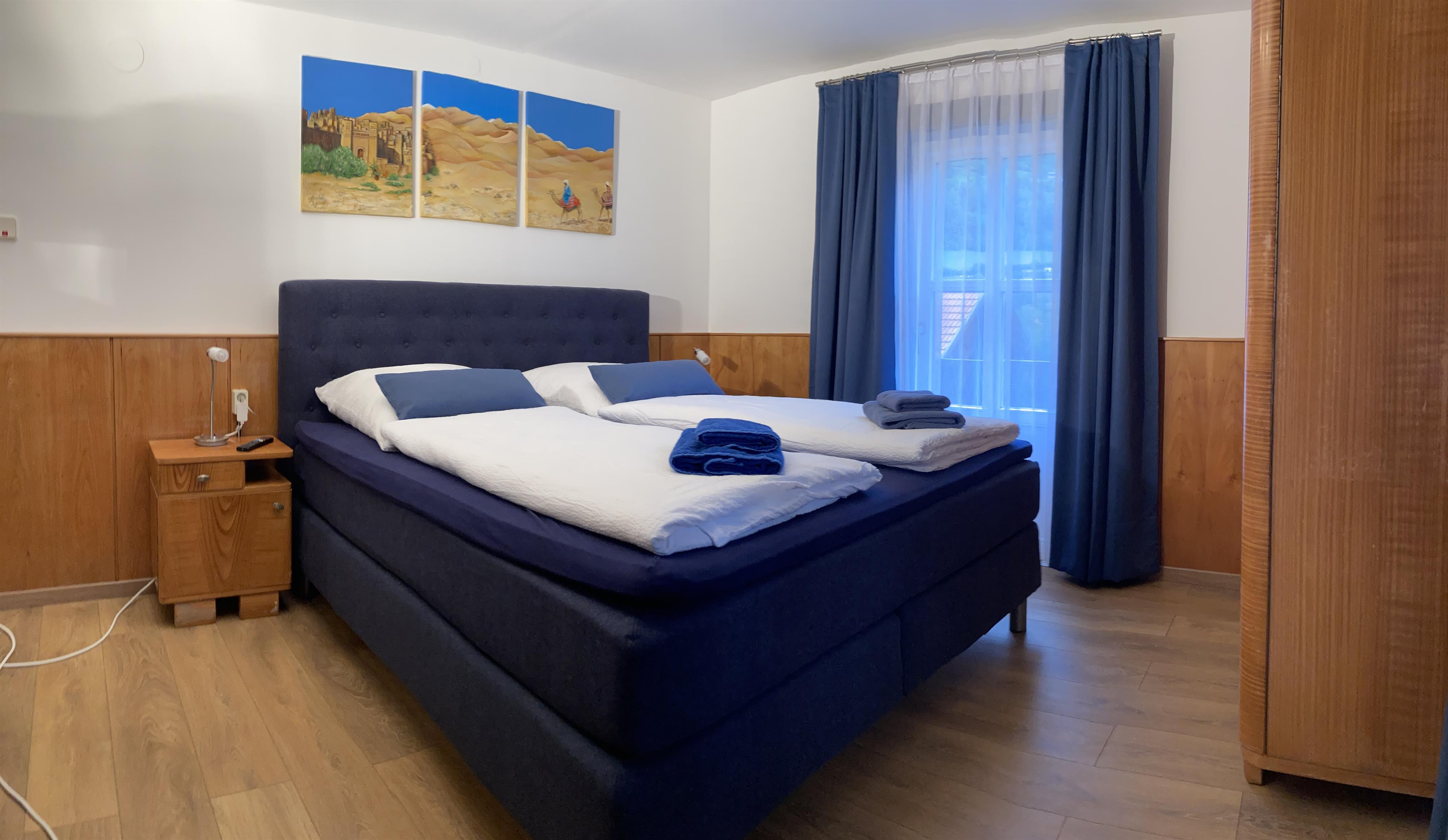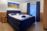 1 Schlafzimmer (2 Personen) mit modernem Doppelbett (Boxspringbetten), Kleiderschrank, Spiegel und Flat-TV