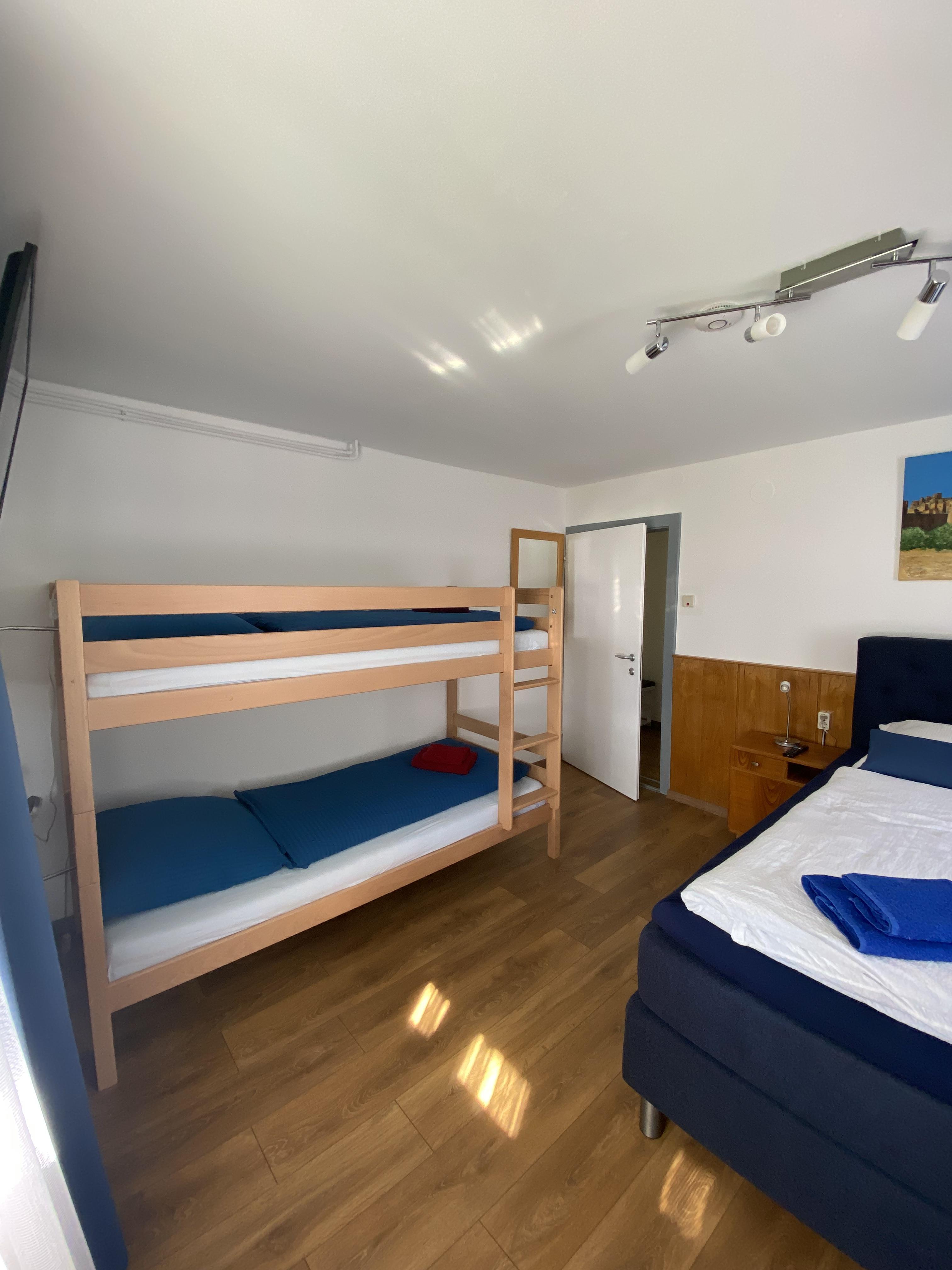 1 Schlafzimmer (4 Personen) mit Doppelbett und Etagenbett, Spiegel und Flat-TV