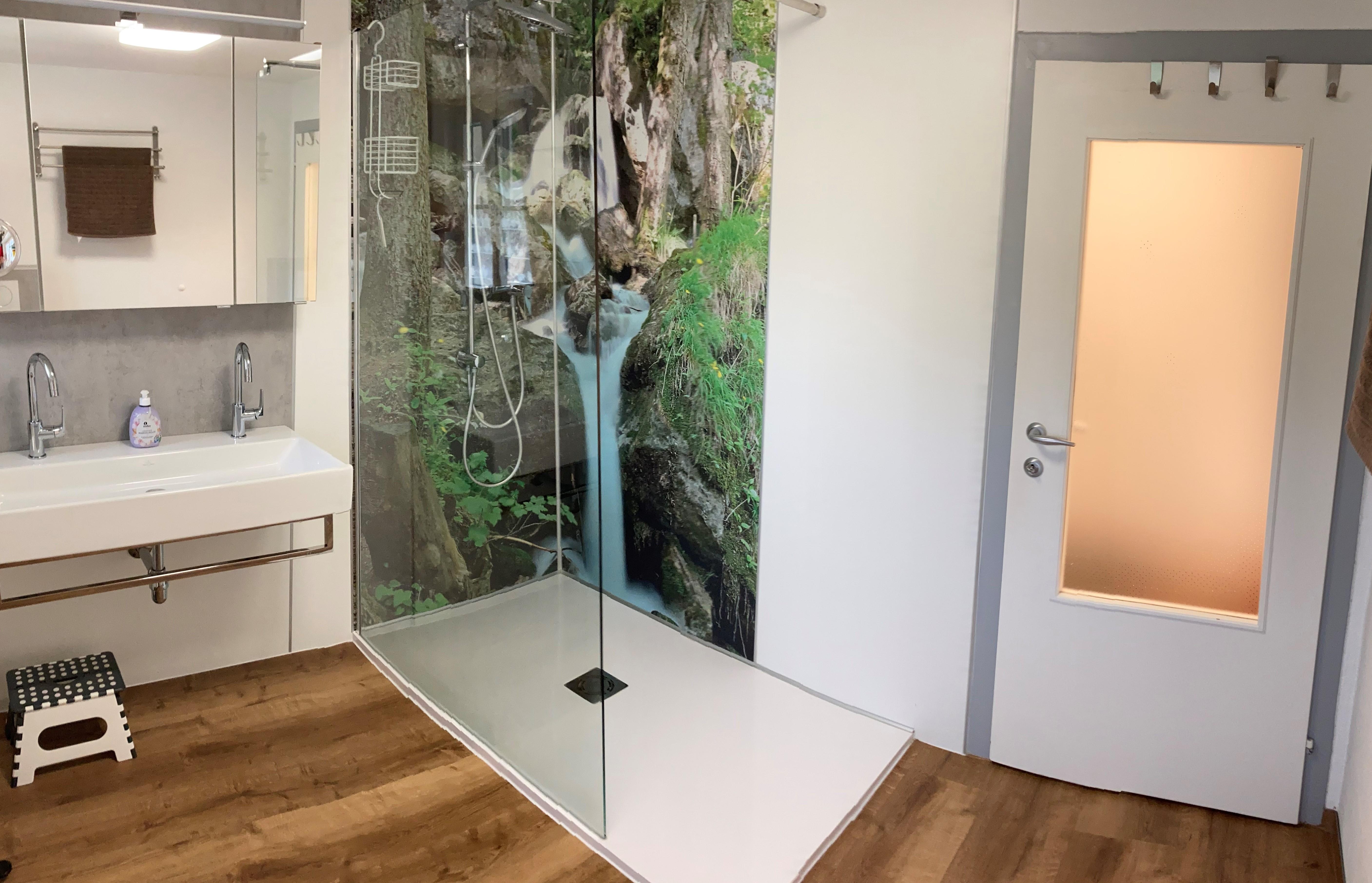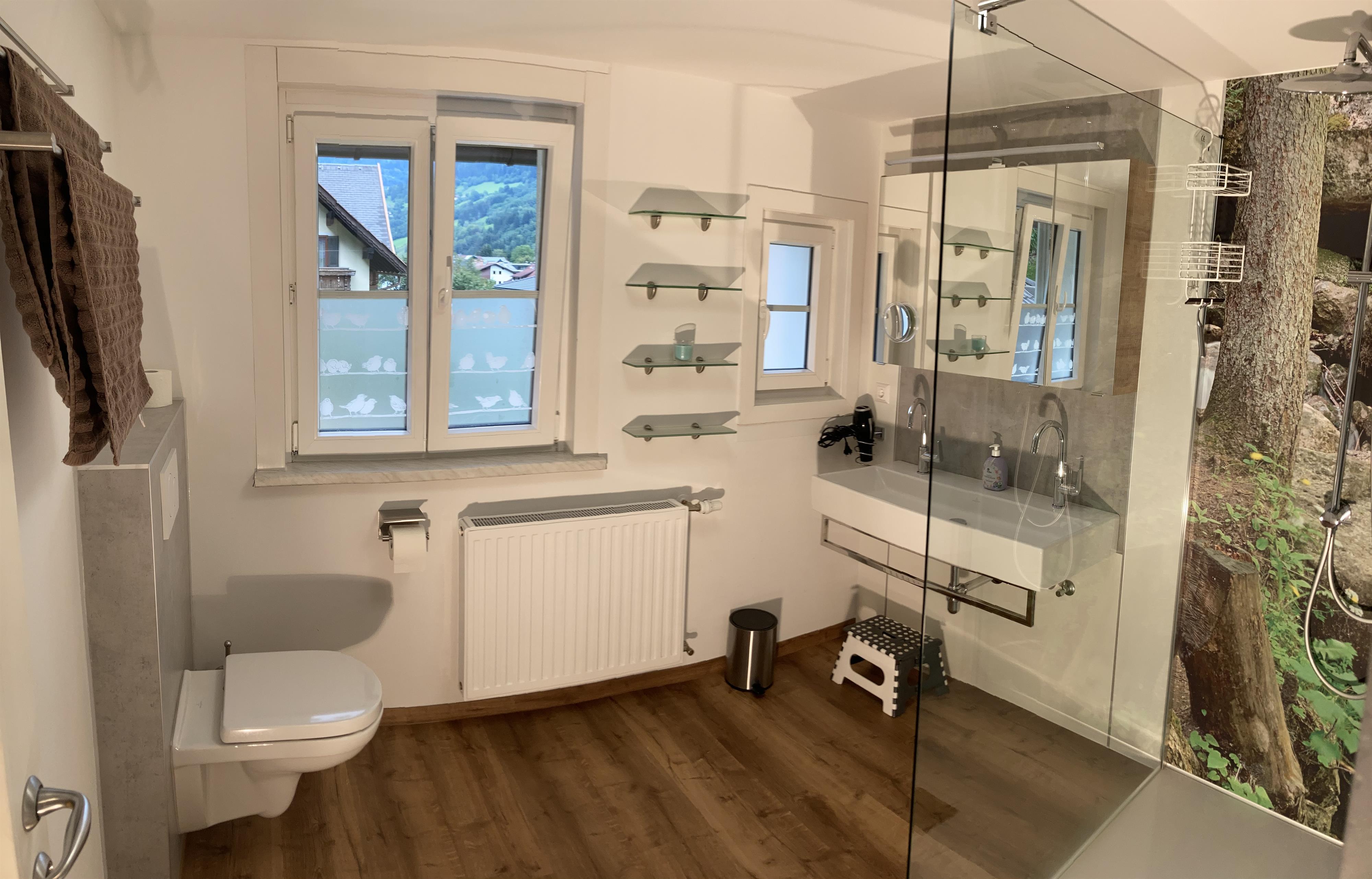 1 Badezimmer mit Badewanne, Dusche, WC, Waschbecken, Fön, Kosmetikspiegel