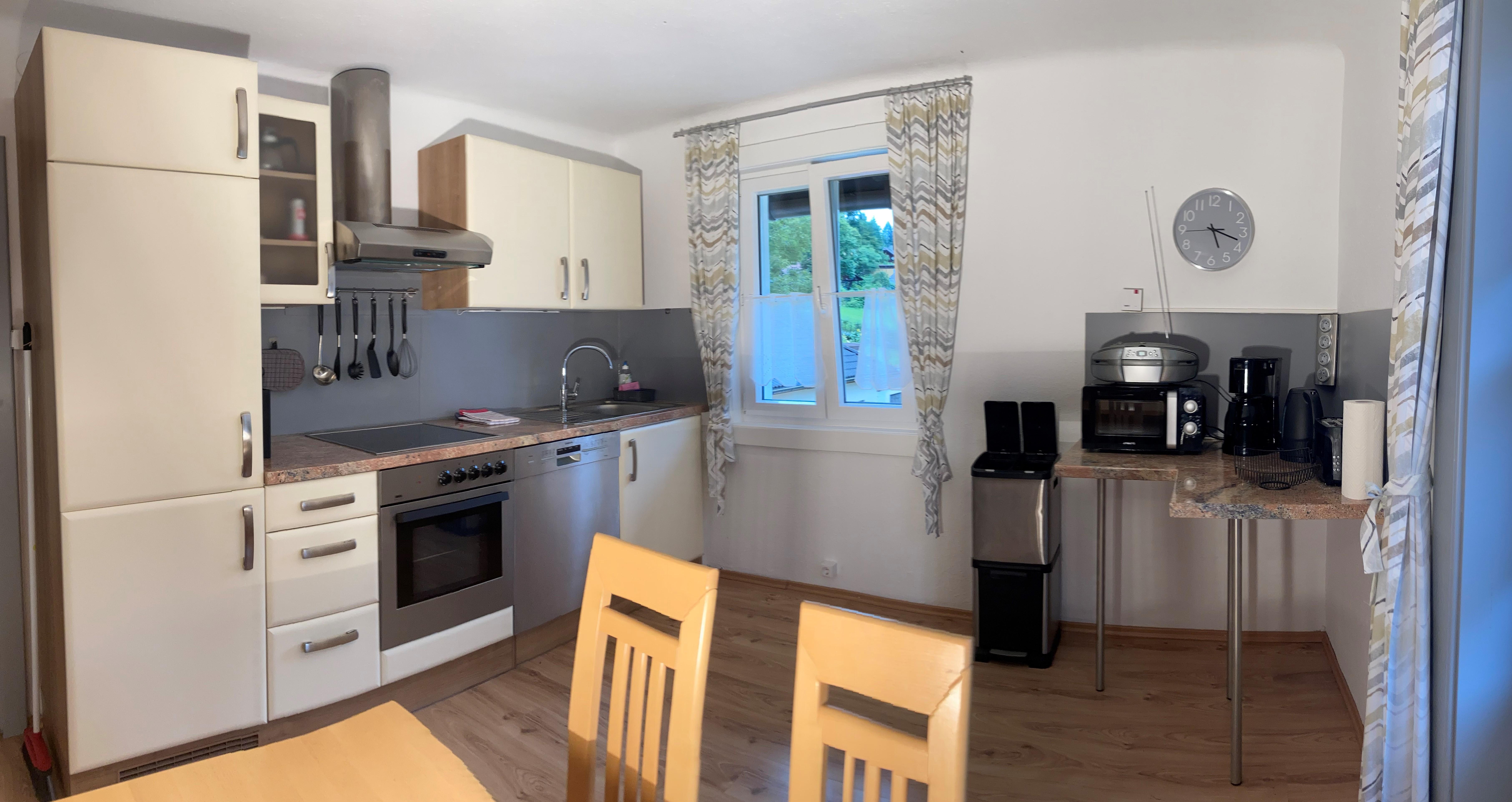 vollausgestattete Küche mit Geschirrspülmaschine, Kühl-/Gefrierschrank, Kaffeemaschine, Mikrowelle, Toaster, Wasserkocher.