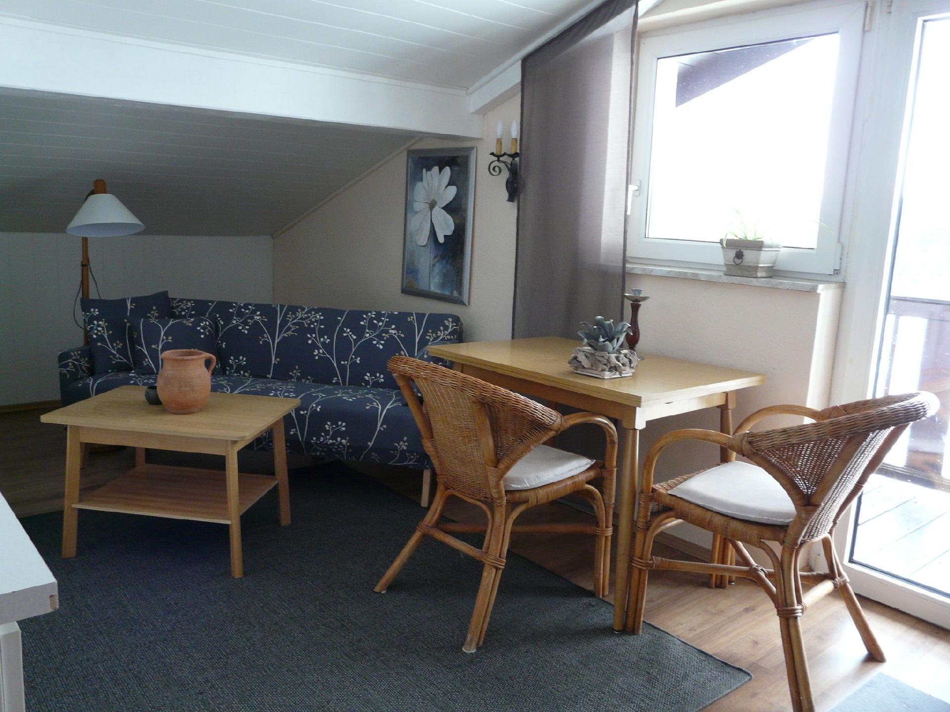 Es handelt sich um eine Ferienwohnung im Dachgeschoss. Es ist ein Schlafzimmer mit Doppelbett vorhanden . Ein Bad mit Toilette, Waschbecken und Dusche ist vorhanden. Der Wohn-Kochbereich ist seperat mit einer kleinen Einbauküche, Esstisch und Sofa sowie 2 Schwingersesseln zum Fernsehschauen. Ebenso ist ein Balkon mit herrlicher Aussicht auf Österreich und bei entsprechendem Wetter, auf die Alpen vorhanden.