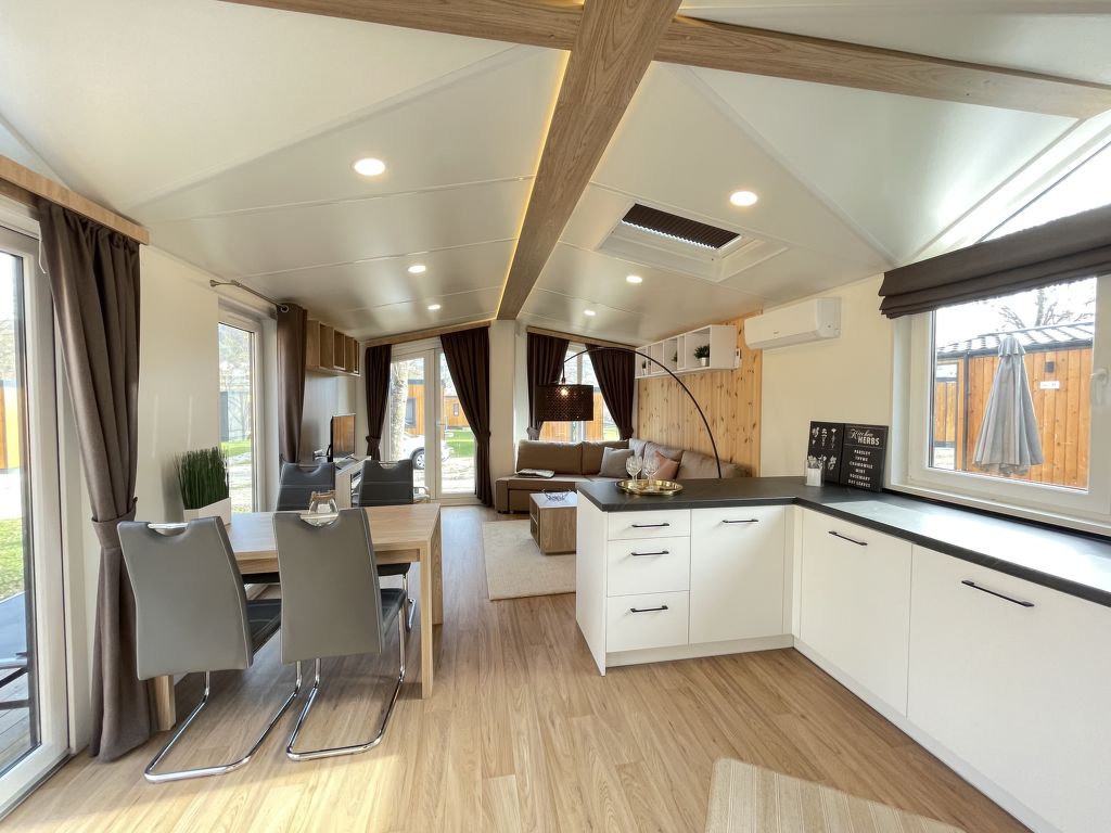 Tiny Haus Josef, 3-Zimmer-Mobilheim 48 m2. Komfortabel eingerichtet: Wohn-/Schlafzimmer mit 1 Doppeldiwanbett (160 cm, Länge 200 cm), Schwedenofen (nur Deko), Sat-TV und Klimaanlage. Ausgang zur Terrasse. 1 Zimmer mit 1 franz. Bett (160 cm, Länge 200 cm). 1 Zimmer mit 2 Betten (80 cm, Länge 200 cm). Offene Küche (Backofen, Geschirrspüler, 4 Glaskeramikplatten, Wasserkocher, elektrische Kaffeemaschine). Dusche, sep. WC. Kleine Terrasse. Terrassenmöbel. Zur Verfügung: Waschmaschine, Wäschetrockner. Parkplatz in 50 m. Bitte beachten: Nichtraucher-Unterkunft.