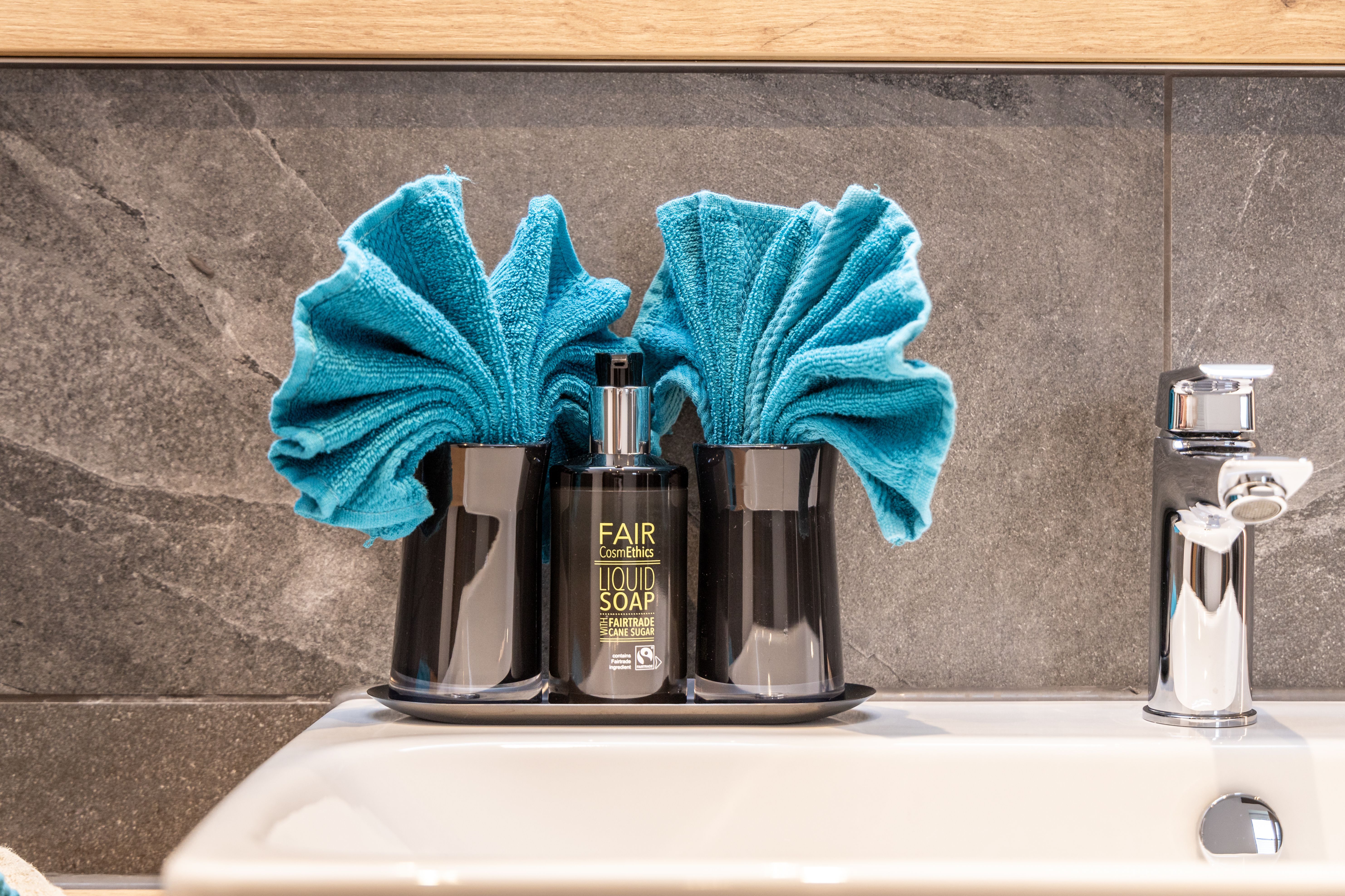 Die Wohnung verfügt über 2 Badezimmer, jeweils ausgestattet mit einer modernen Regendusche und hochwertigen Annehmlichkeiten wie Handtüchern, Kosmetikspiegel und einem Föhn. Zwei komplett ausgestattete Küchen ermöglichen eine flexible Selbstversorgung.