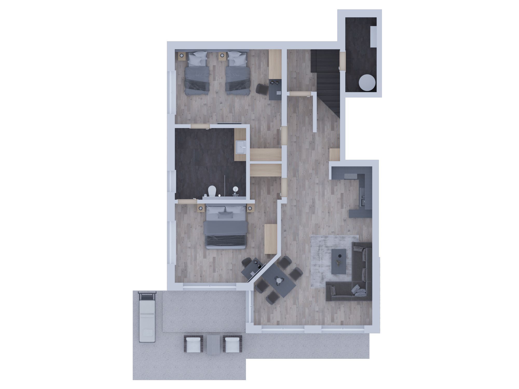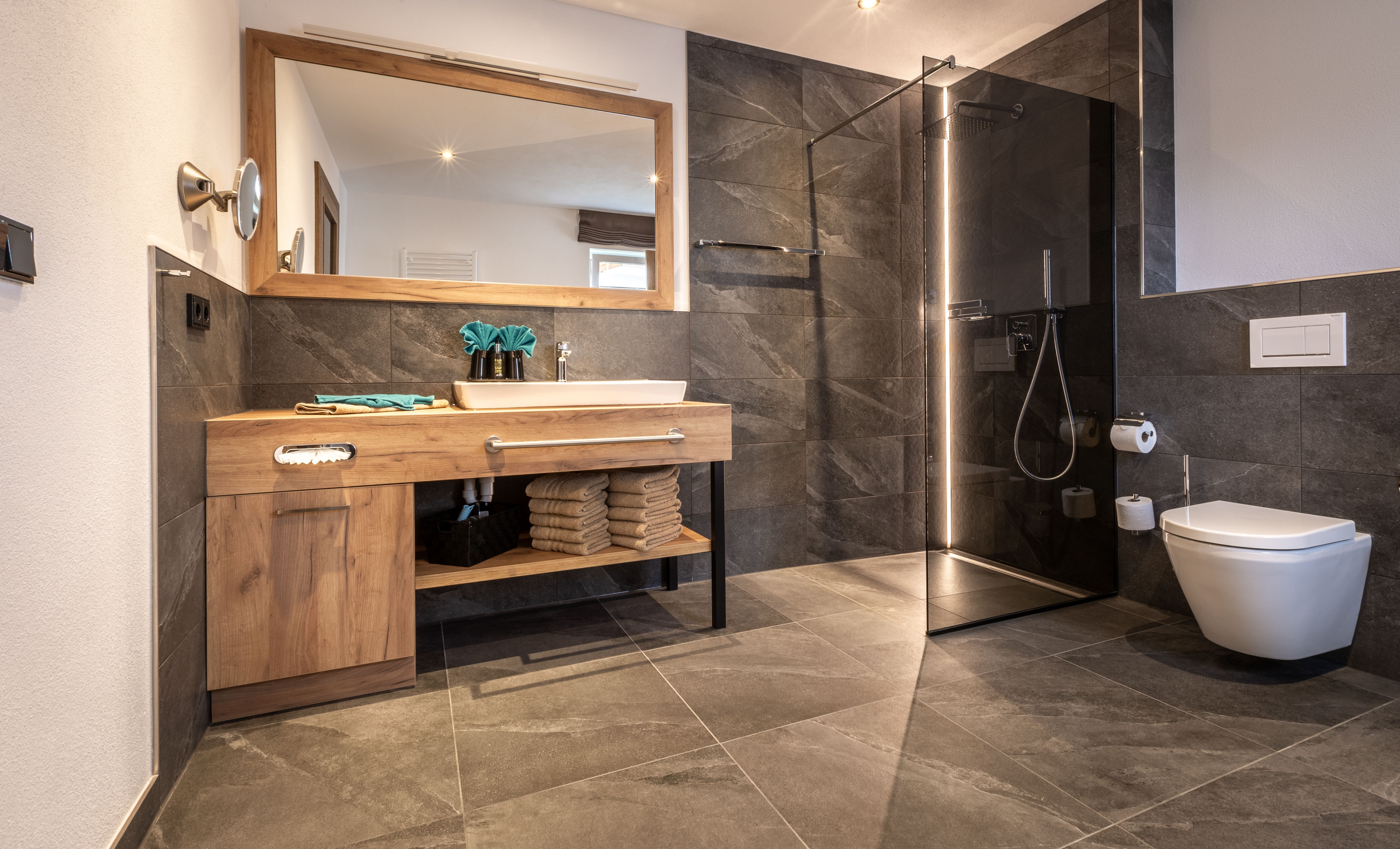 Mit effizient gestalteten Schlafzimmern mit zum Teil bodentiefen Fenstern und Boxspringbetten, modern gestalteten Bädern mit Regendusche, offen gehaltenem Flur, Wohn- und Essbereichen lässt es sich wunderbar entspannen und dem Alltag entfliehen. Unser dezentrales Lüftungssystem realisiert den geforderten Luftwechsel und sorgt für einen behaglichen und gesunden Luftumtausch in allen Appartements. Alle Appartements sind mit WLAN und TV-Flatscreen in allen Wohn- und Schlafzimmern ausgestattet und über einen Personenaufzug von der Tiefgarage bis zum Dachgeschoss erreichbar.