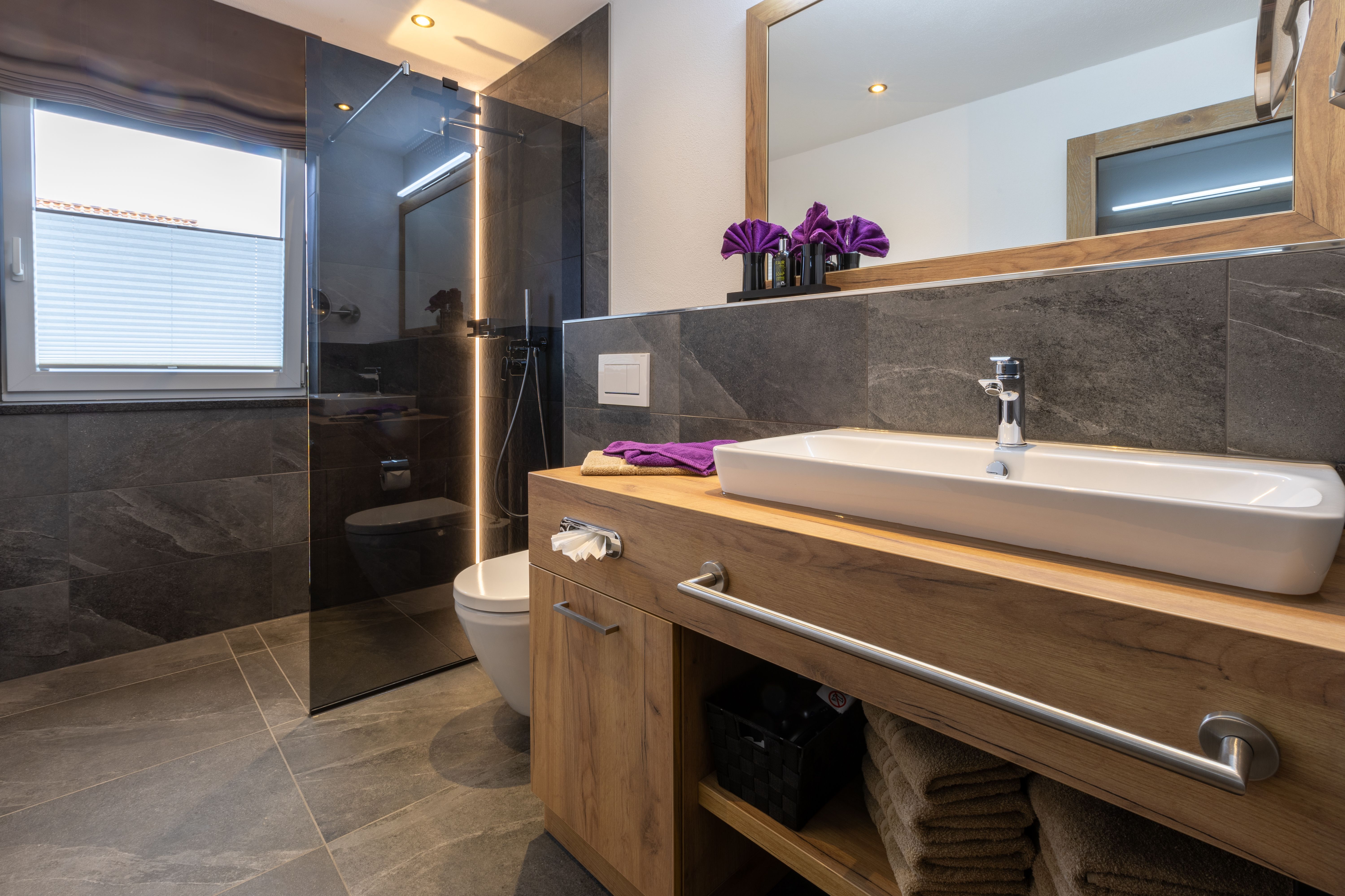 Mit effizient gestalteten Schlafzimmern mit zum Teil bodentiefen Fenstern und Boxspringbetten, modern gestalteten Bädern mit Regendusche, offen gehaltenem Flur, Wohn- und Essbereichen lässt es sich wunderbar entspannen und dem Alltag entfliehen. Unser dezentrales Lüftungssystem realisiert den geforderten Luftwechsel und sorgt für einen behaglichen und gesunden Luftumtausch in allen Appartements. Alle Appartements sind mit WLAN und TV-Flatscreen in allen Wohn- und Schlafzimmern ausgestattet und über einen Personenaufzug von der Tiefgarage bis zum Dachgeschoss erreichbar.