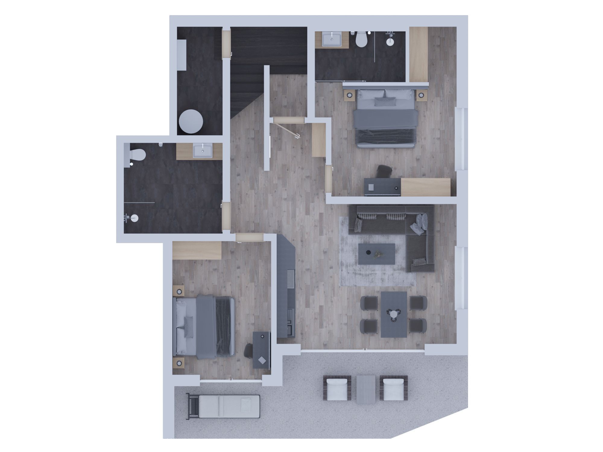 Die 3 Schlafzimmer sind mit komfortablen Boxspring-Doppelbetten ausgestattet, die für erholsame Nächte sorgen. Jedes der 3 Badezimmer verfügt über eine moderne Regendusche, ein WC, einen Föhn sowie Handtücher und einen Kosmetikspiegel für Ihr Wohlbefinden.