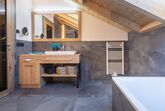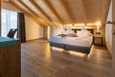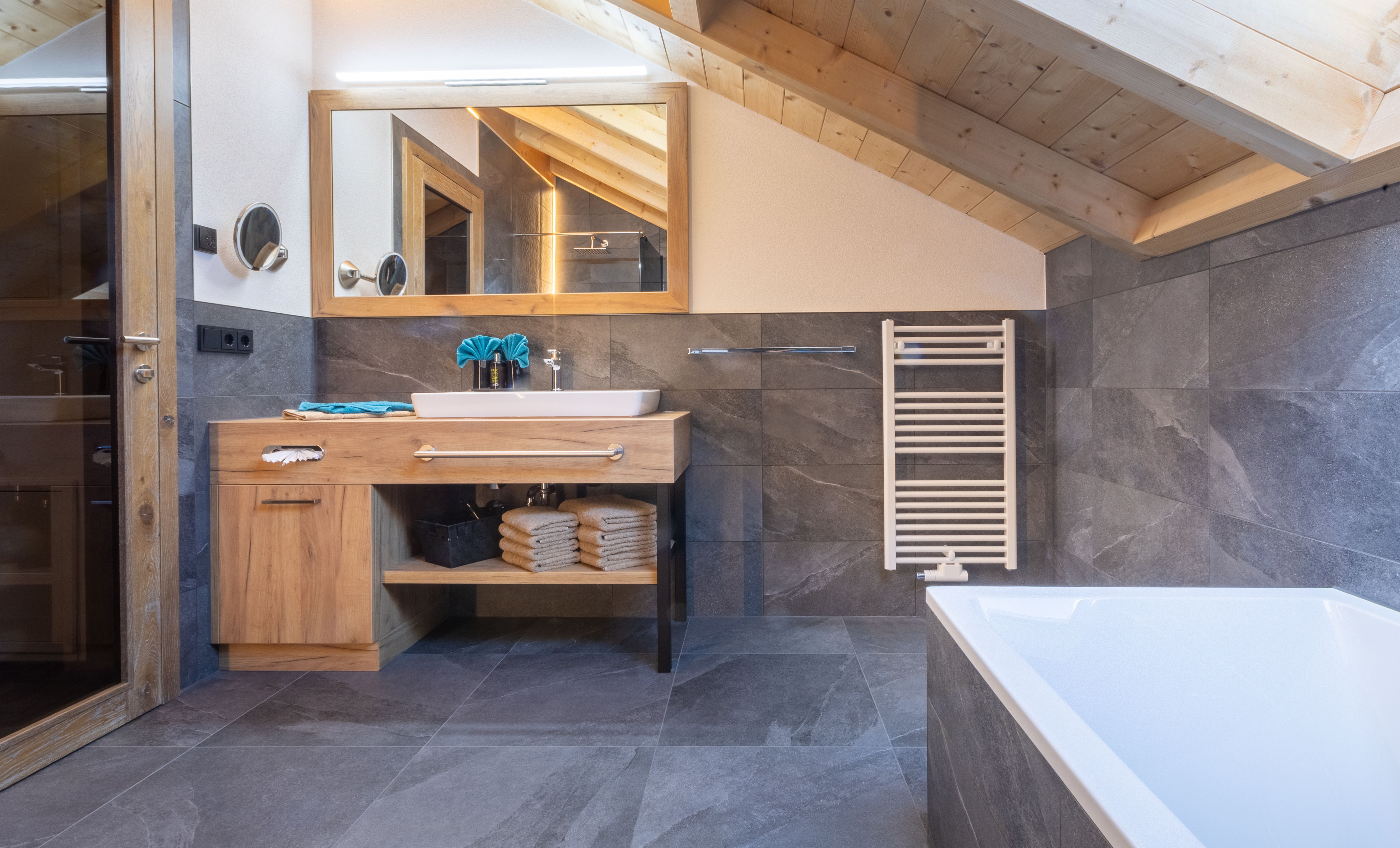 Das gemütliche Dreibettzimmer verfügt über komfortable Boxspringbetten, die für erholsame Nächte sorgen. Das Badezimmer ist luxuriös ausgestattet und bietet sowohl eine Badewanne als auch eine Regendusche sowie ein WC.